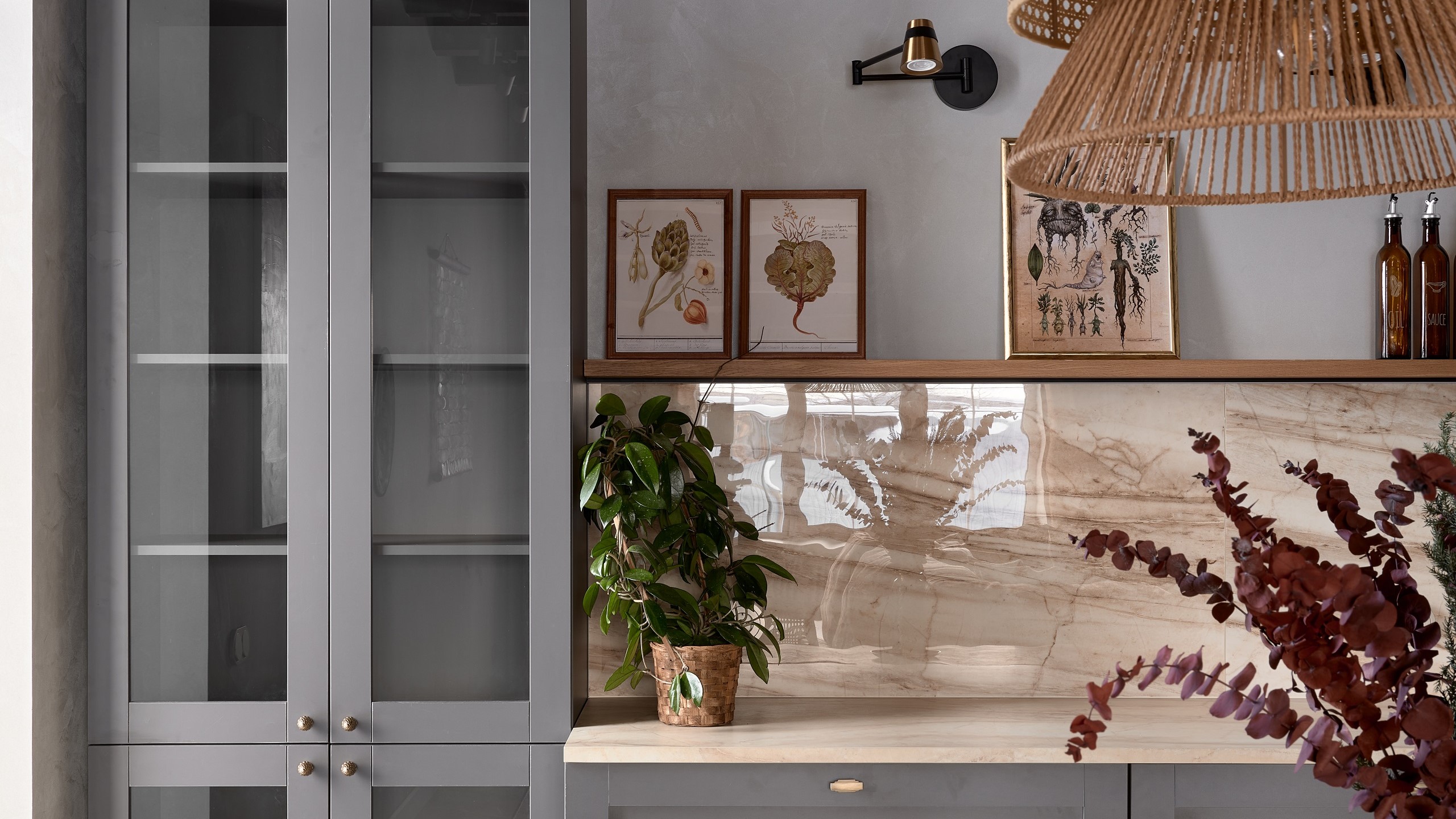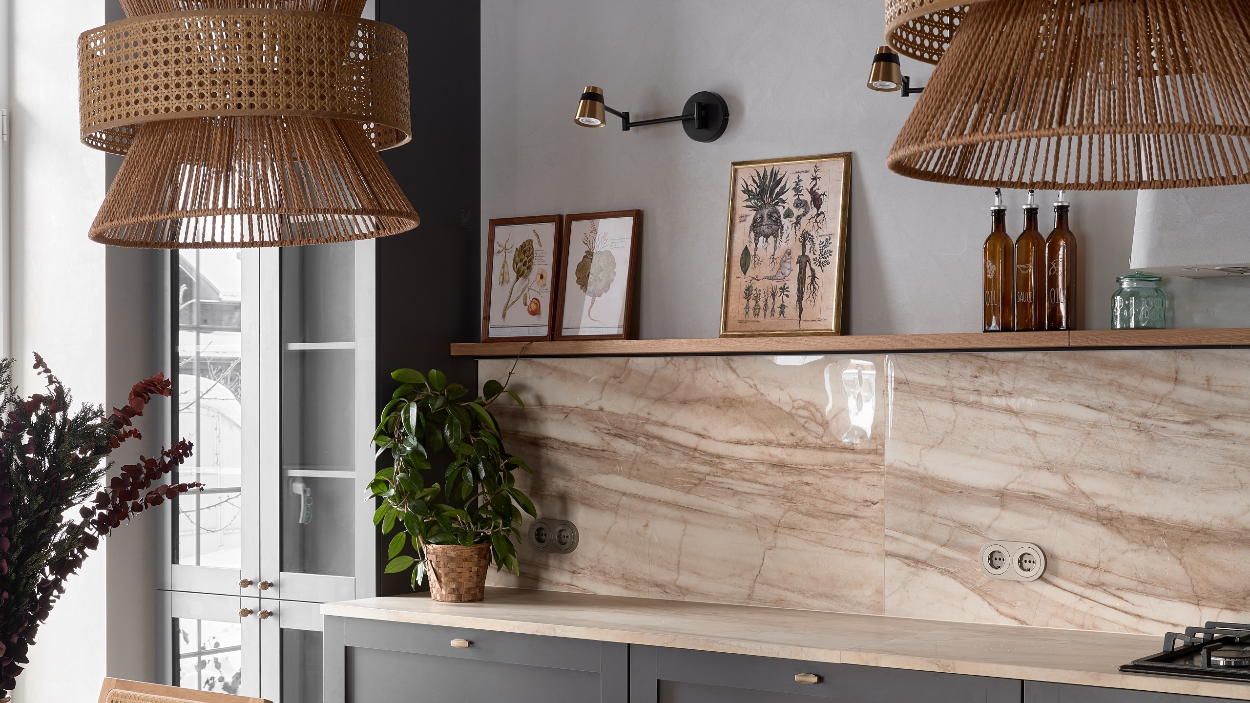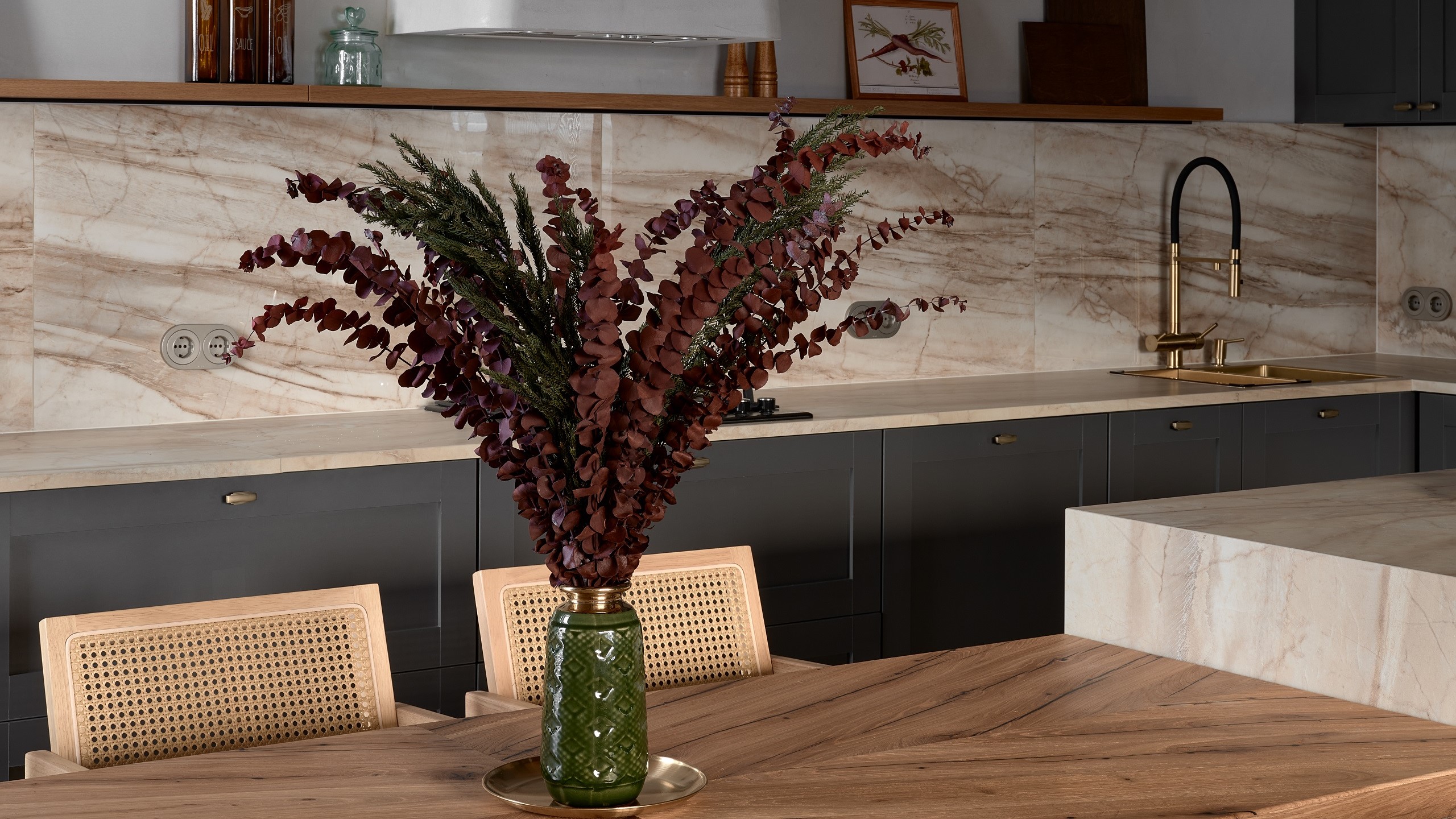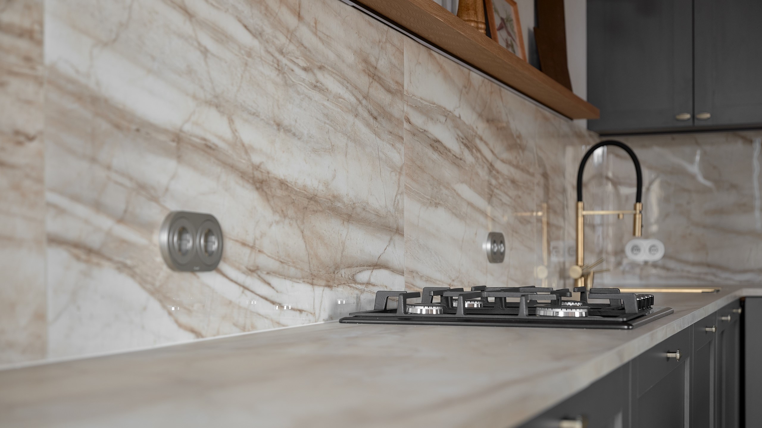 Фартук и остров выполнены из керамогранита Бернини — материала с выразительным, обволакивающим рисунком натурального мрамора. Его мягкий оттенок тонко поддерживает цветовую гамму кухни-гостиной, гармонируя с напольным покрытием и текстилем. Именно такие детали формируют цельный и завершённый образ.