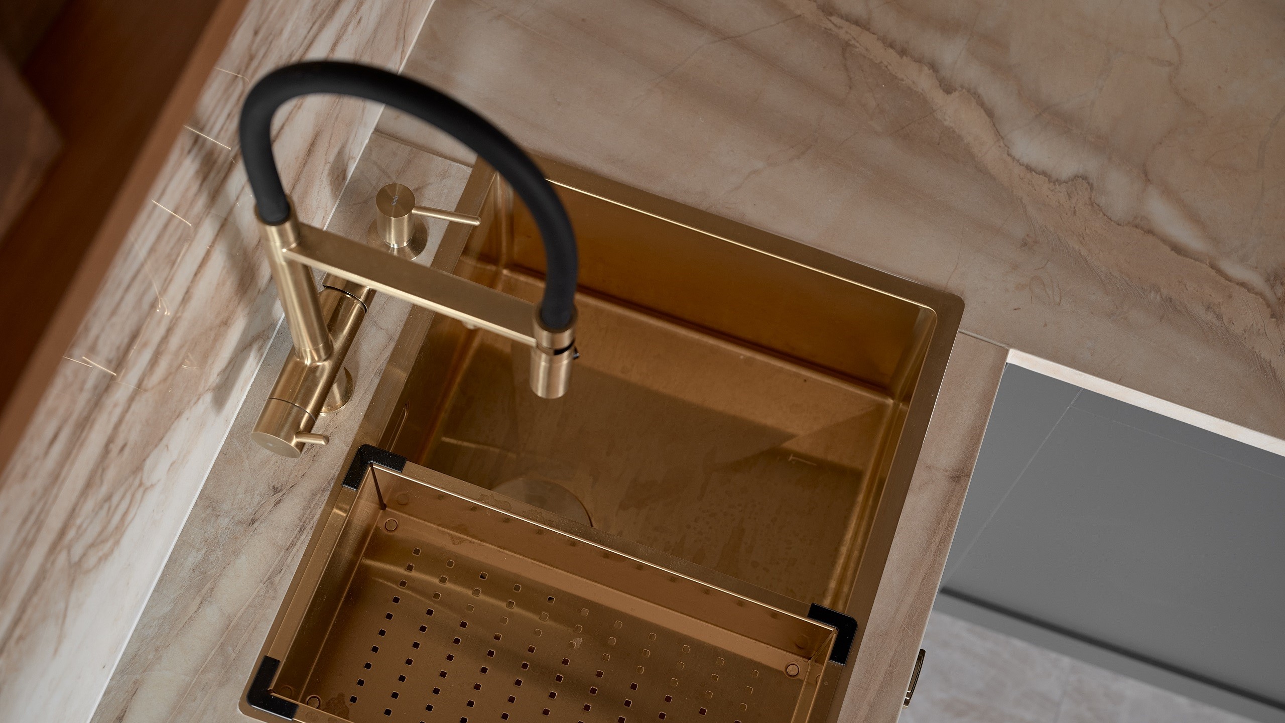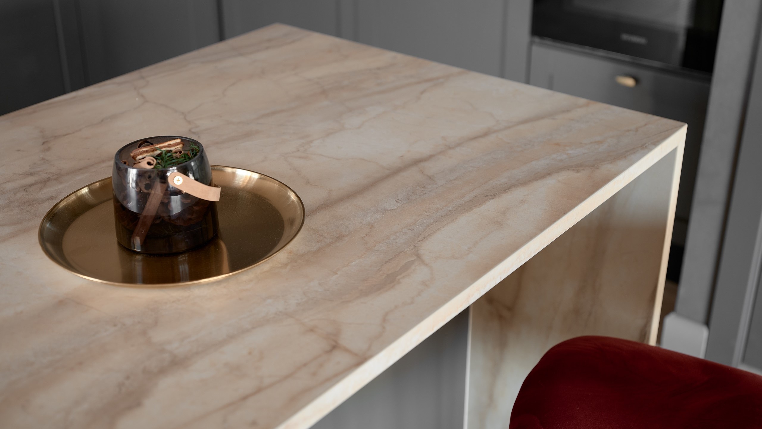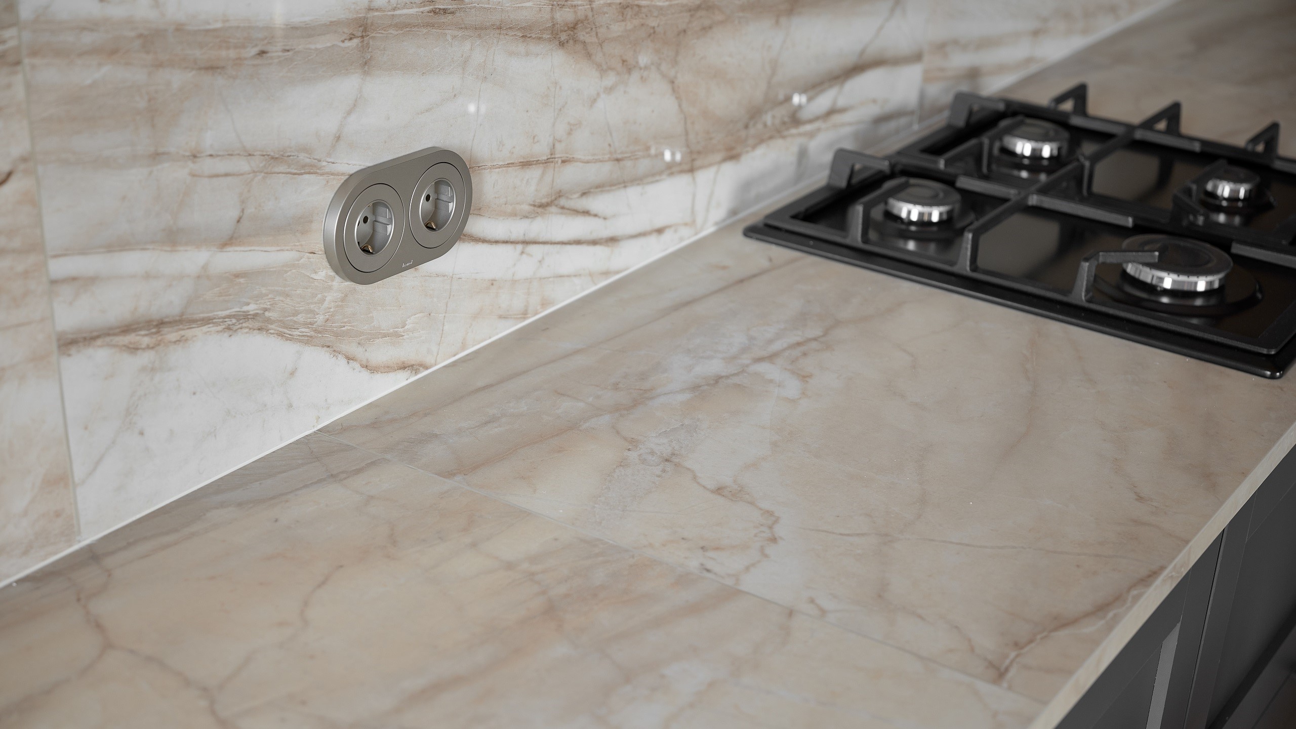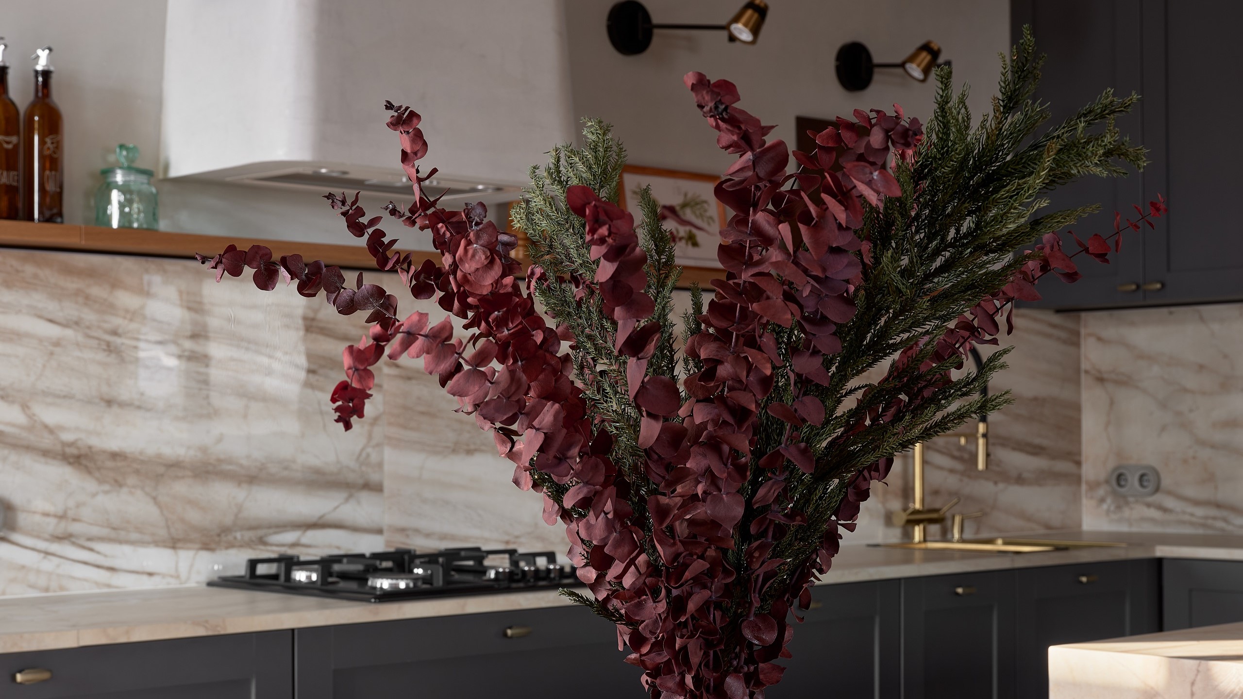 Фартук и остров выполнены из керамогранита Бернини — материала с выразительным, обволакивающим рисунком натурального мрамора. Его мягкий оттенок тонко поддерживает цветовую гамму кухни-гостиной, гармонируя с напольным покрытием и текстилем. Именно такие детали формируют цельный и завершённый образ.