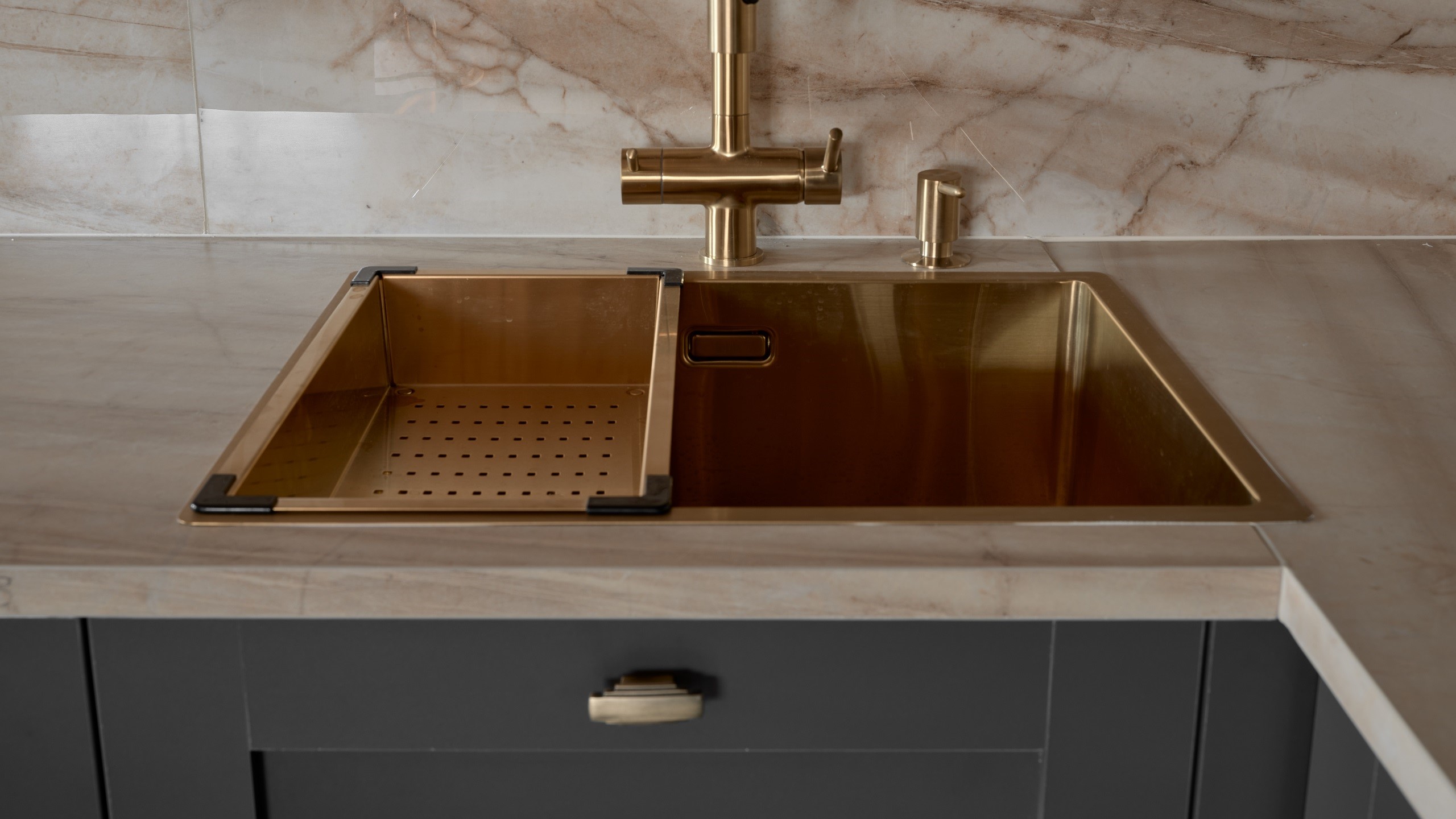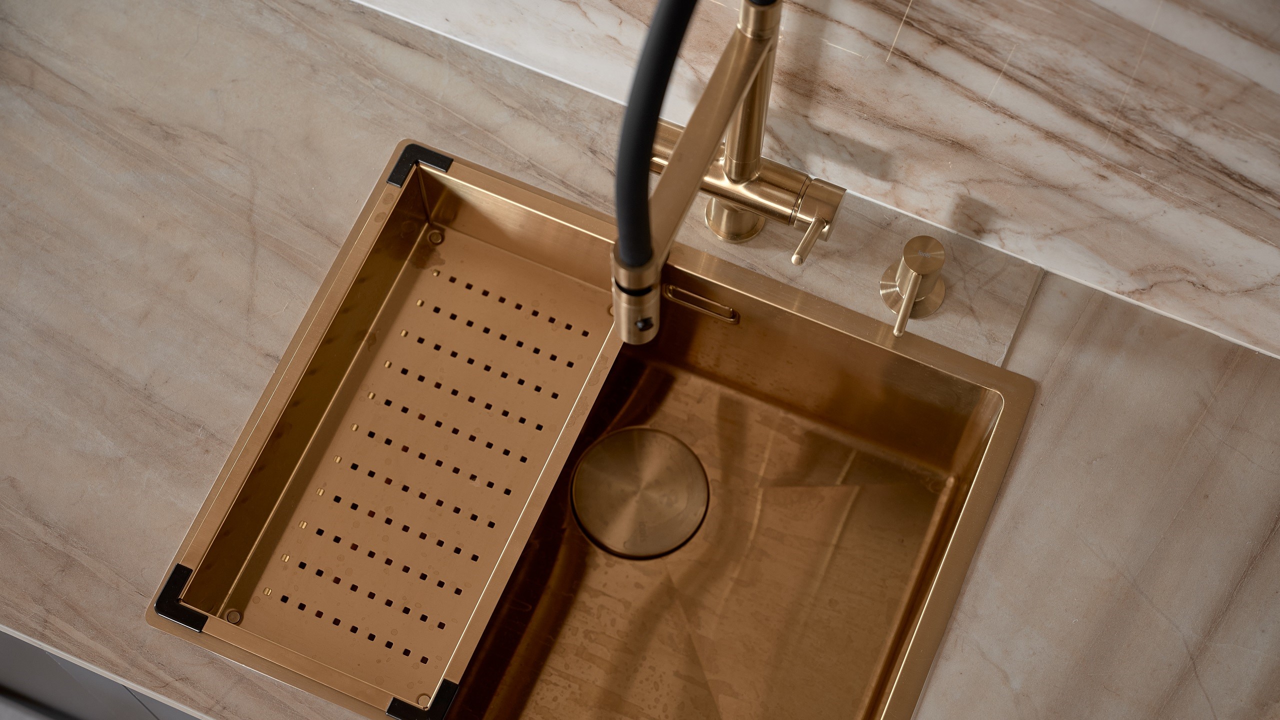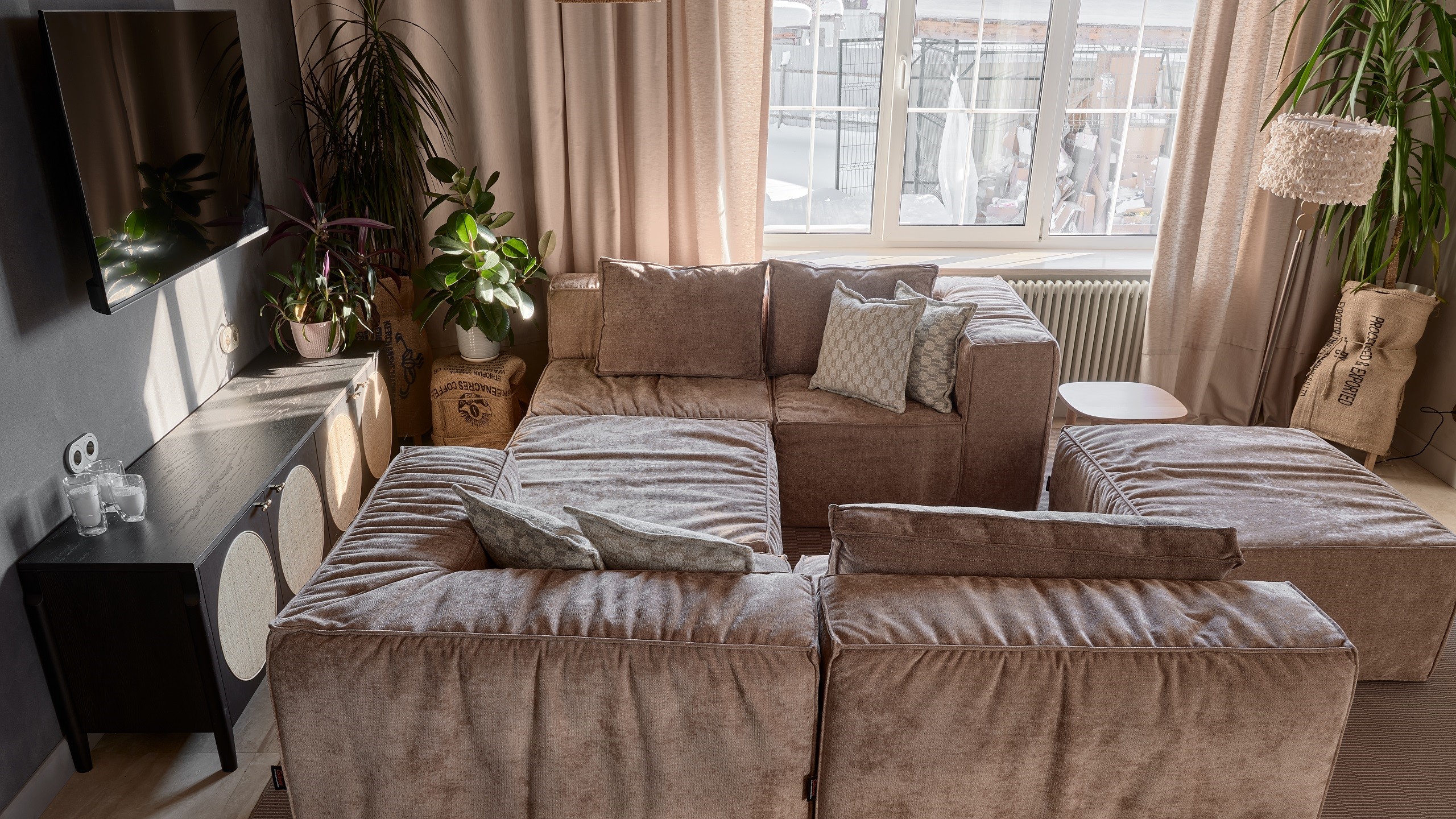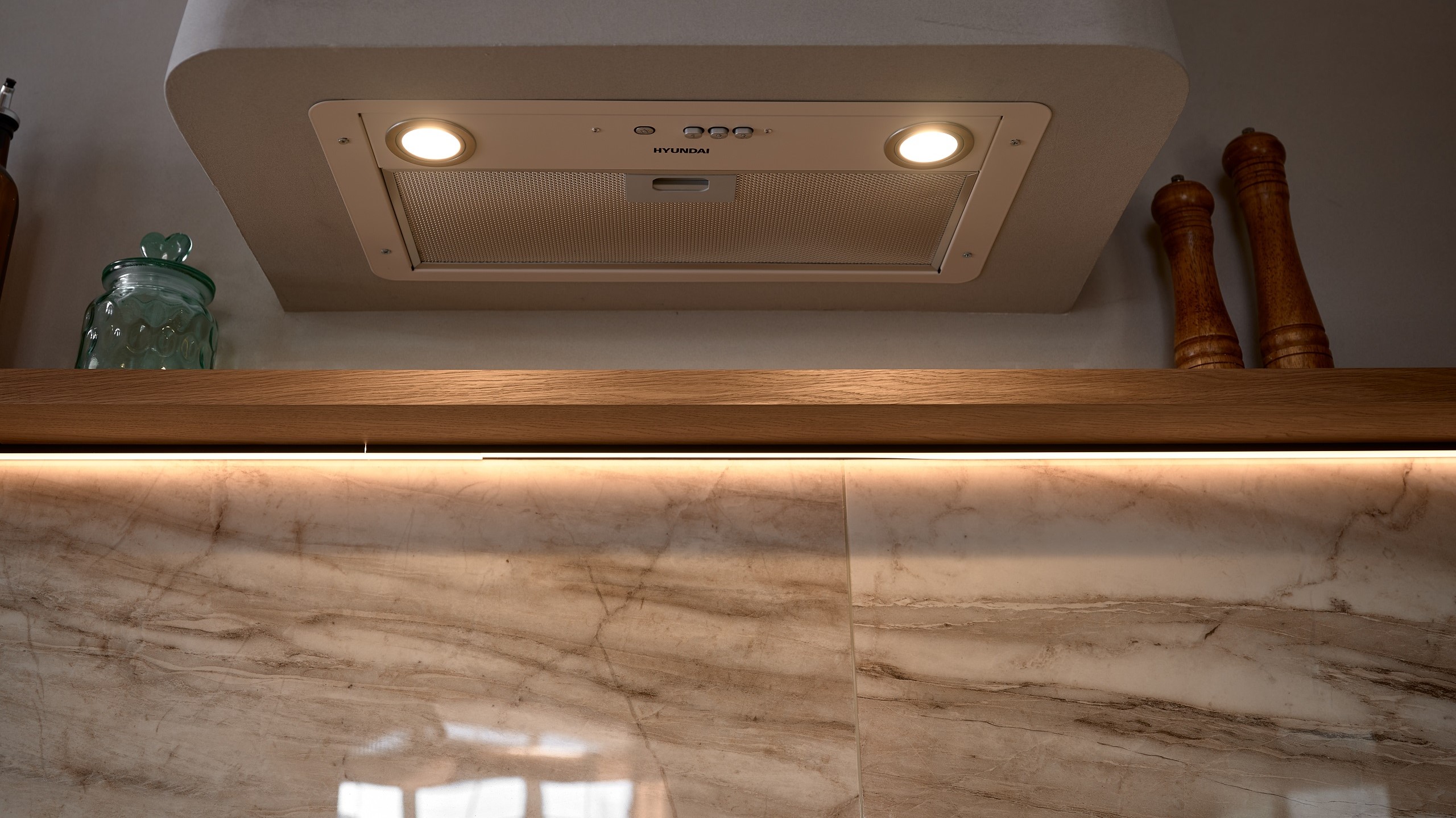 Фартук и остров выполнены из керамогранита Бернини — материала с выразительным, обволакивающим рисунком натурального мрамора. Его мягкий оттенок тонко поддерживает цветовую гамму кухни-гостиной, гармонируя с напольным покрытием и текстилем. Именно такие детали формируют цельный и завершённый образ.