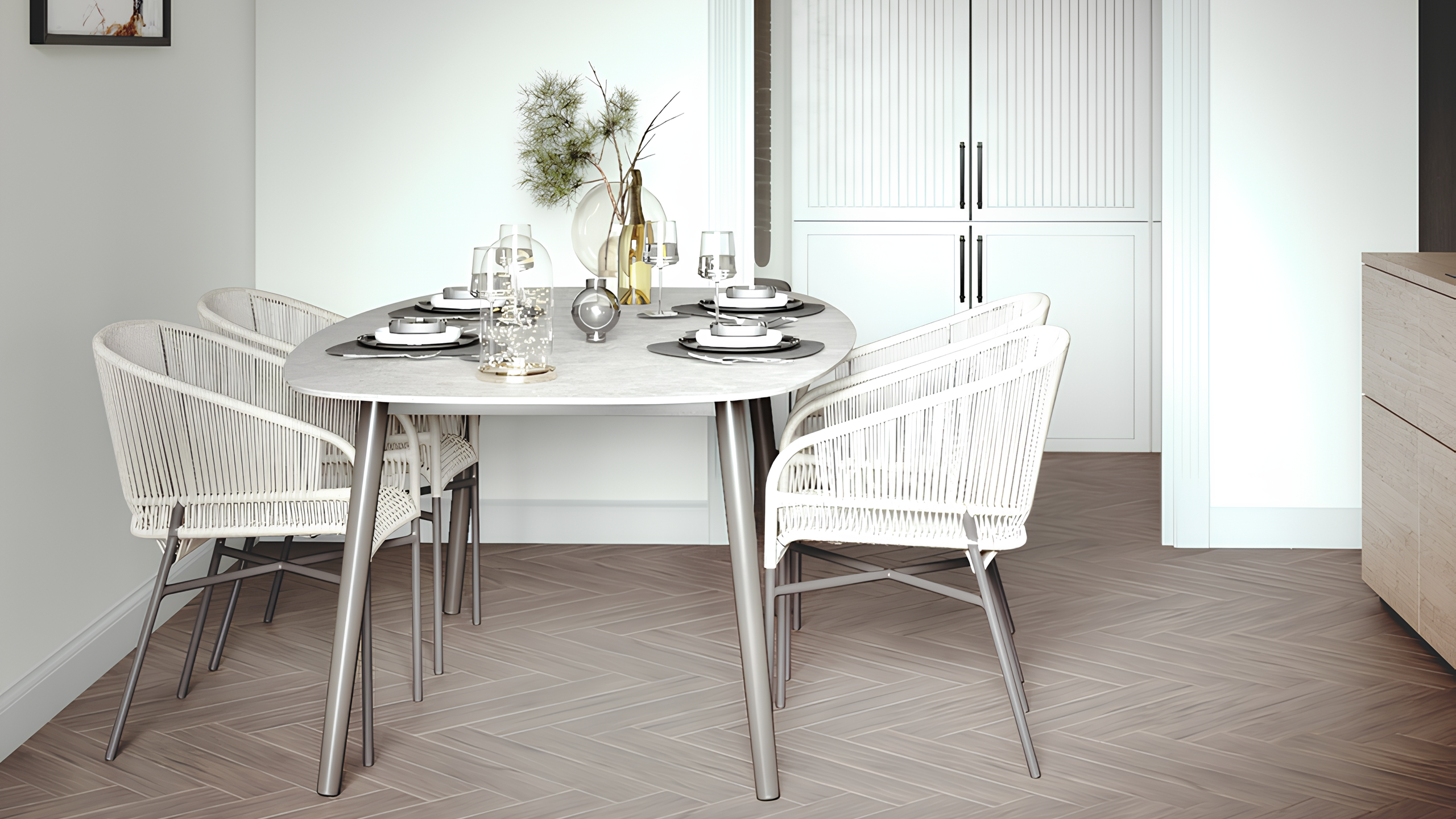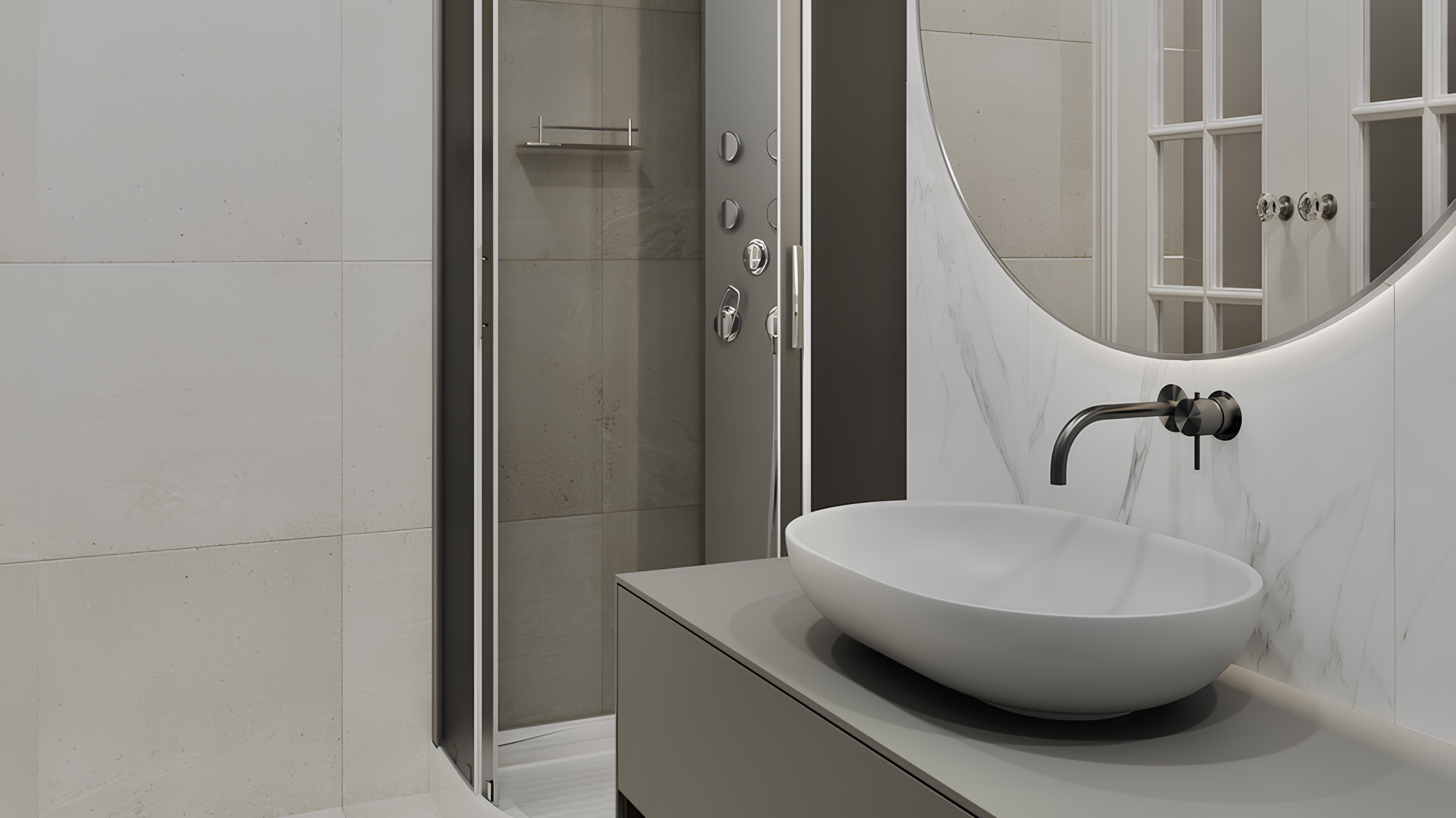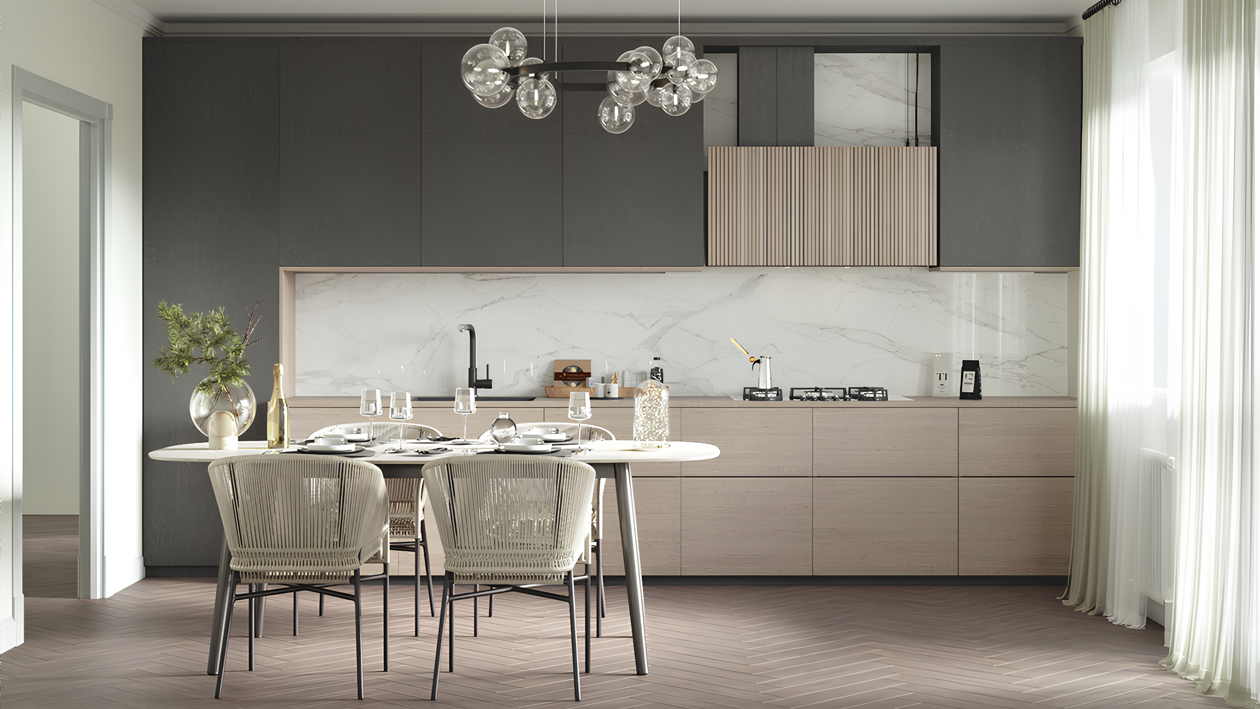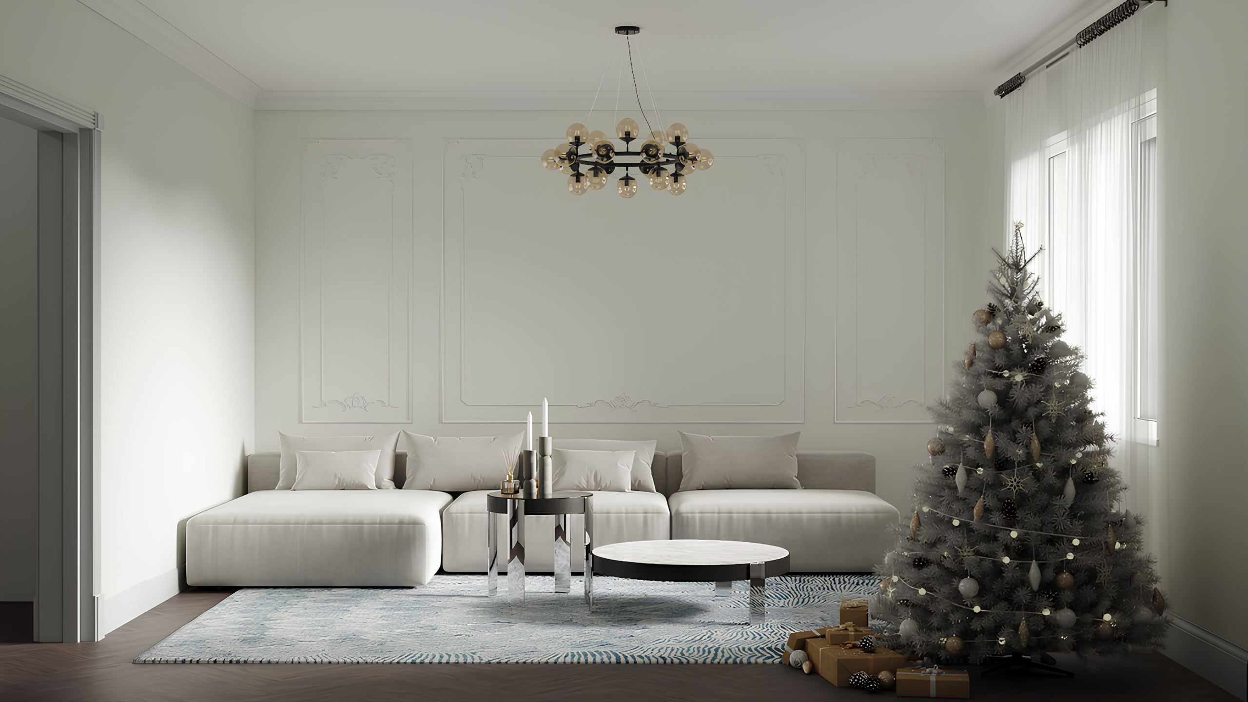 Этот интерьер — яркий представитель неоклассики, реализация современного представления о ней в дизайне жилого пространства. Это благородный и гибкий стиль, который украшает любое помещение независимо от его размера.