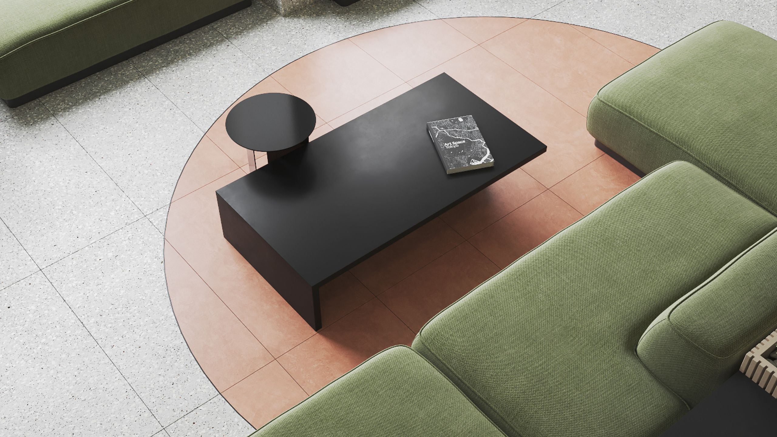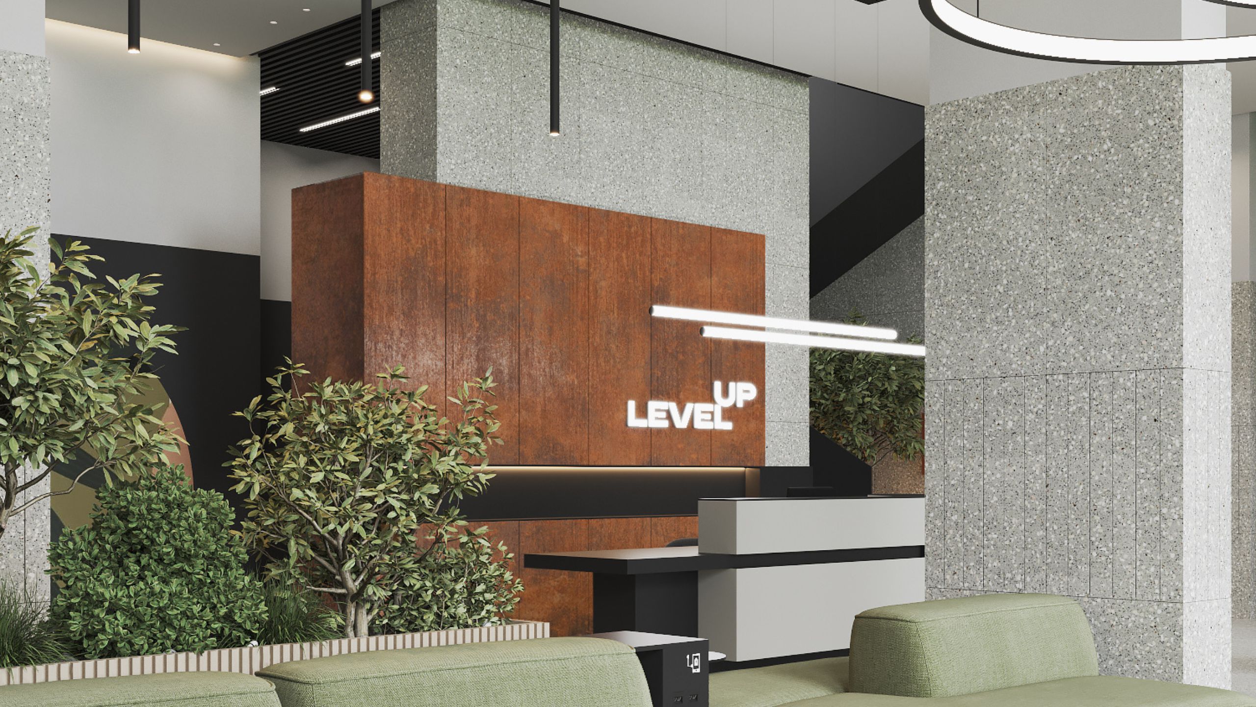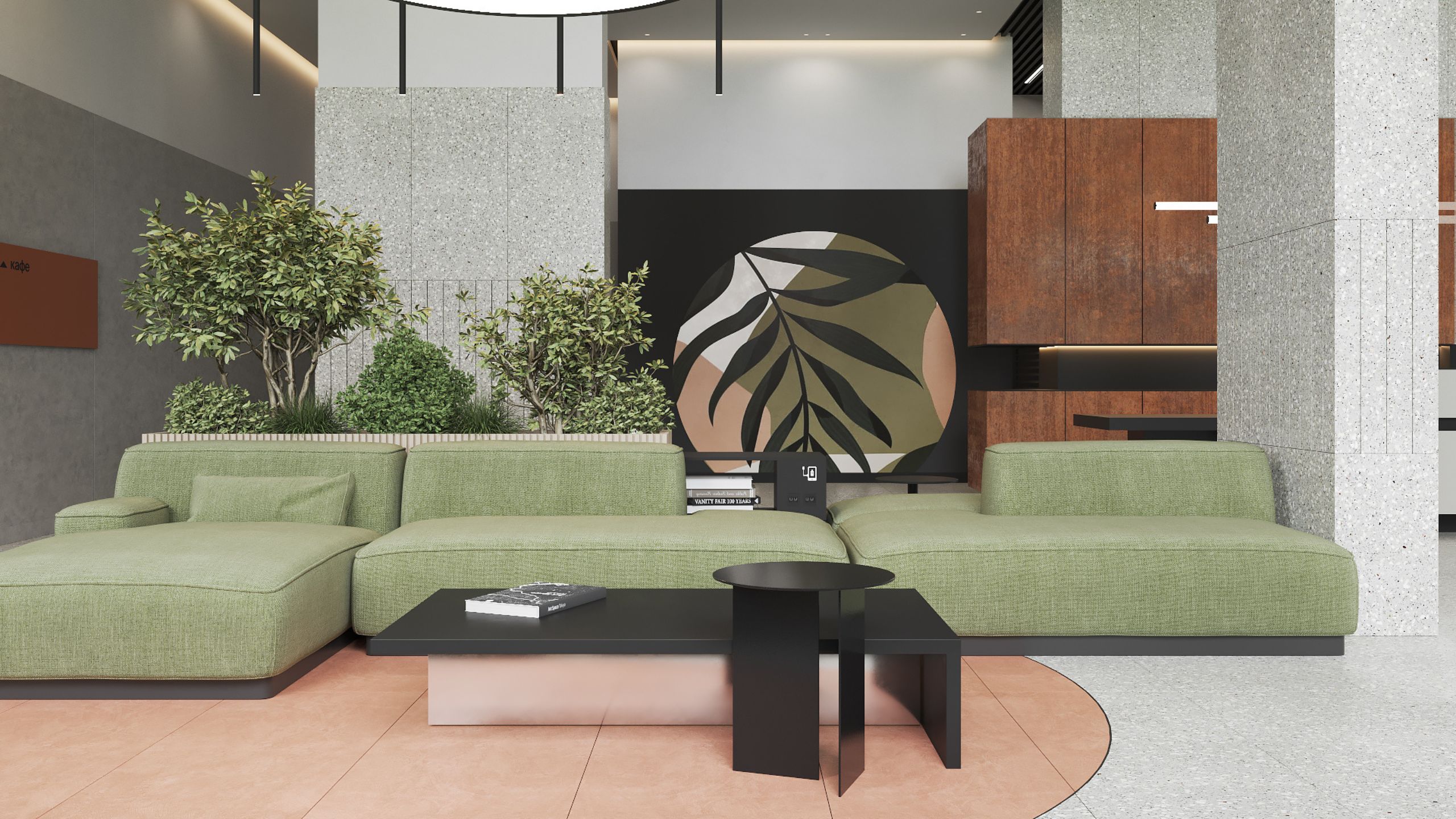 Сегодня мы показываем часть проекта — визуализацию лобби. Интерьер выполнен из экологичных материалов, в том числе из керамогранита, которым выложены пол и стены. Для этого дизайнер использовал две коллекции: Cosmos и Spectrum. Лососевый цвет — яркий акцент во всей композиции, который разбавляет монолитную отделку стен и пола.