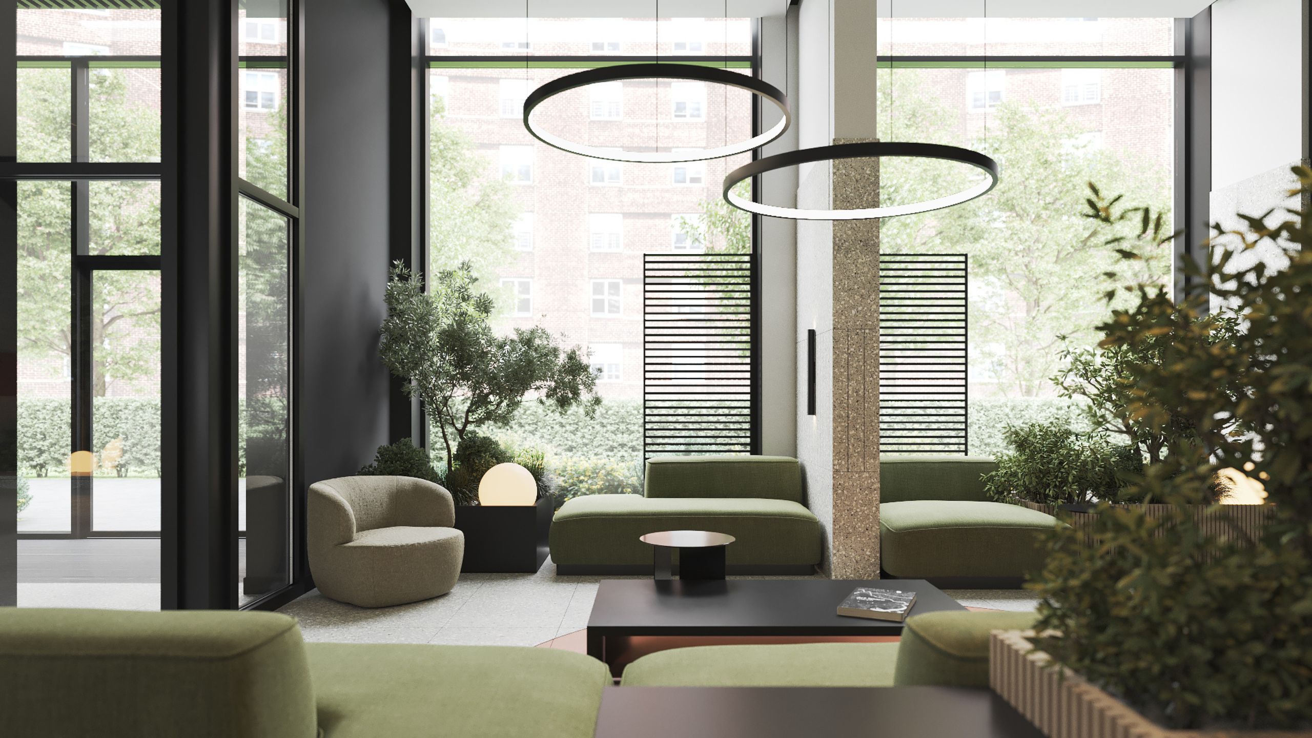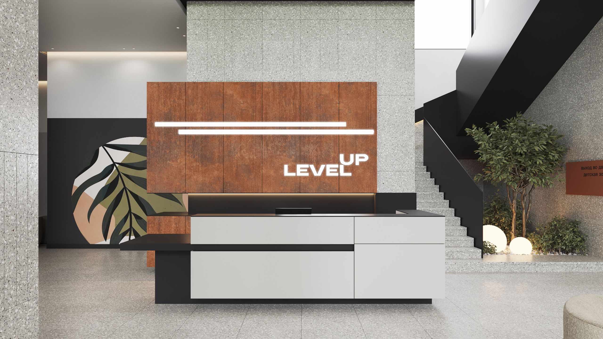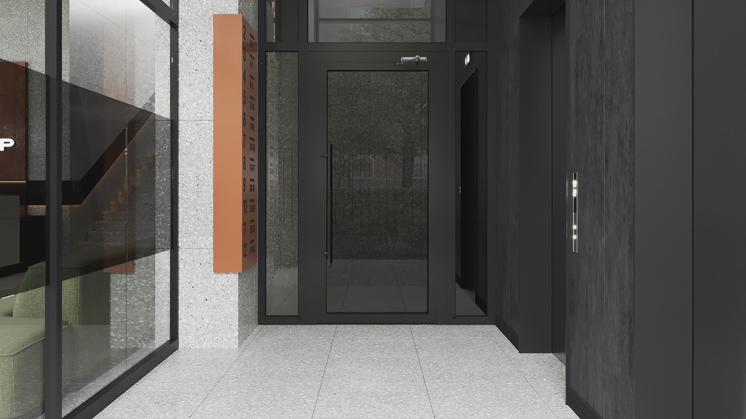Сегодня мы показываем часть проекта — визуализацию лобби. Интерьер выполнен из экологичных материалов, в том числе из керамогранита, которым выложены пол и стены. Для этого дизайнер использовал две коллекции: Cosmos и Spectrum. Лососевый цвет — яркий акцент во всей композиции, который разбавляет монолитную отделку стен и пола.