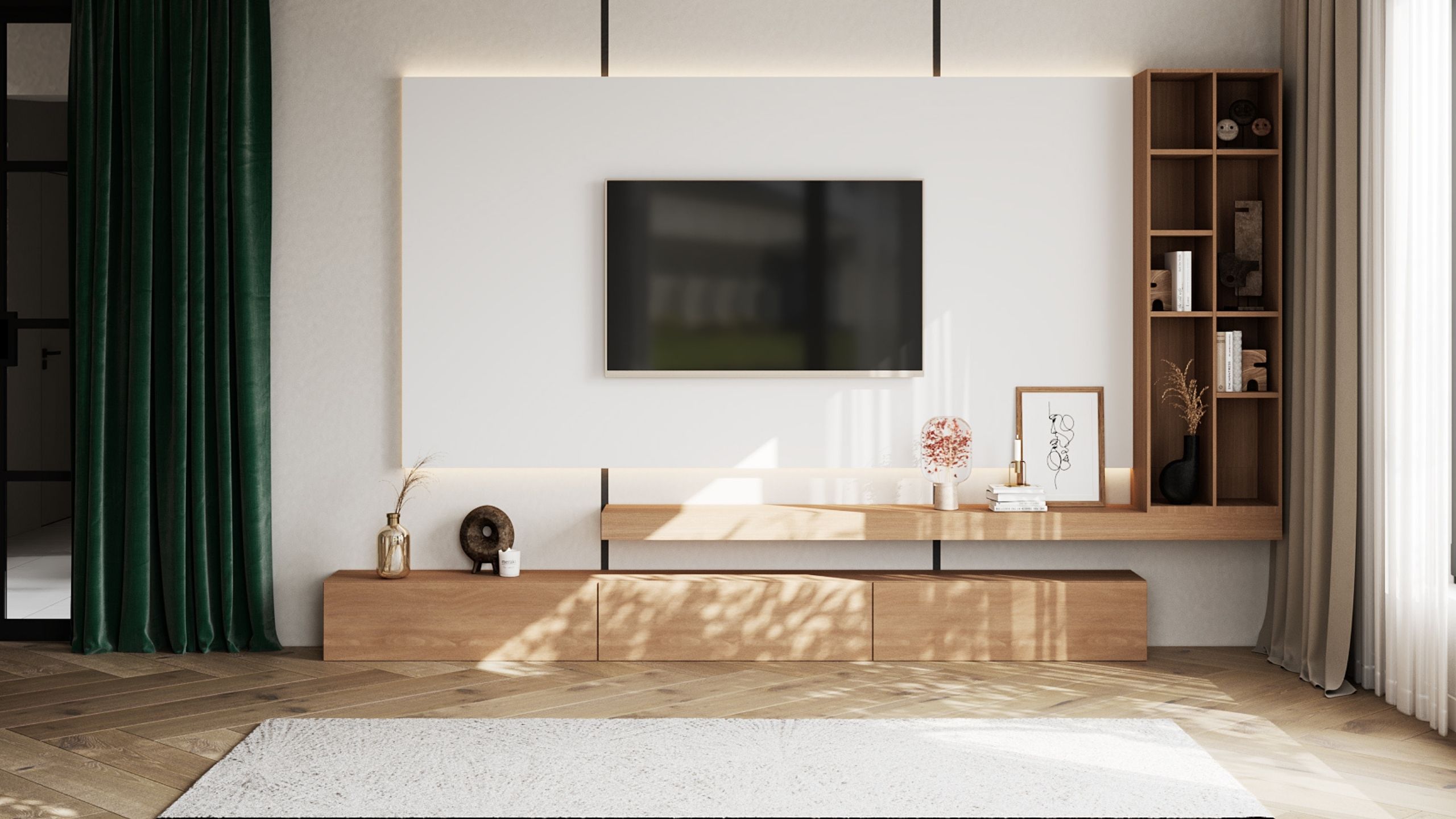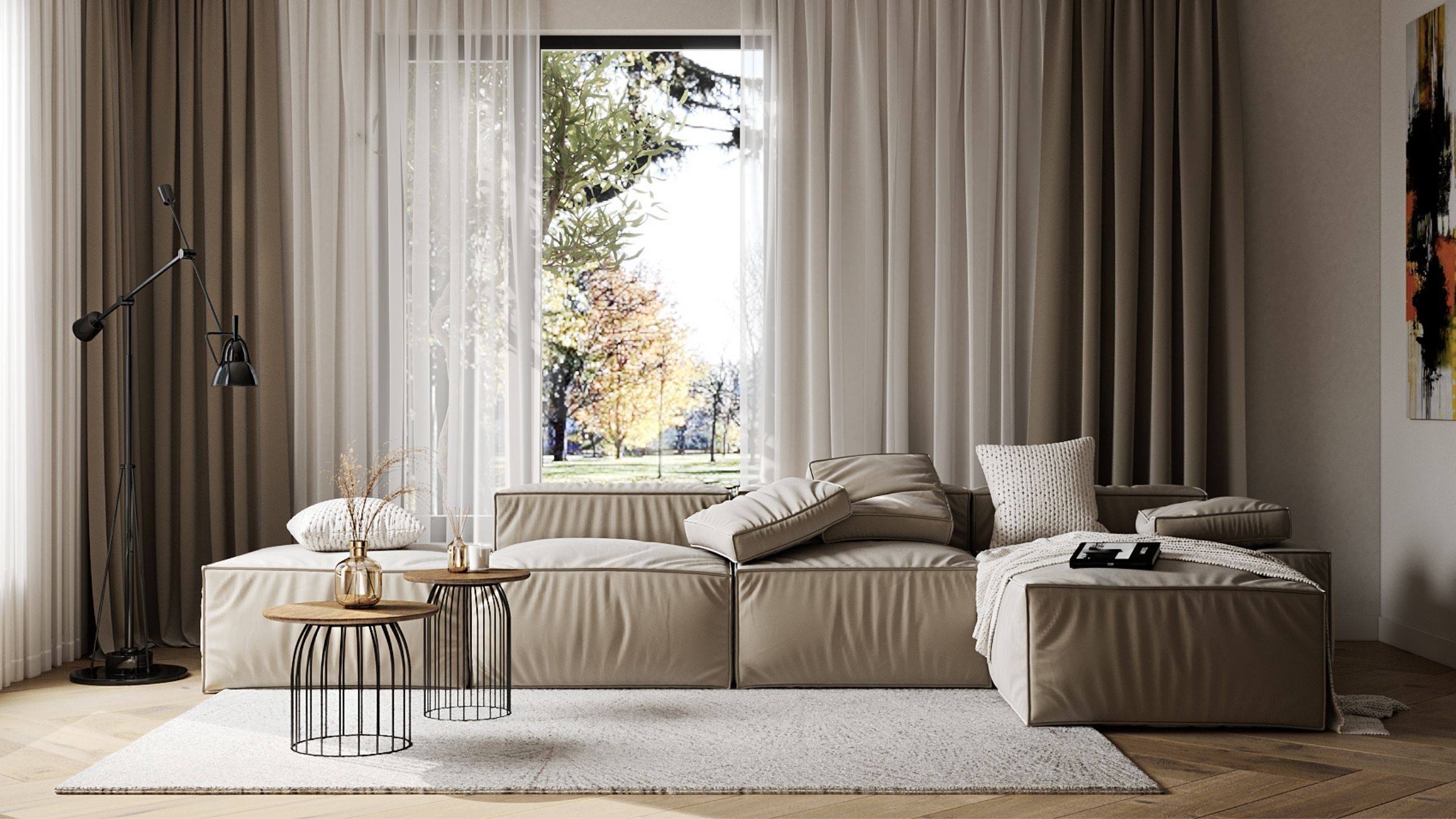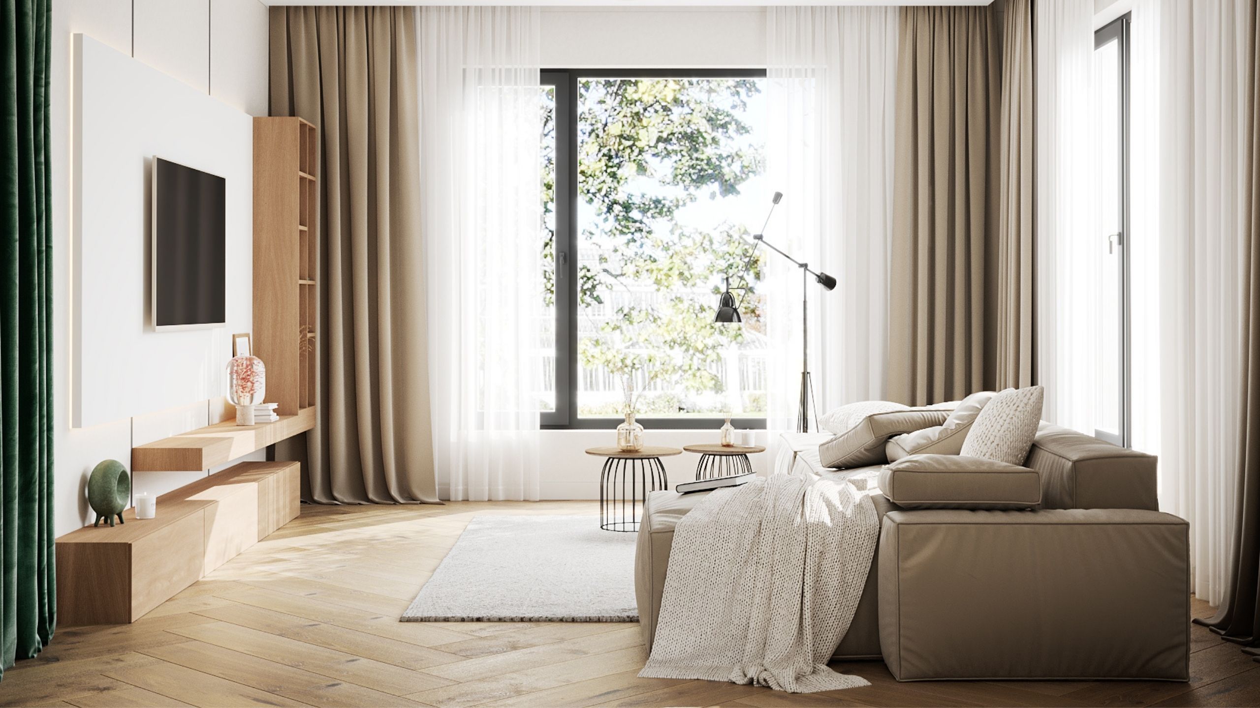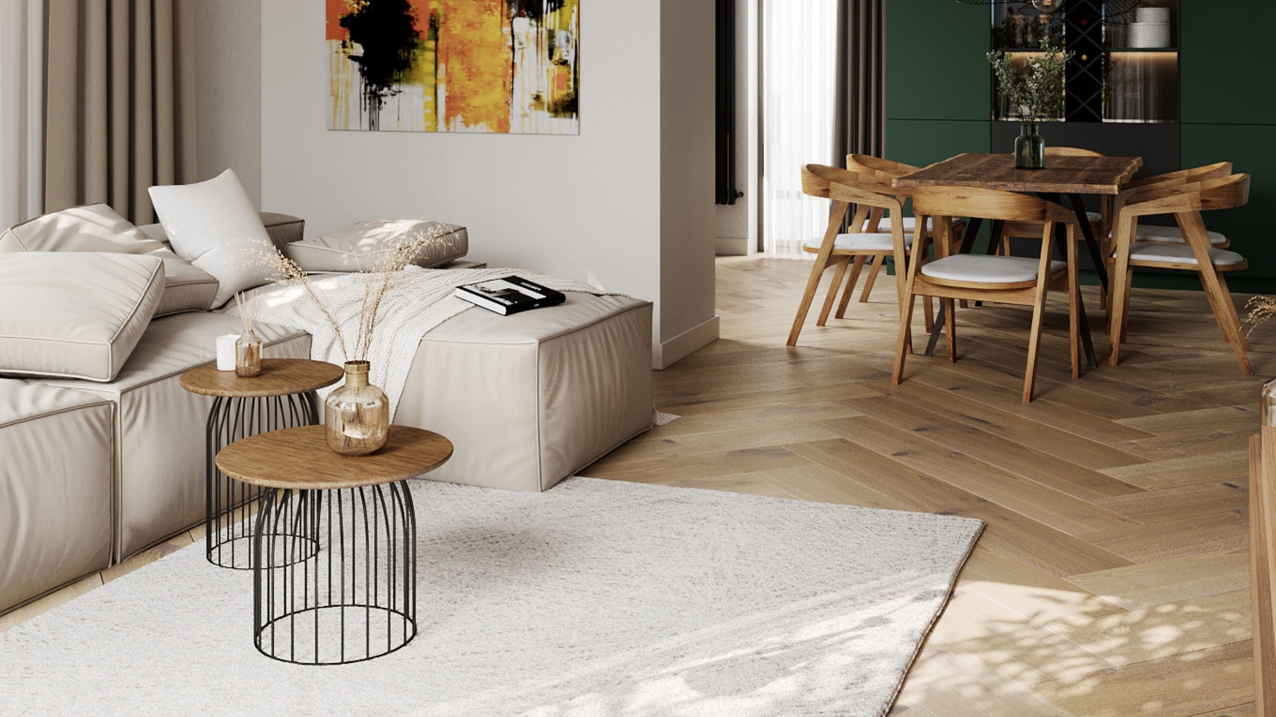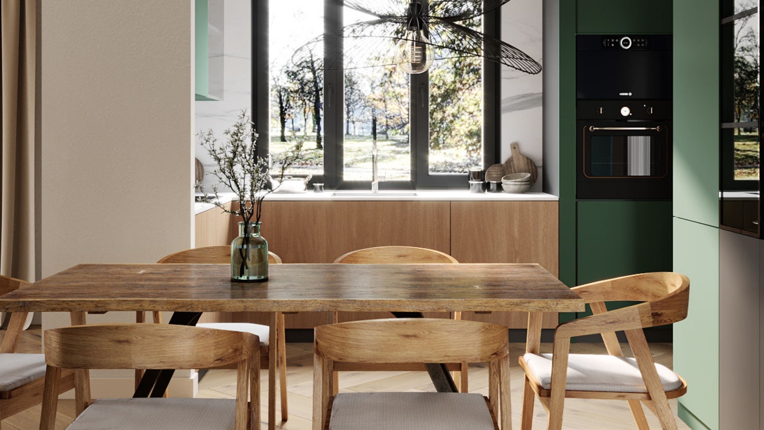 Для оформления интерьера дизайнер выбрала светлые, пыльные оттенки: бежевые, белые, серые. Так свет из панорамных окон лучше отражается от поверхностей, визуально расширяя комнату. Пол выложили керамическим гранитом с текстурой натурального дерева из коллекции Classic Wood. Прочный материал — актуальный выбор для комнаты на первом этаже с большой проходимостью. Рабочая зона кухни выделяется на фоне общего интерьера. Яркий изумрудный цвет в сочетании с нежным мрамором из коллекции Alba стали изюминкой целого пространства.