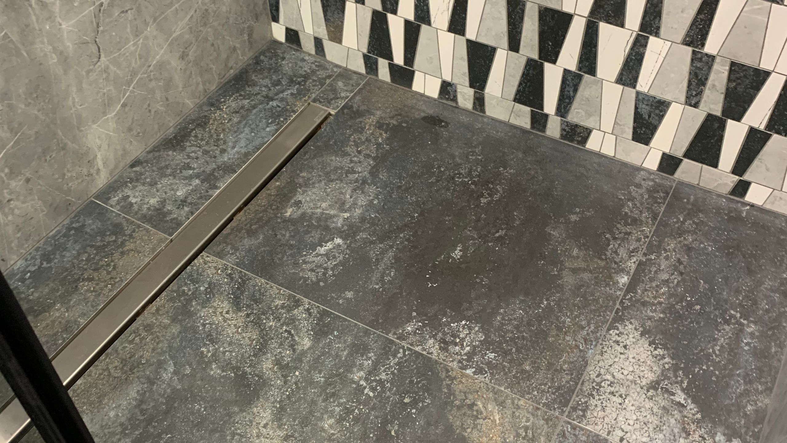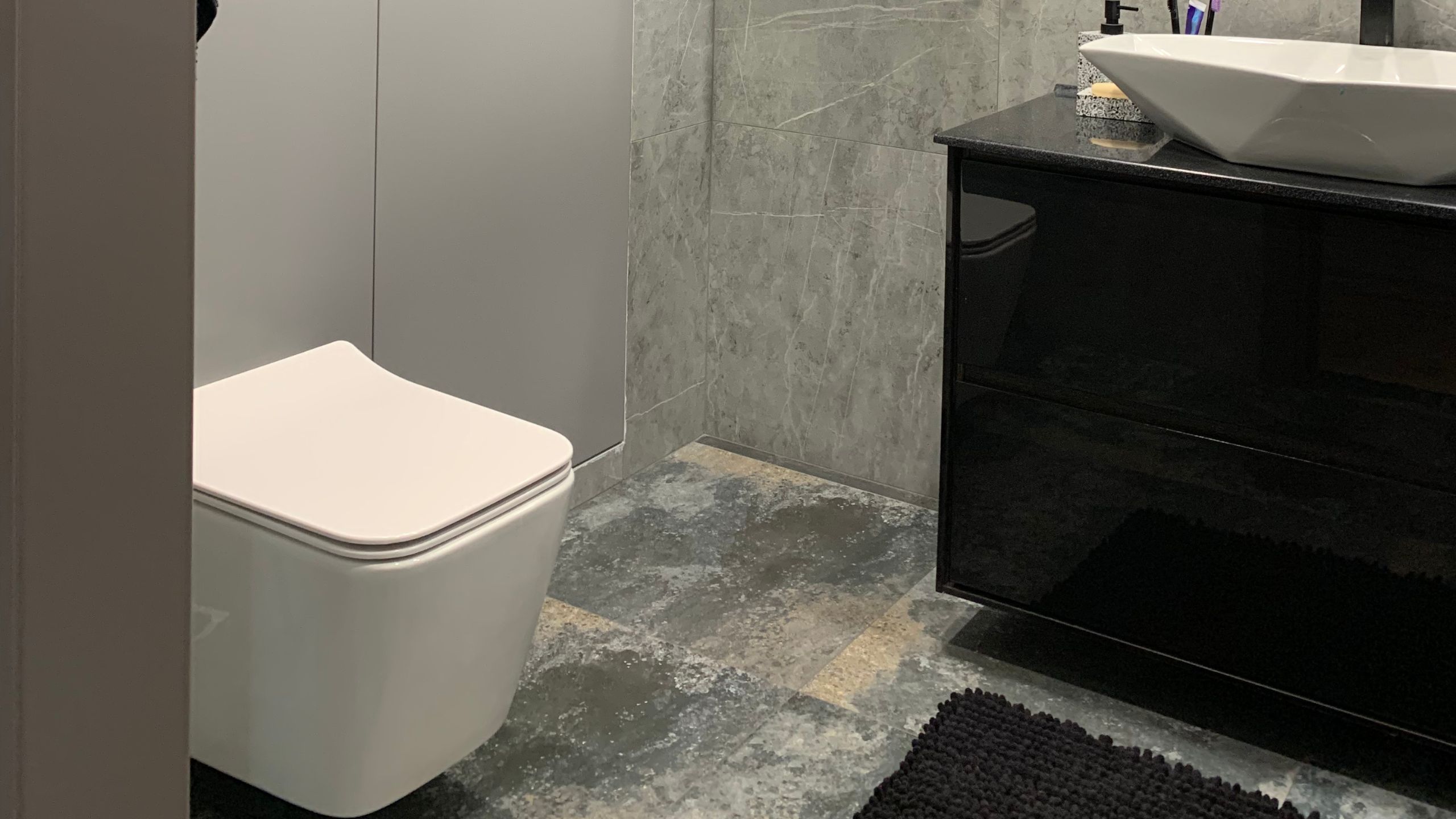 Мрамор и окисленный металл: пример сочетания в ванной