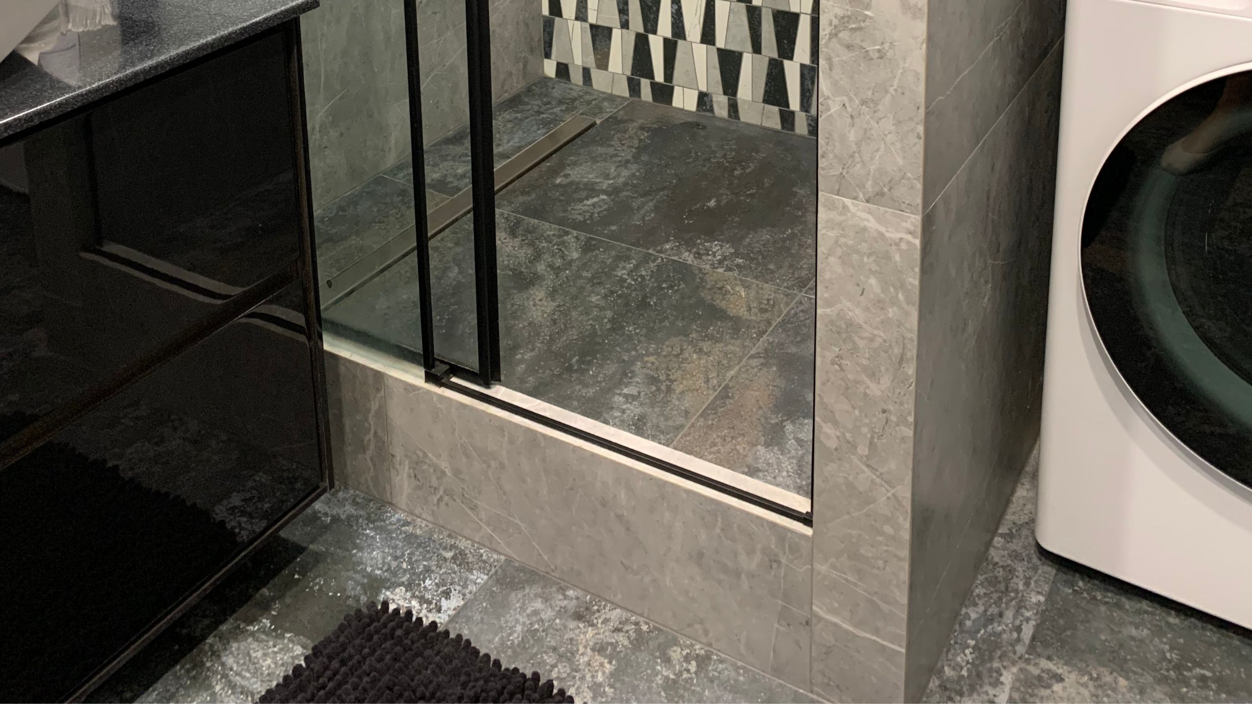 Отделка выполнена полностью из керамогранита, который с высокой точностью имитирует поверхности этих двух материалов. Для облицовки стен Светлана выбрала коллекцию Vision — серый мрамор с тонкими, геометричными венами. А на пол уложили керамический гранит Iron в цвете 02. Получился яркий, нестандартный, но уравновешенный дизайн.