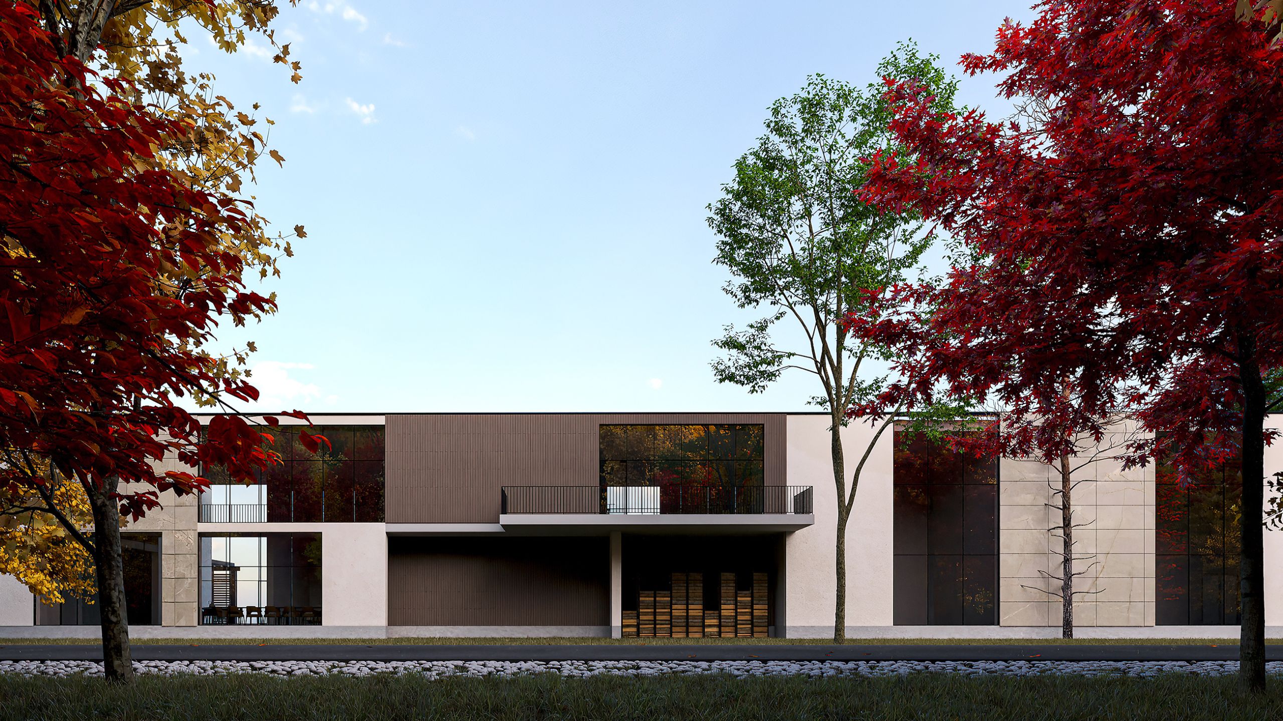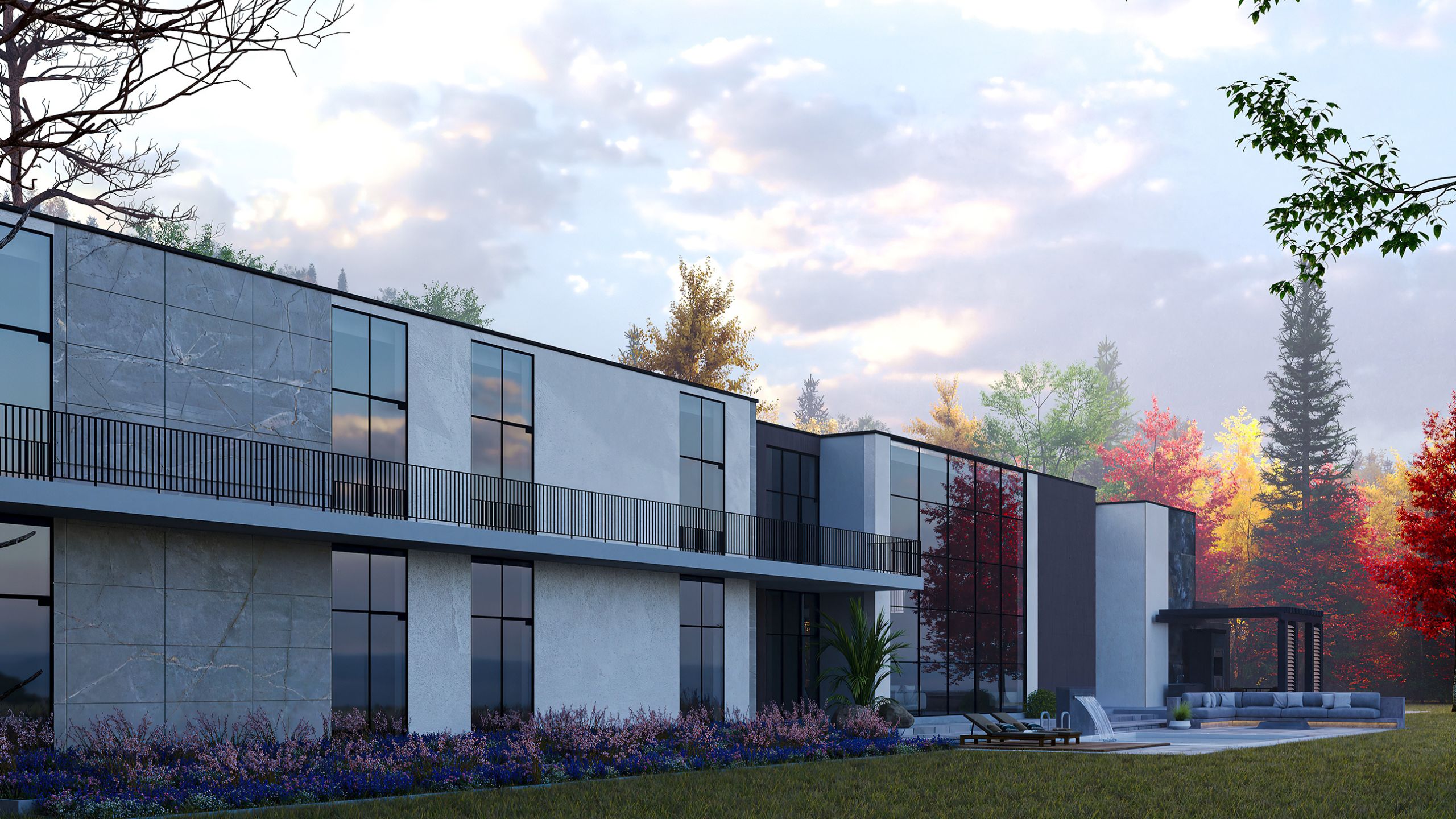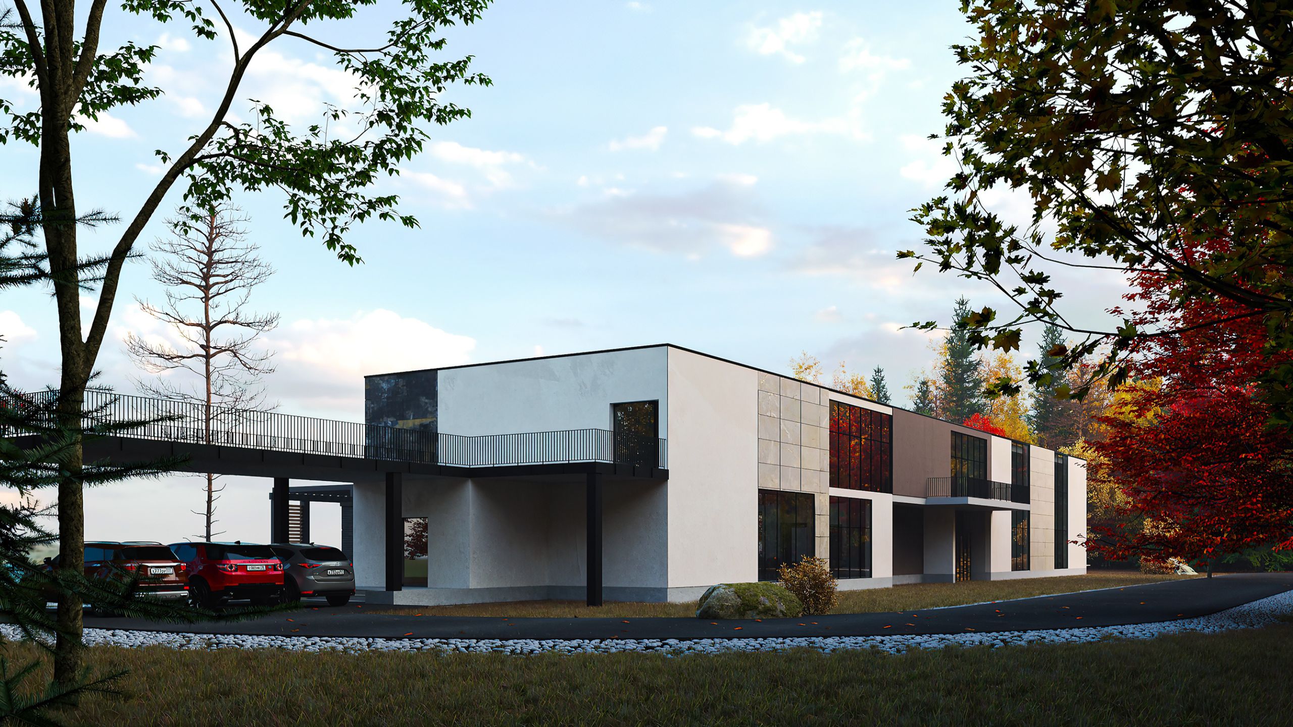 Минималистичная постройка, современный дизайн — визуализация дома выглядит потрясающе! А разнообразная отделка фасадов придала дому дополнительной изюминки. Так, Артур объединил в отделке три коллекции крупноформатного керамогранита: Bernini, Terra и Iron.