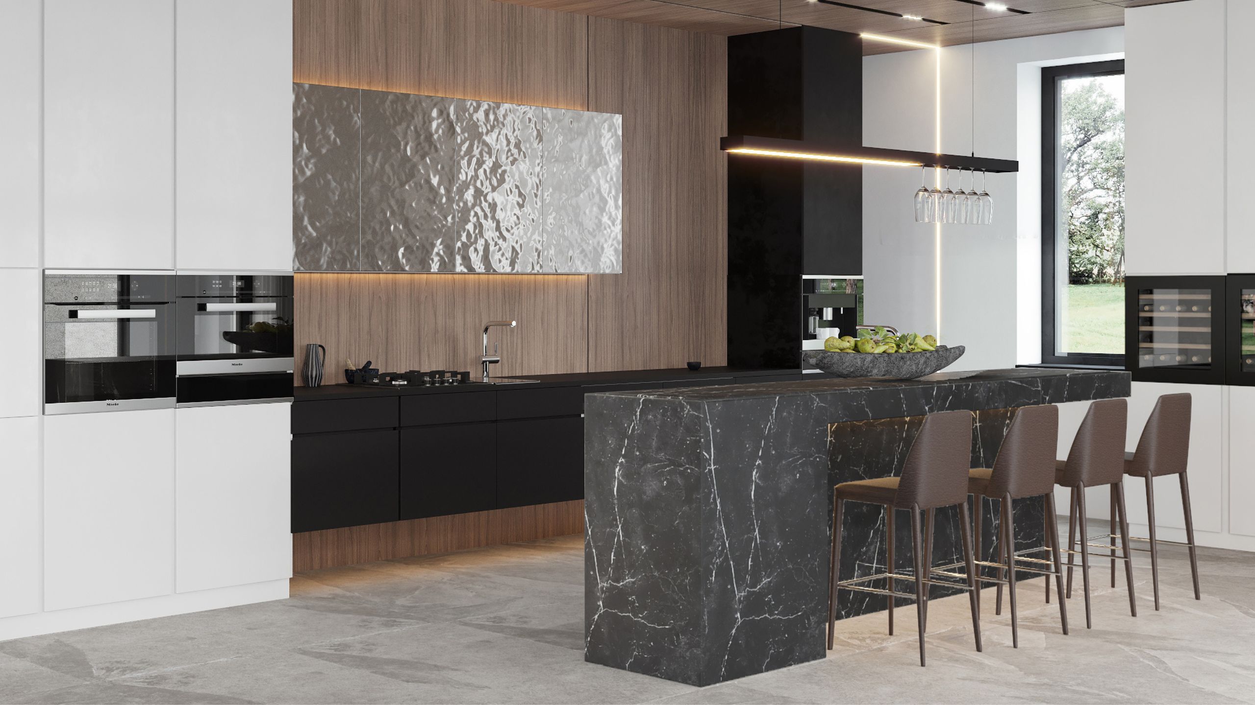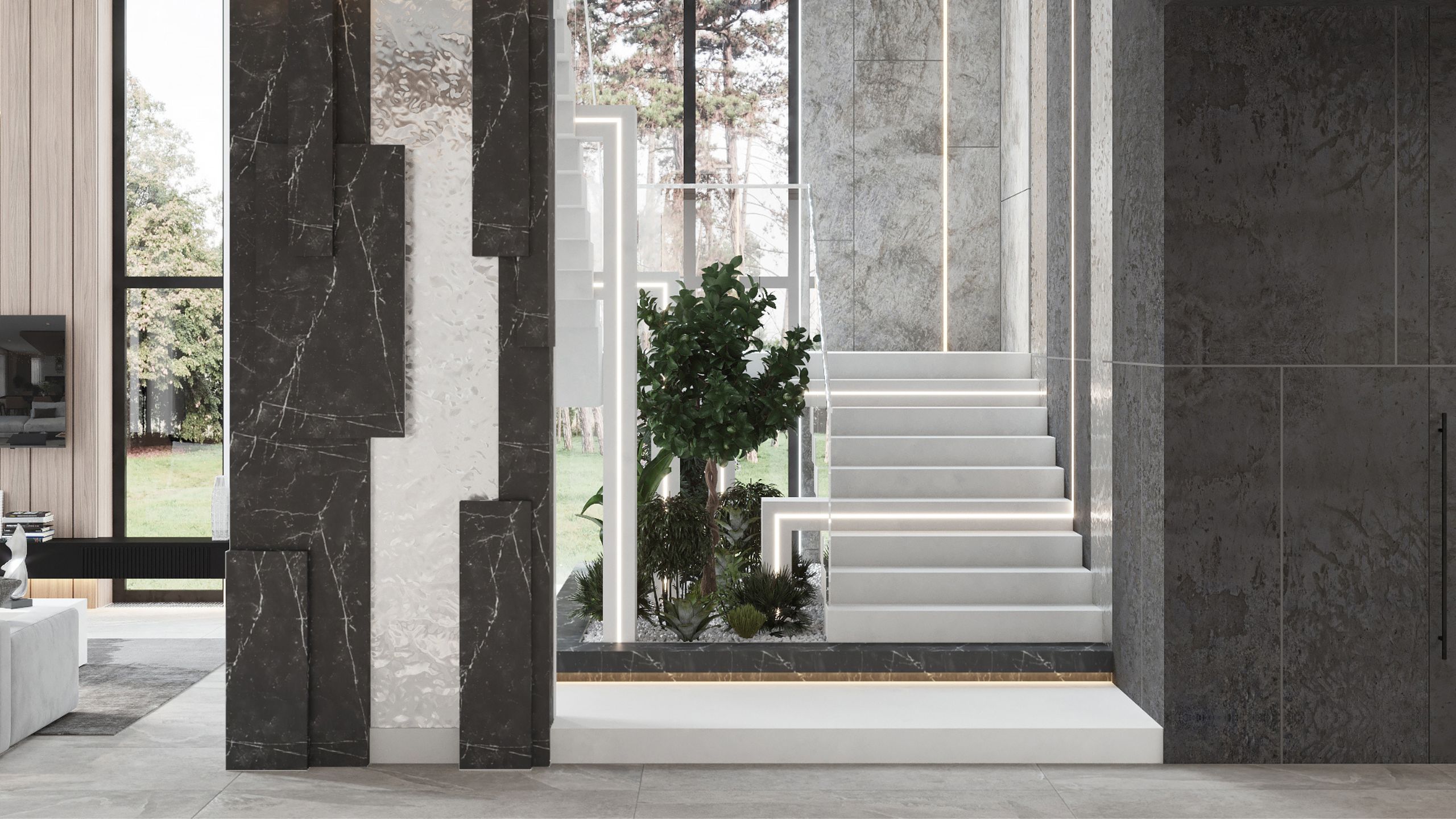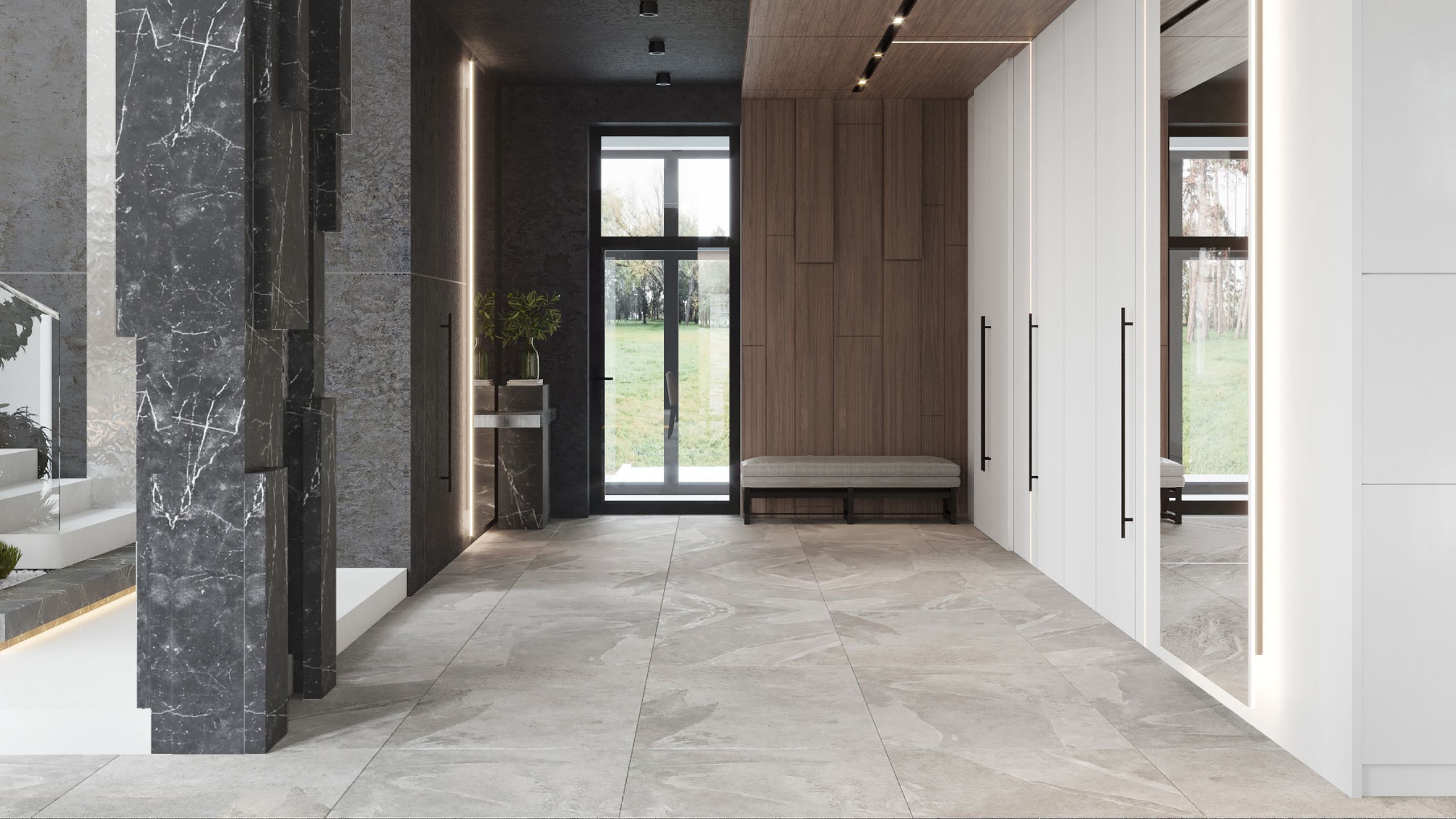 Клиент хотел обновить входную группу, чтобы дом выглядел красиво не только внутри, но и снаружи. Для отделки холла дизайнер выбрала коллекцию Terra в цвете 02. По задумке прочный материал должен стать удачным решением для “мокрой” зоны, где так часто хозяева и гости ходят в уличной обуви. А чтобы создать единый стиль во всем пространстве, керамогранитом из той же коллекции отделали и пол на кухне.