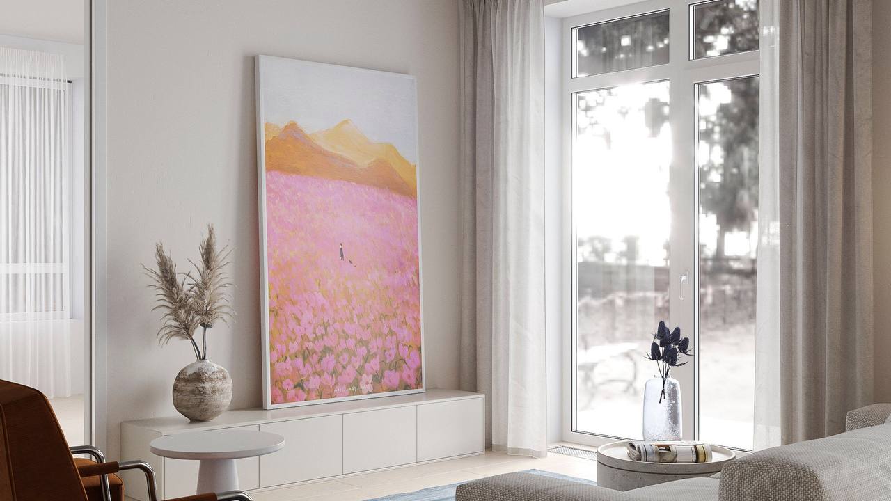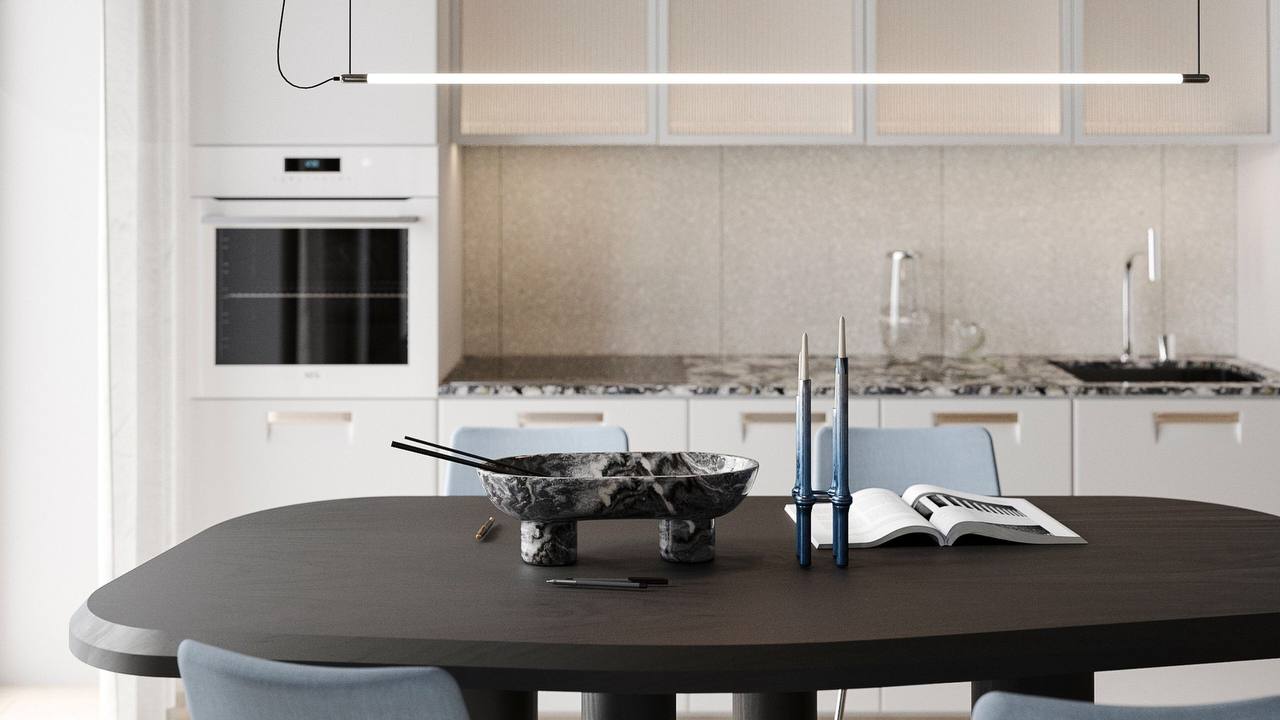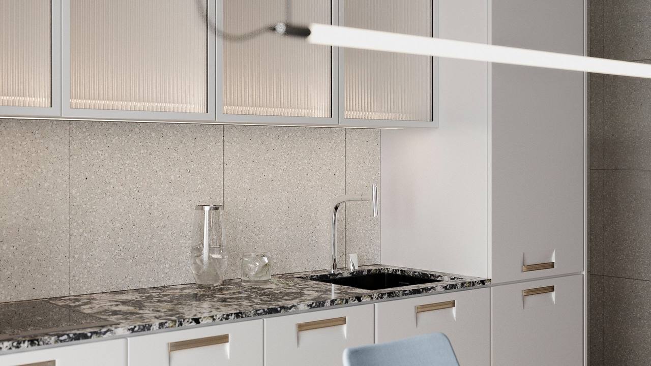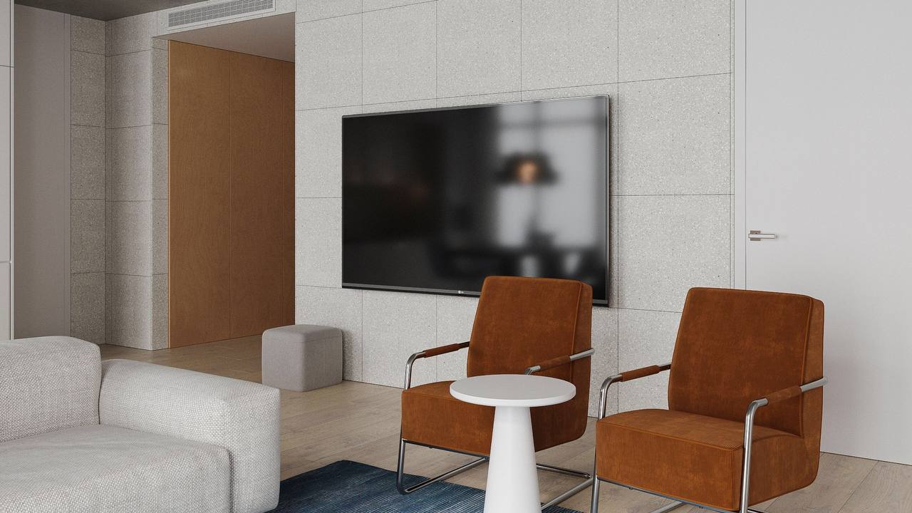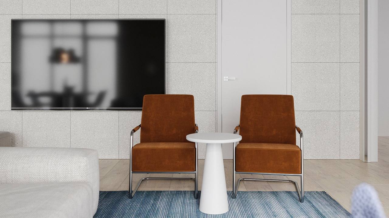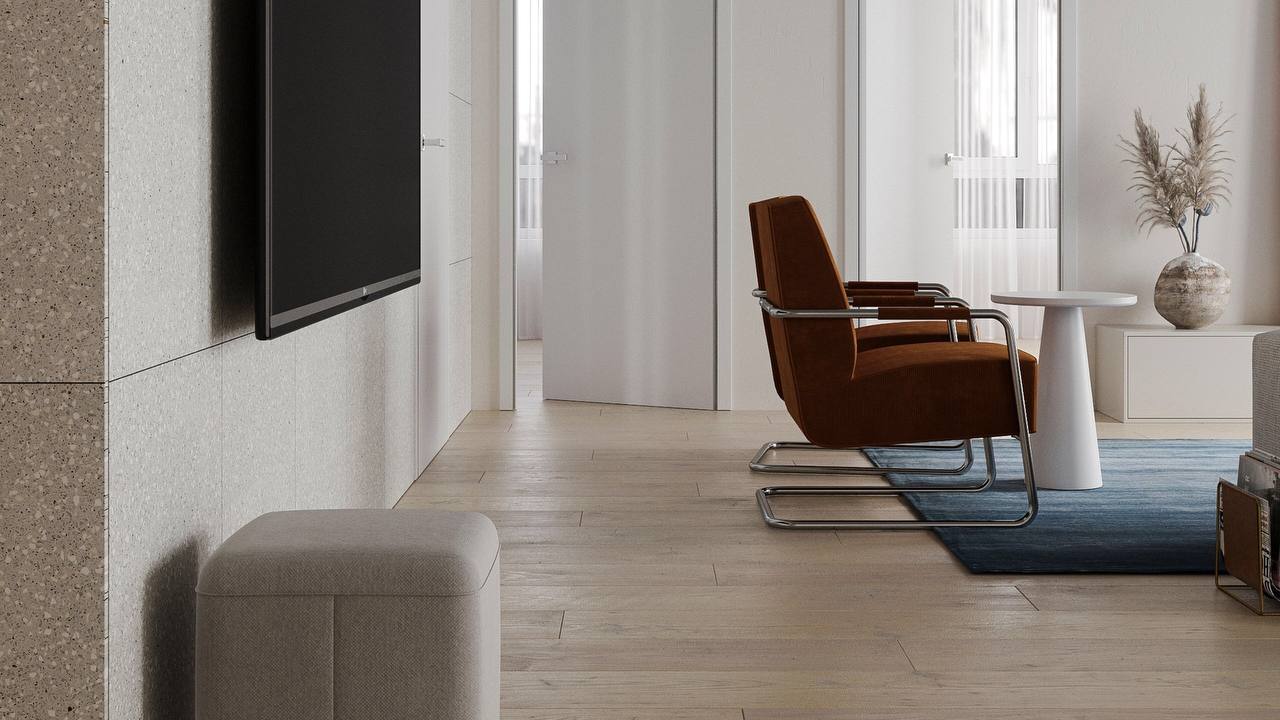 и светлое пространство для работы и отдыха. Хозяева очень творческие и харизматичные, поэтому, по задумке автора, квартира должна была стать обрамляющей рамкой для клиентов. На площади 93,6 м2 дизайнер София Жемчужникова создала многофункциональное пространство, включающее гостиную для релаксации, кухонную и обеденную зоны для кулинарных экспериментов и неспешных завтраков. В качестве фонового цвета София выбрала белый, он же стал и доминирующим во всем помещении. Комбинируя различные фактуры, дизайнер создала ненавязчивую, но в то же время интересную чистовую отделку: бетонный потолок, деревянный пол и акцентные стены из керамогранита "терраццо" из коллекции Cosmos.