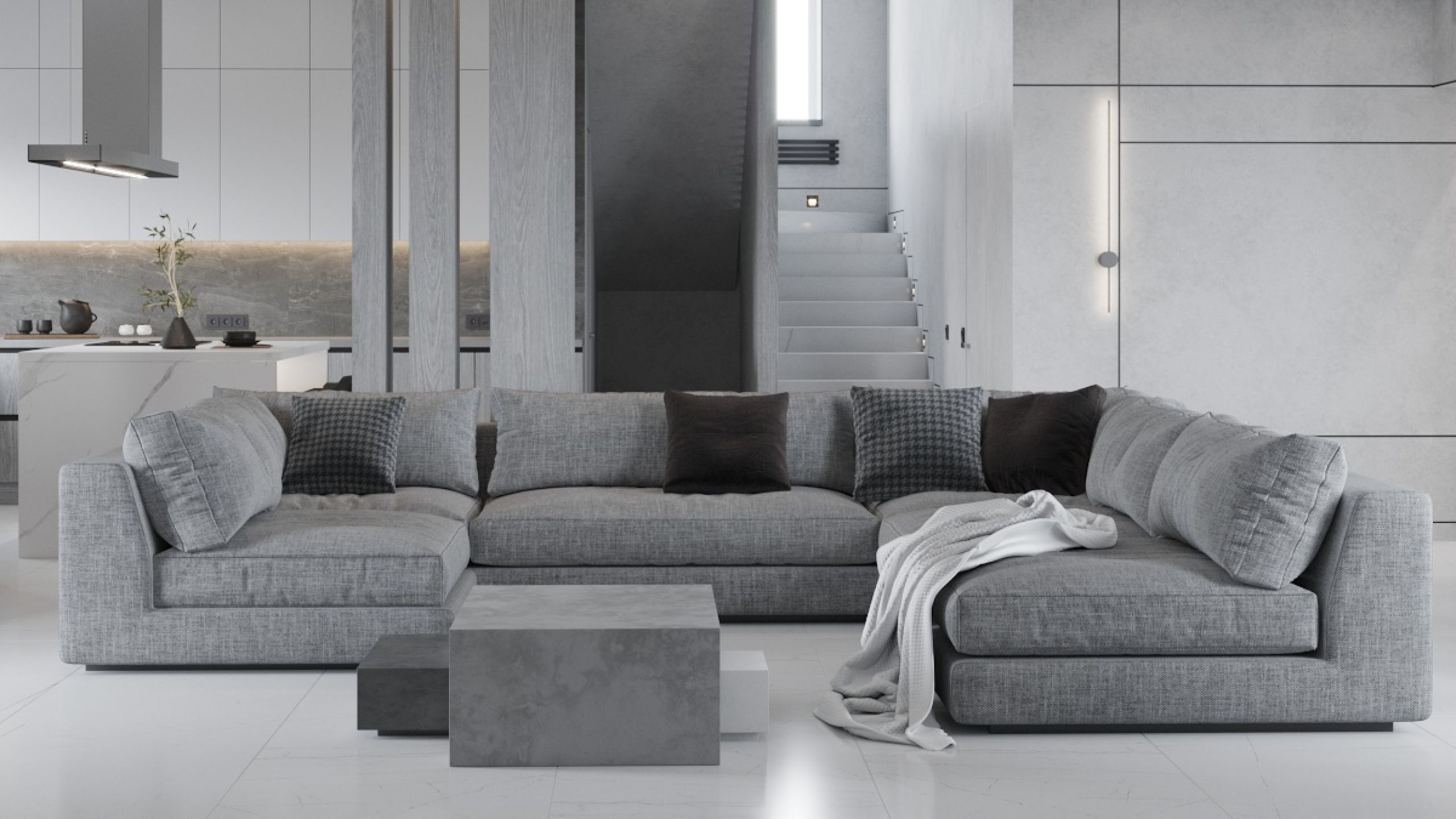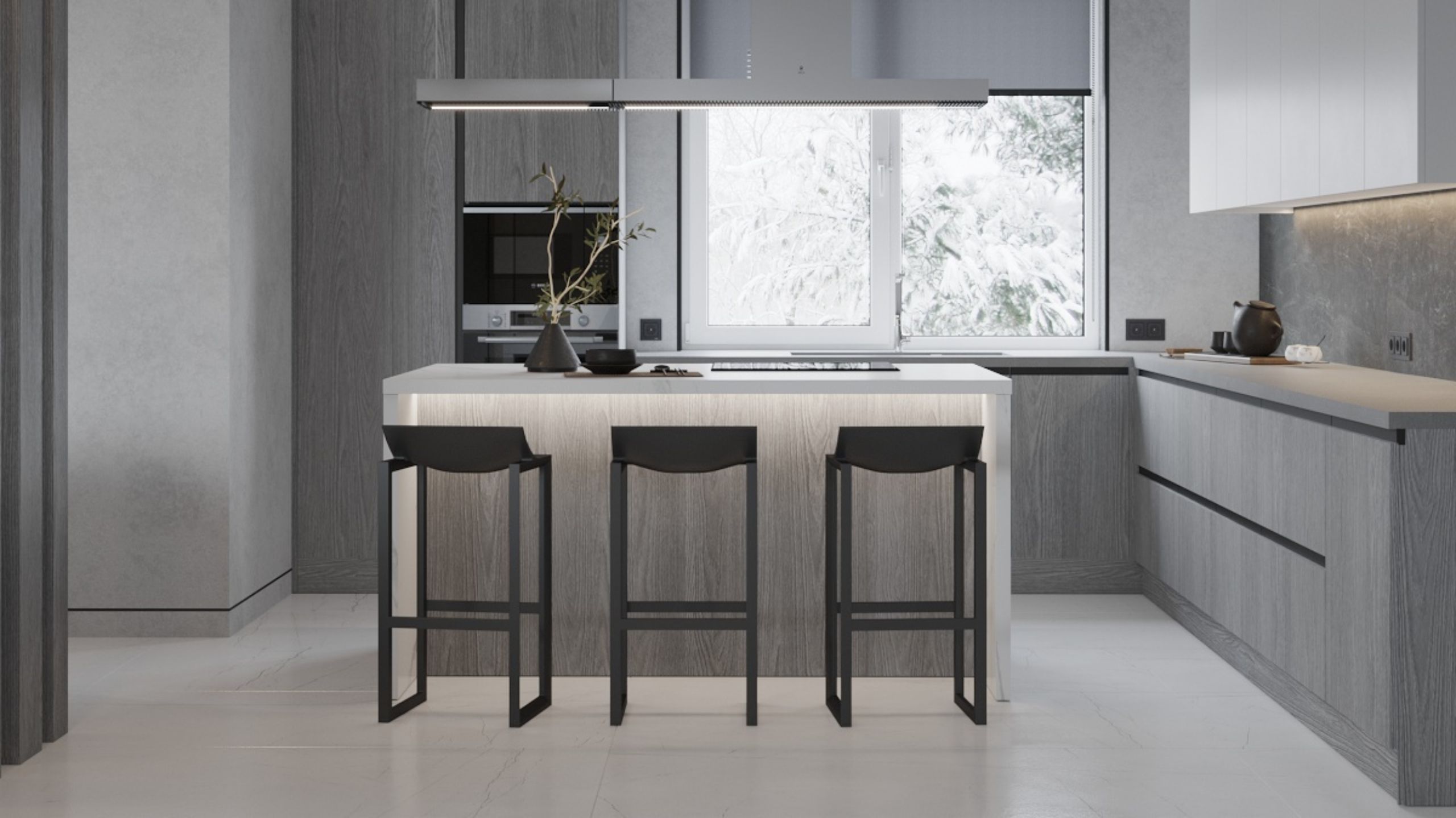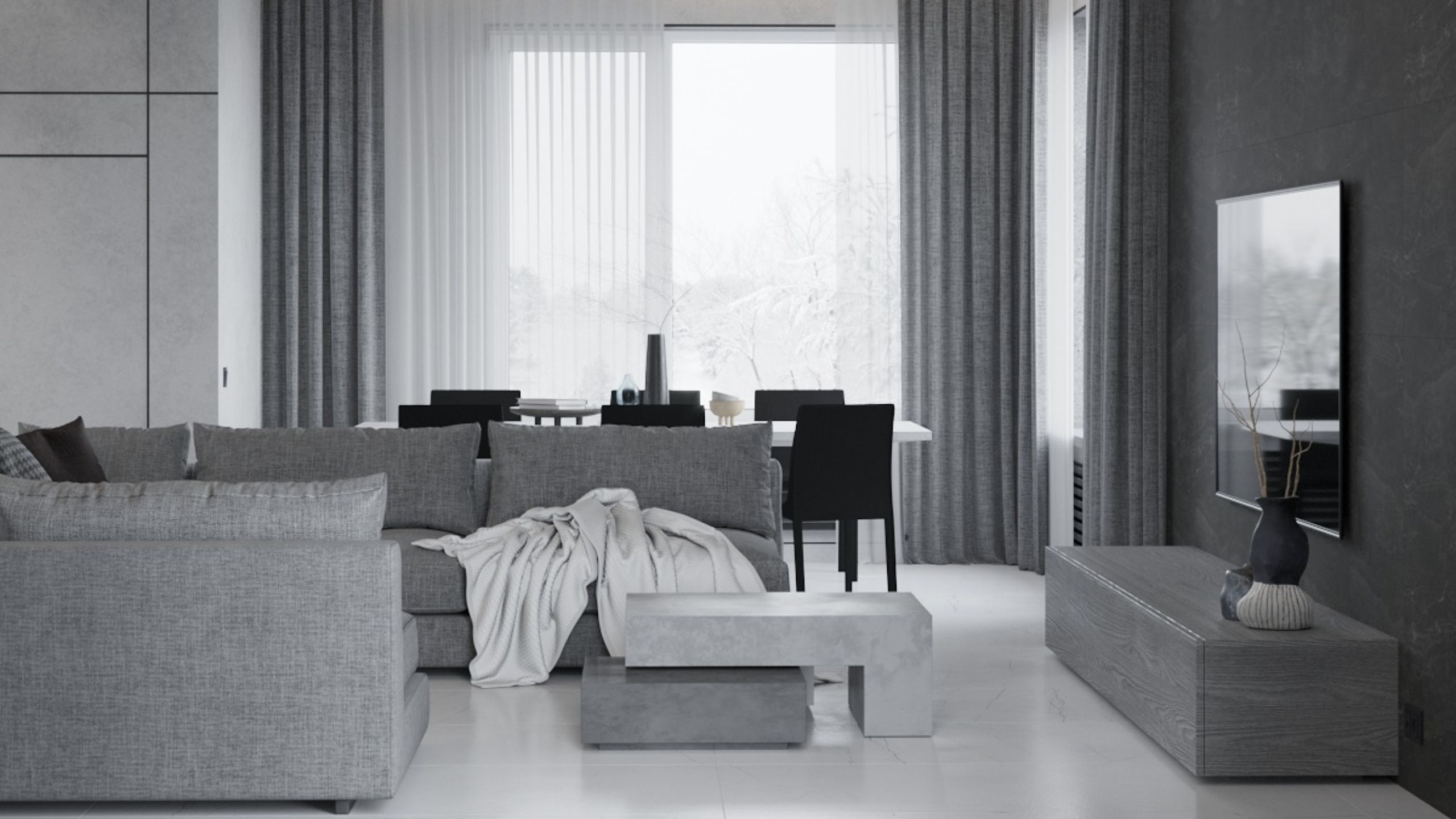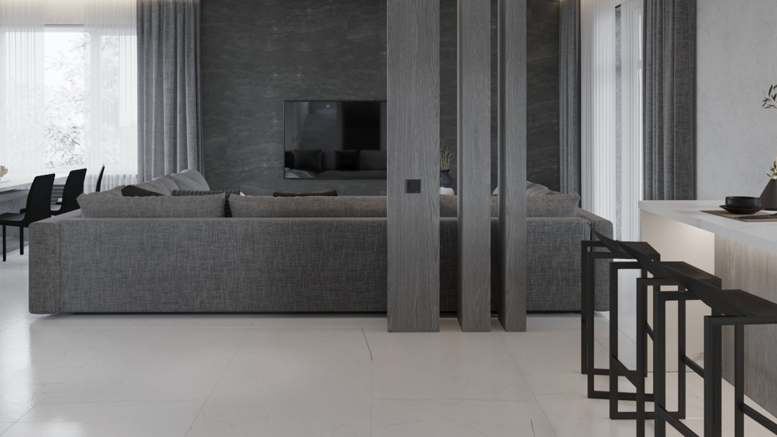 Проект разработан под ключ и имеет единую стилистику для всех помещений. Моноколорная серо-белая отделка выполнена из двух материалов: на стенах — декоративная штукатурка, а на полу — керамогранит. Чтобы создать впечатление потрескавшегося льда, Татьяна выбрала коллекцию Vision в цвете 01. Атмосферу ледяной пещеры также создают: встроенная LED-подсветка, четкие, угловатые формы мебели и аксессуары цвета металлик.