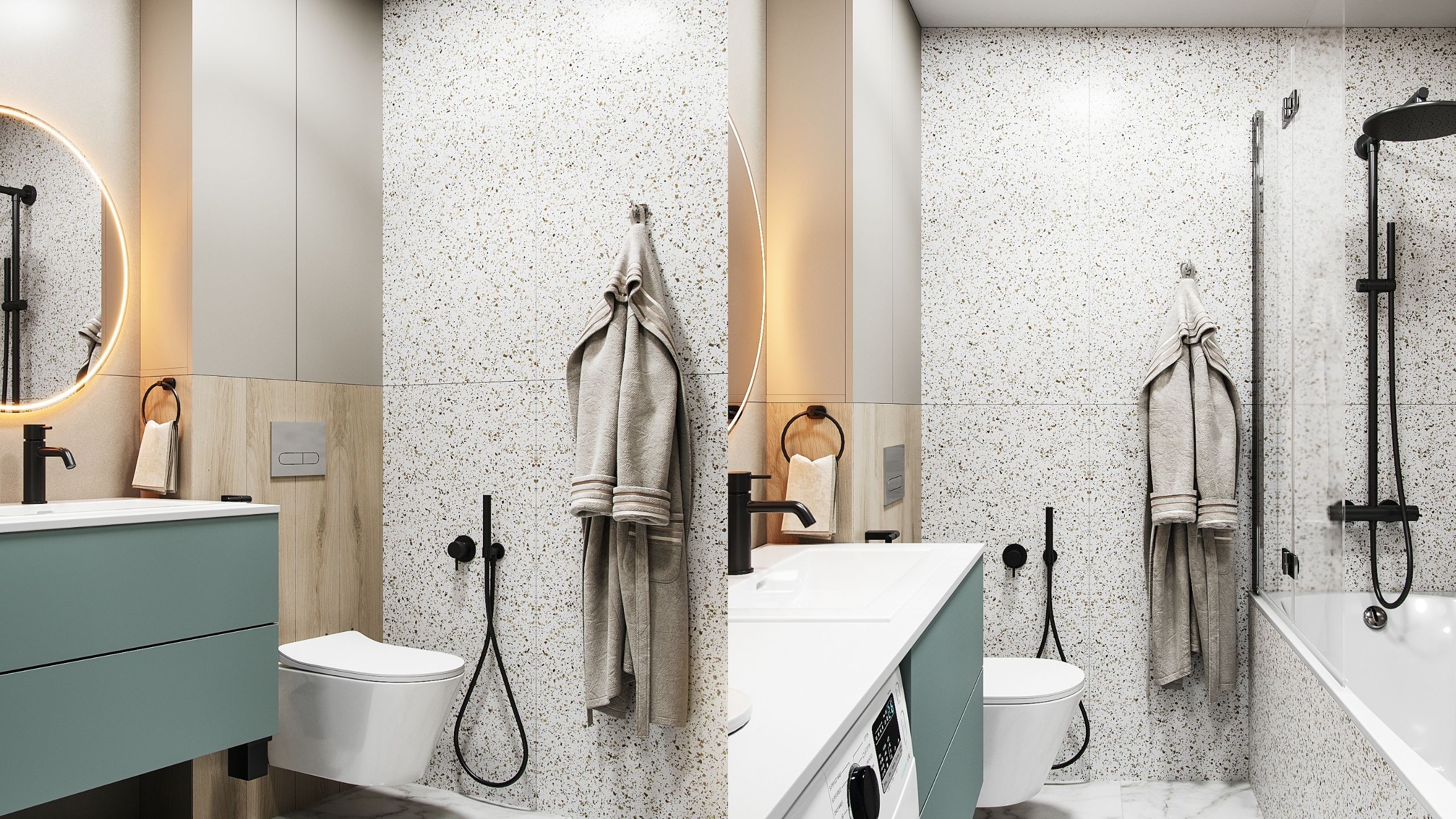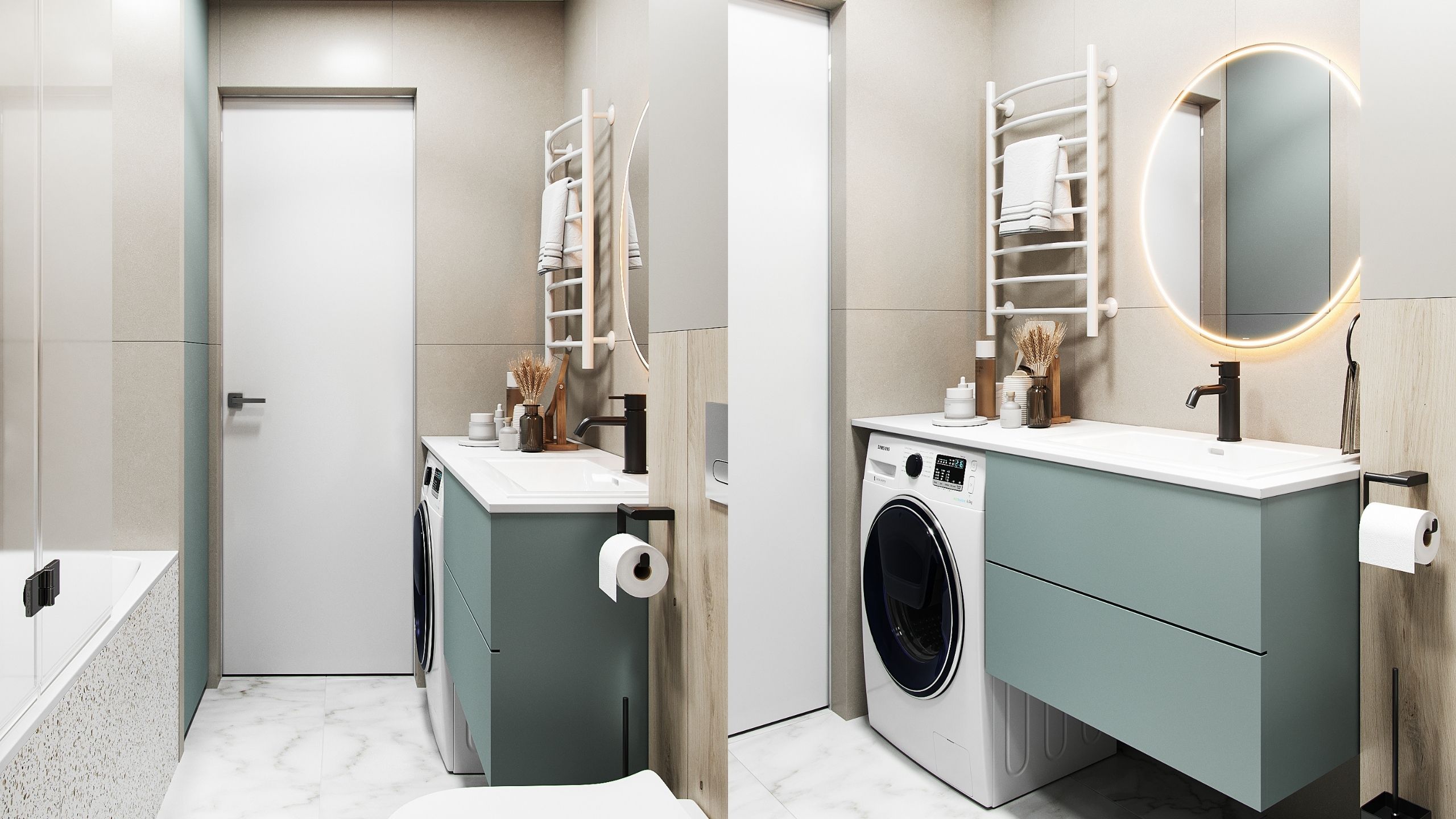 Отделочные материалы подобраны в соответствии с общем стилем проекта - яркие, хорошо отражающие свет и расширяющие пространство. Боковые панели ванны выполнены из керамогранита Cosmos, а на стенах в дополнение к белоснежному полу уложена бежевая плитка Luna. “Игра” с текстурами и материалами делает дизайн помещения более интересным, а нежные оттенки не дают глазам устать.