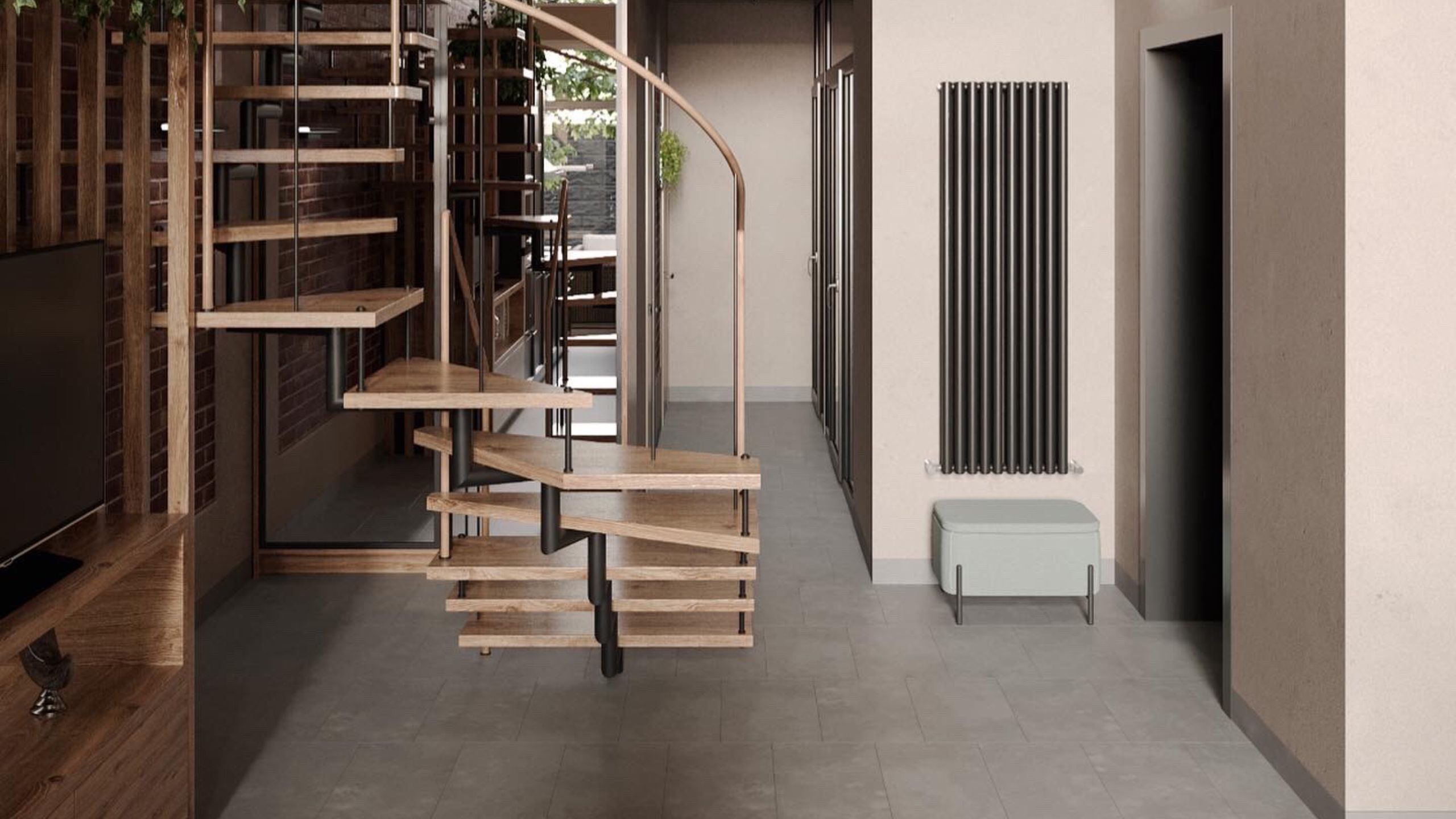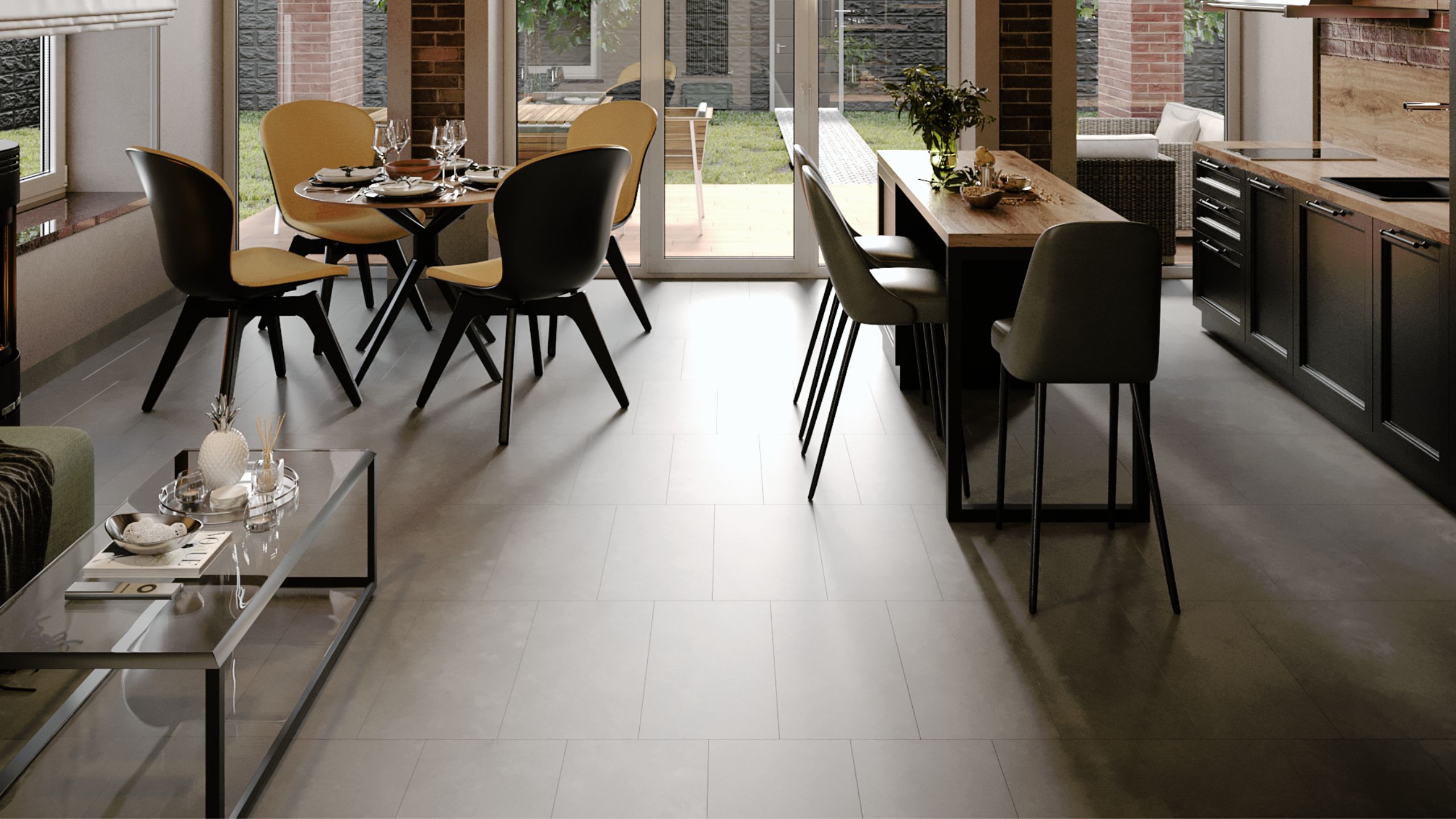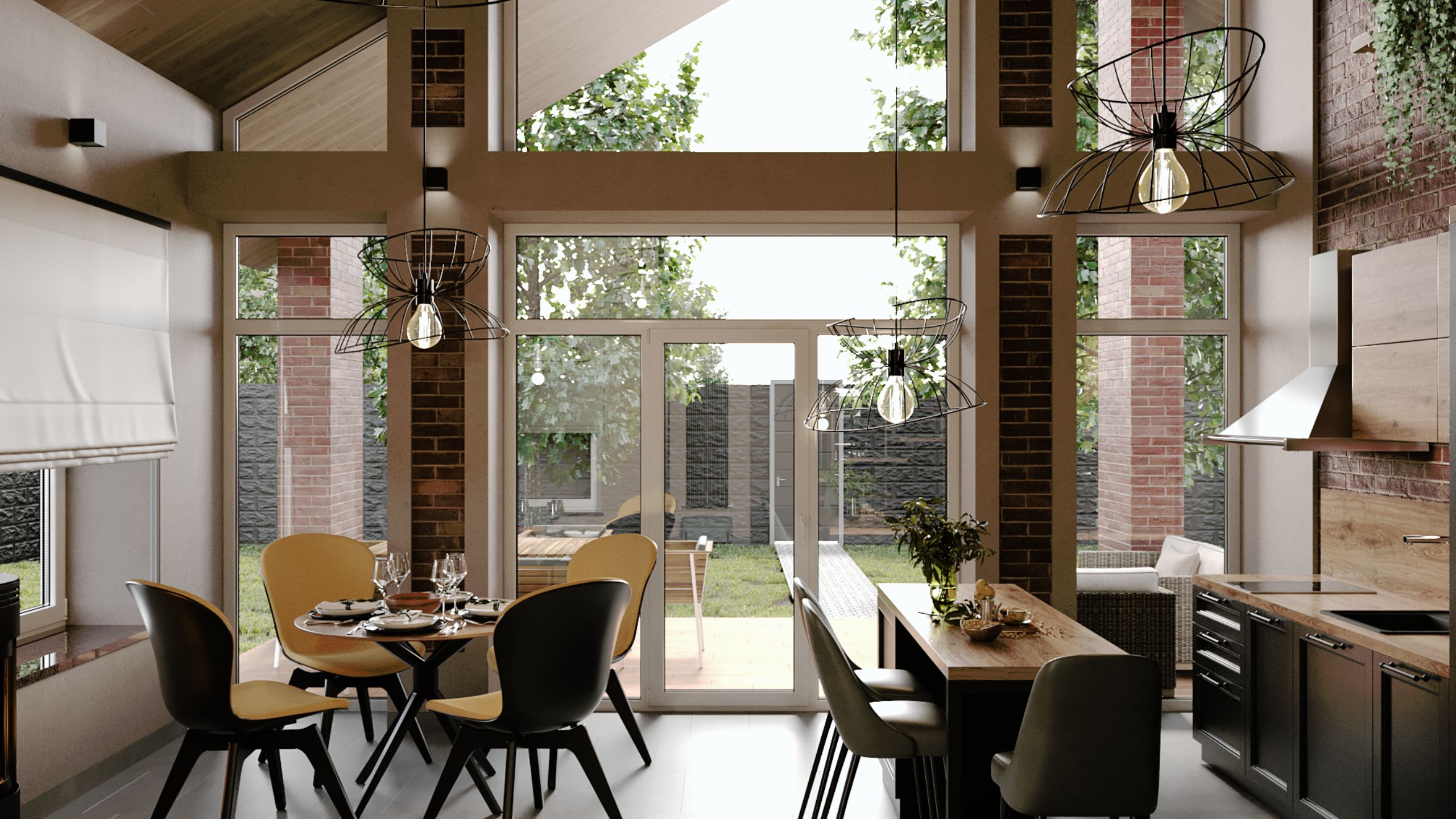Автор проекта выбрала эко-дизайн. В доме много зон с отделкой из керамогранита, кирпича и натурального дерева. Благодаря панорамным окнам жители могут наслаждаться естественным светом долгое время. Такой тип конструкции экономит расход электричества.
