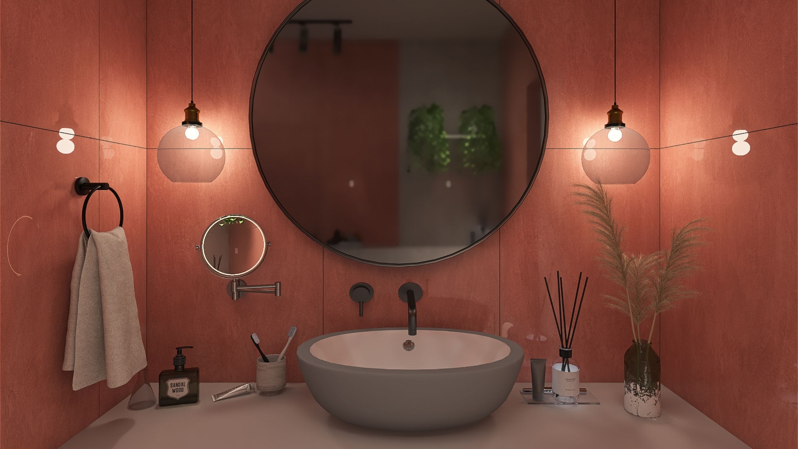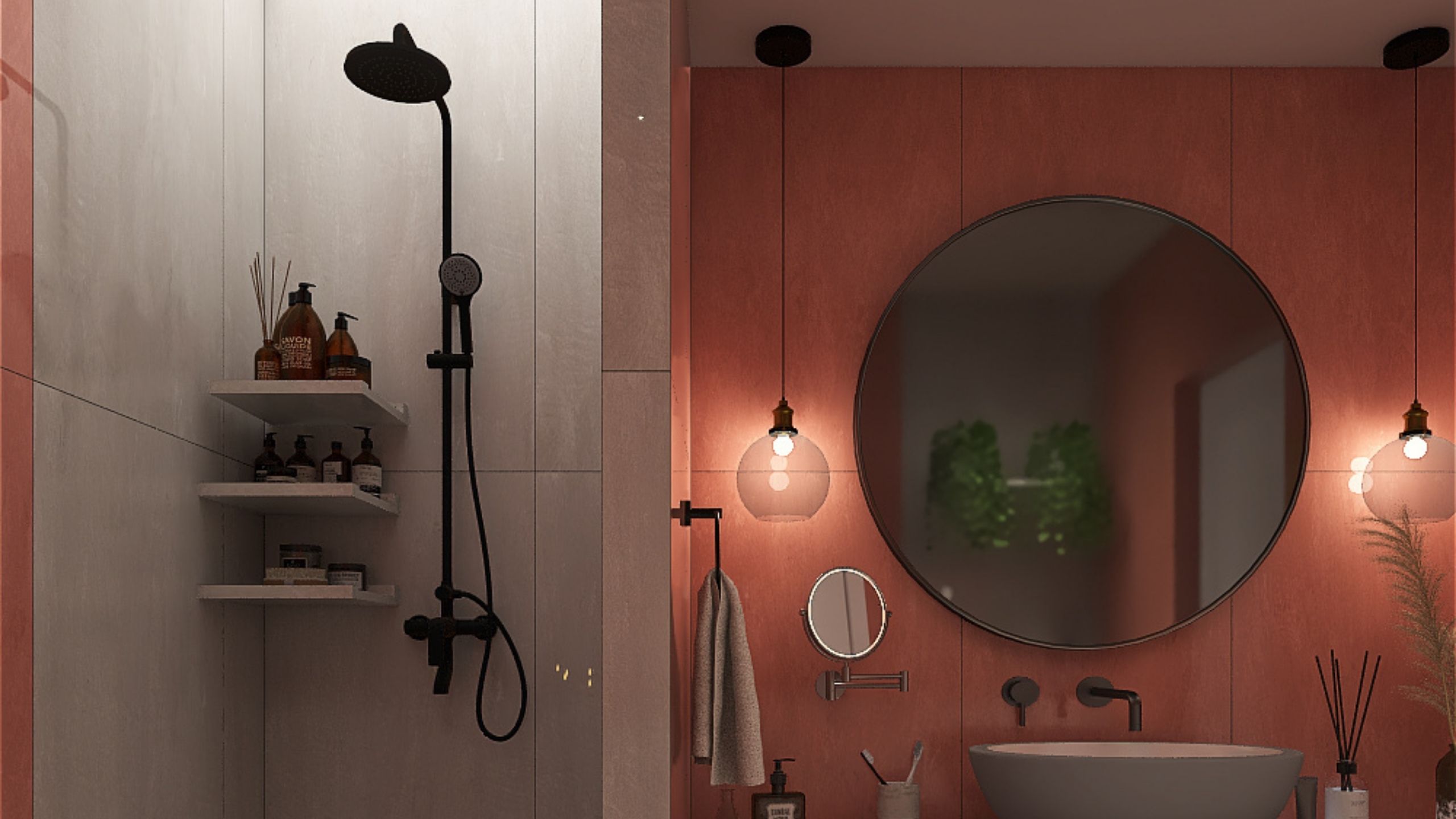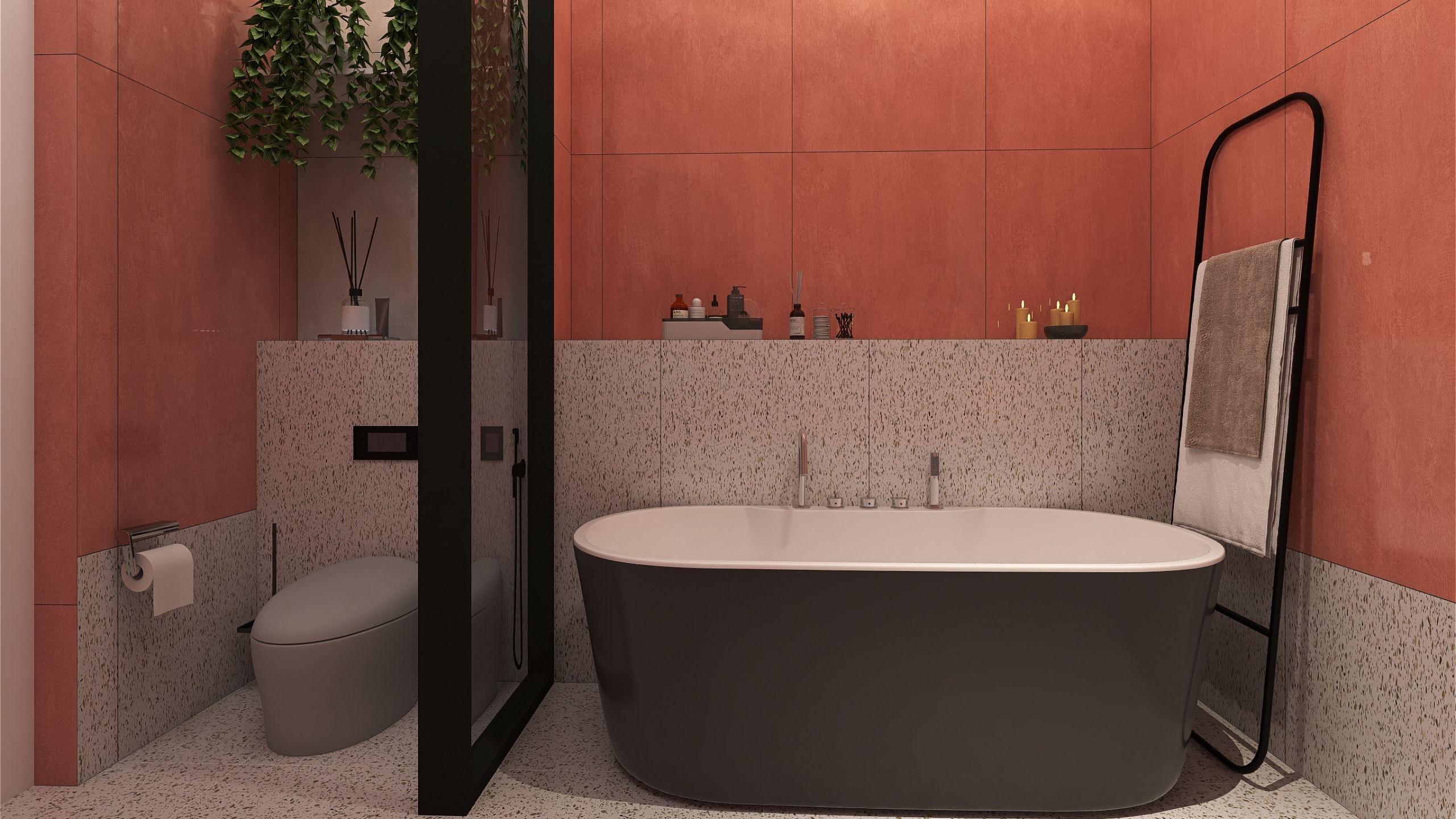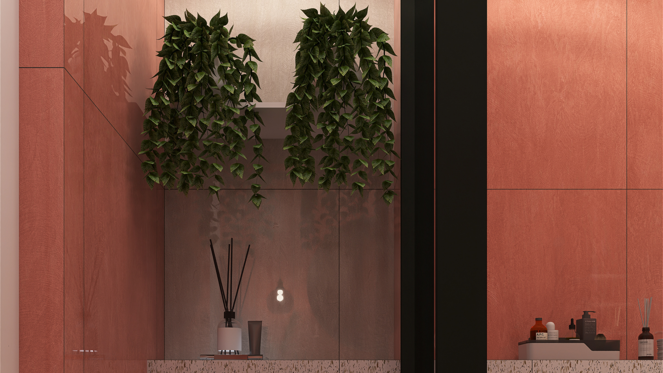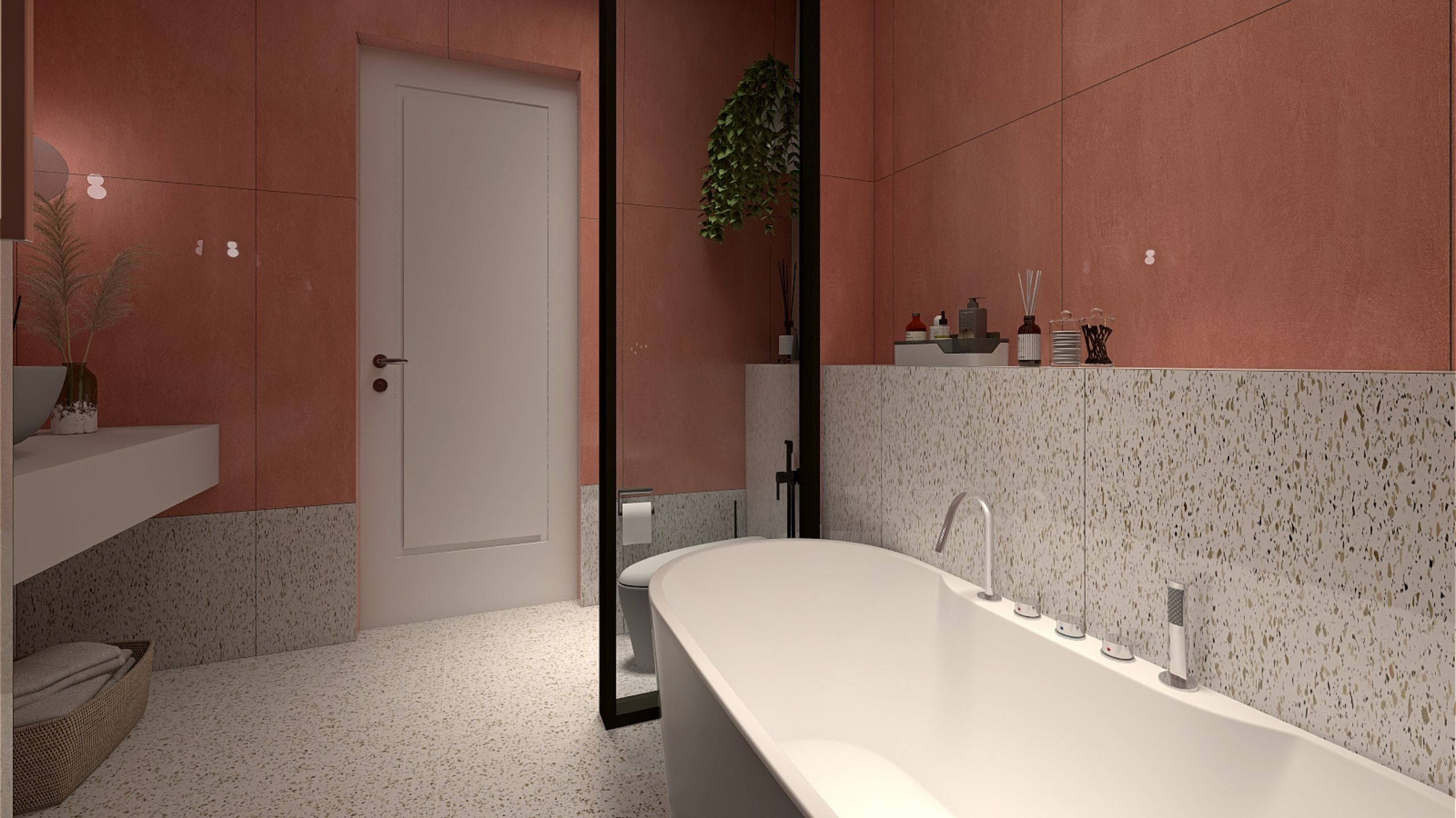 Керамогранитная плитка Cosmos в сочетании с приглушенным светом - идеальное сочетание, чтобы создать праздничную и в то же время уютную атмосферу в ванной комнате. На контрасте с керамогранитной плиткой в монохромном лососевом цвете органично смотрится терраццо, создавая впечатление, будто бы пол запорошило первым снегом.