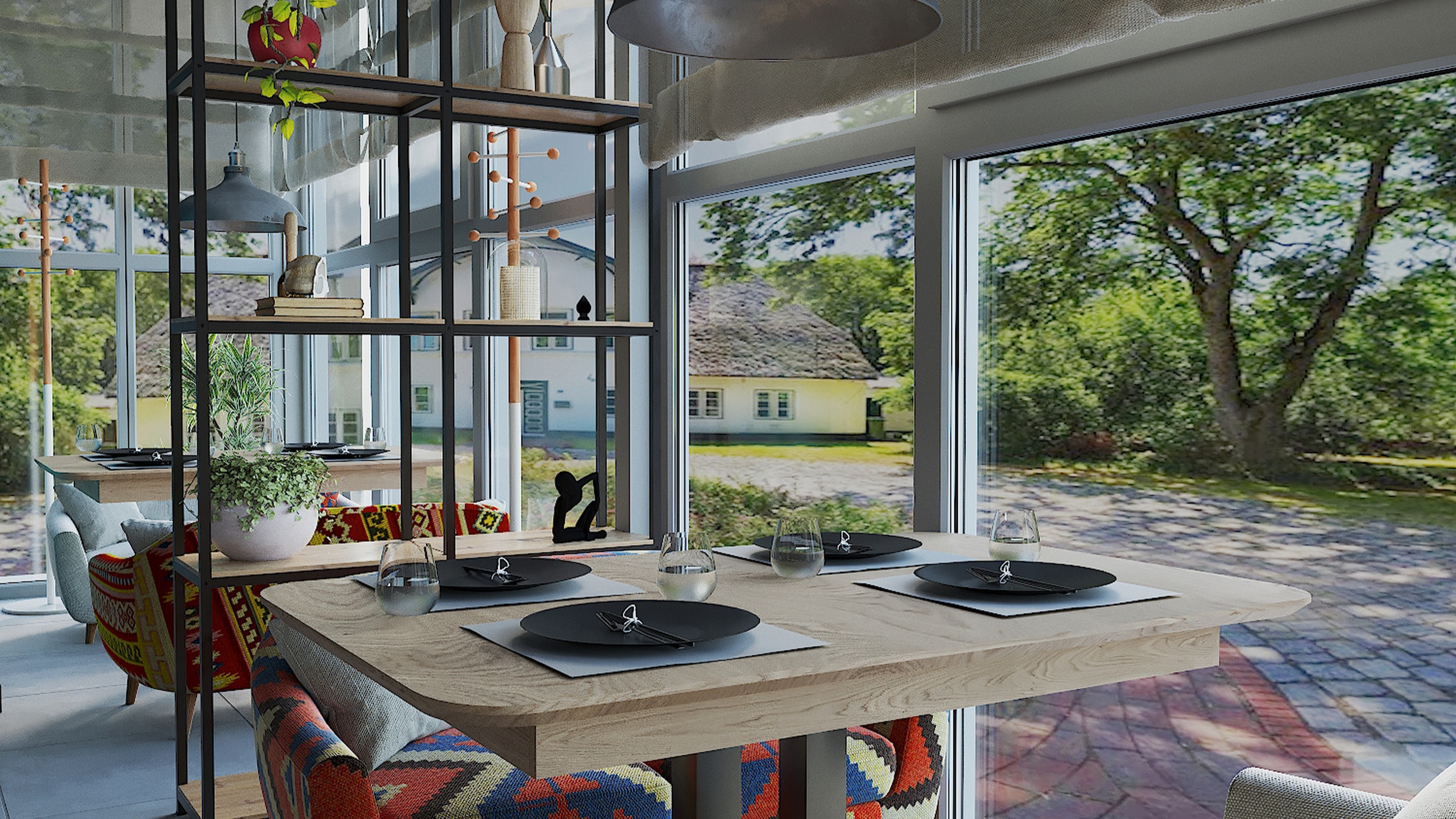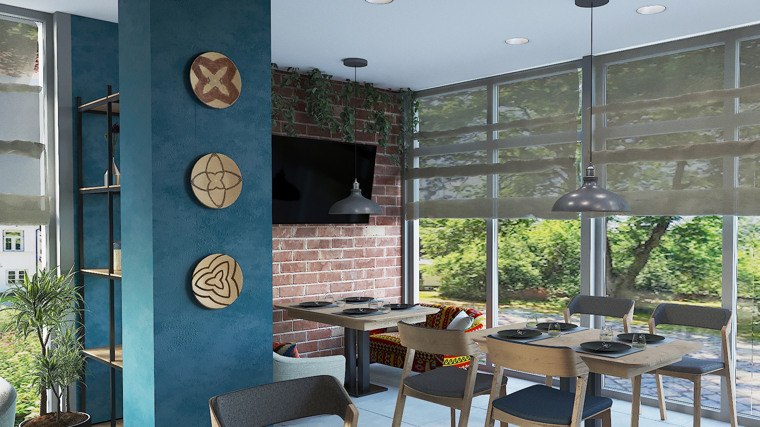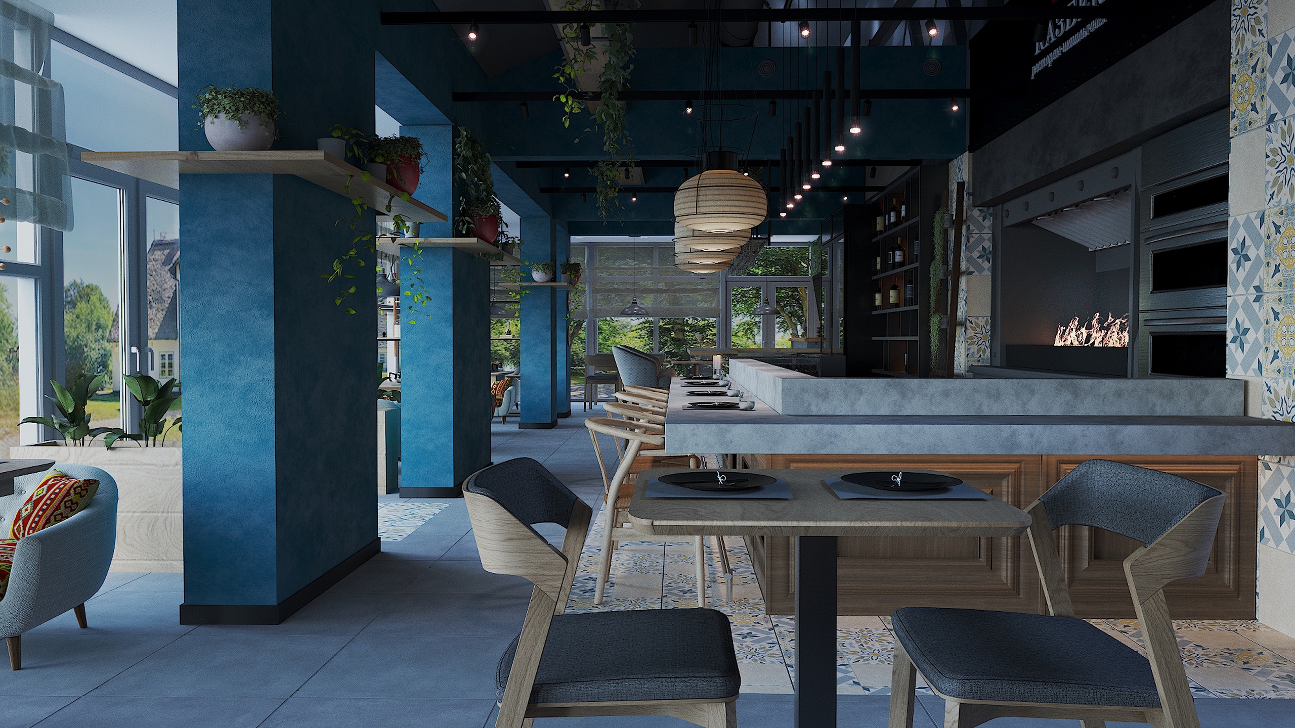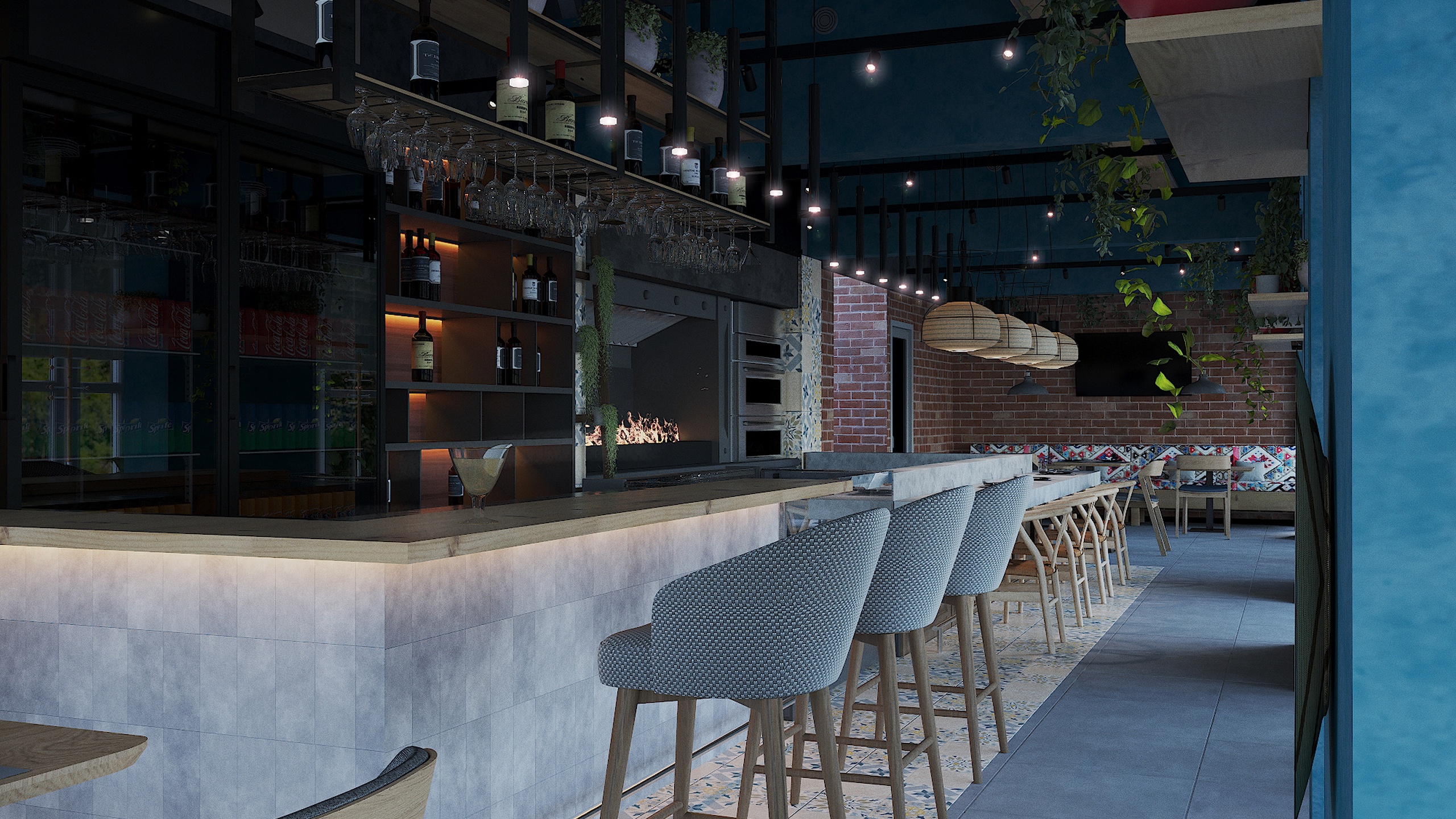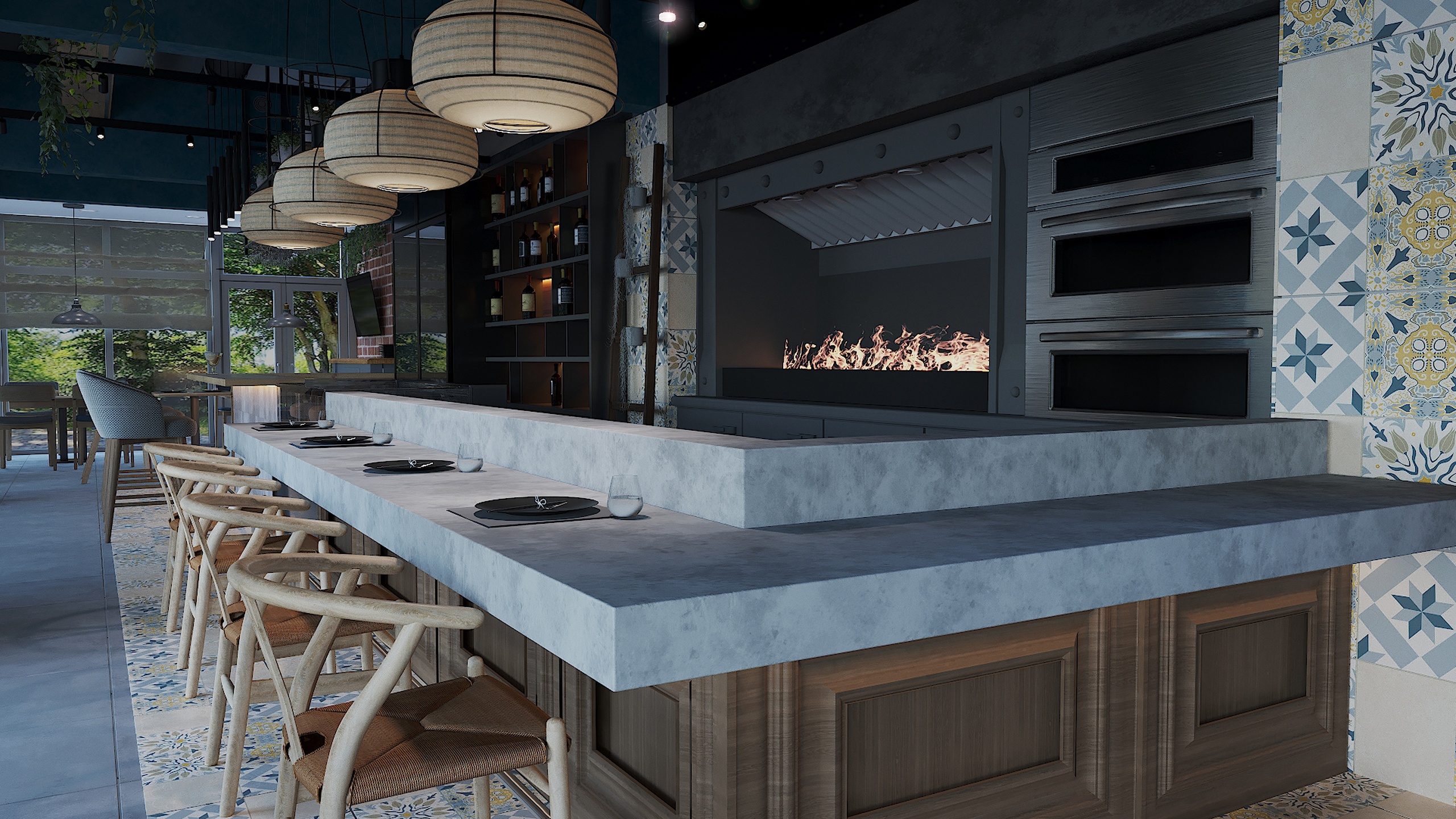В проекте, созданном Ани Маджарян, каждый элемент интерьера отражает внимание к деталям. Ресторан оформлен в этническом стиле. Барная зона с фактурной столешницей и стульями из ротанга выглядит лаконично и современно. Акцентные участки стен и пола оформлены керамогранитными плитами из коллекции Jam в стиле пэчворк, которые дополняют выразительный и оригинальный дизайн. Открытый огонь привлекает внимание и придает пространству динамики.