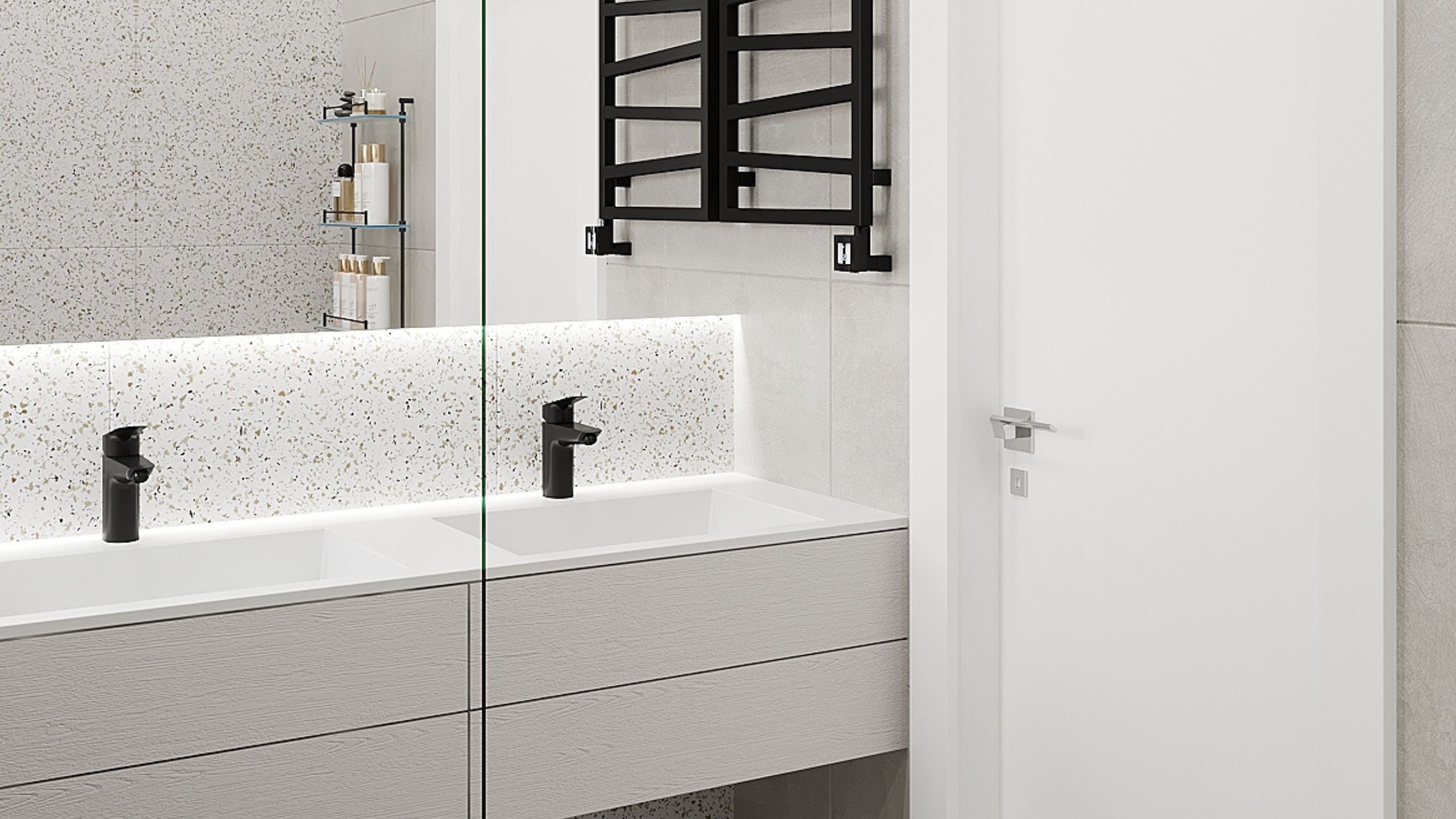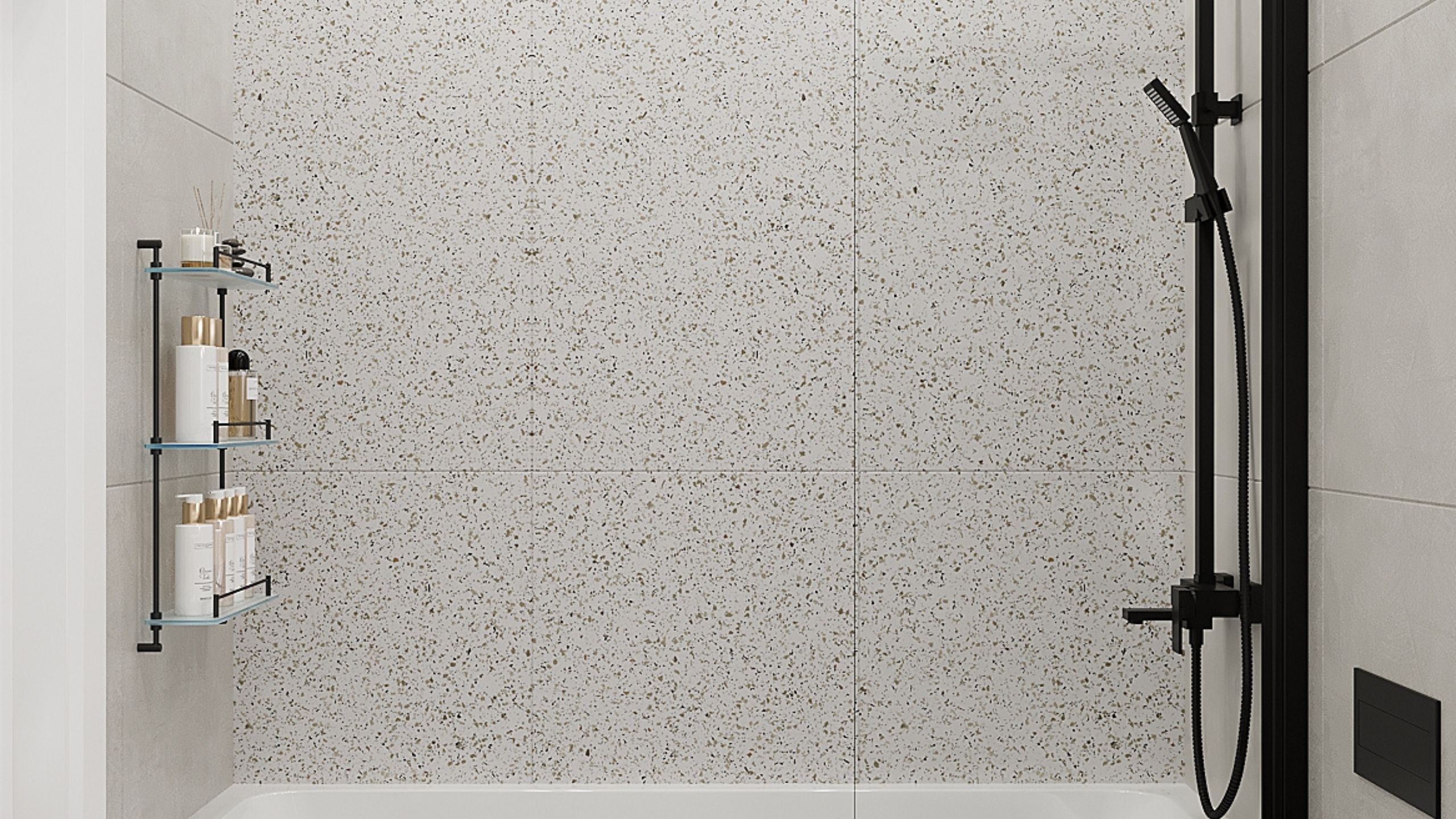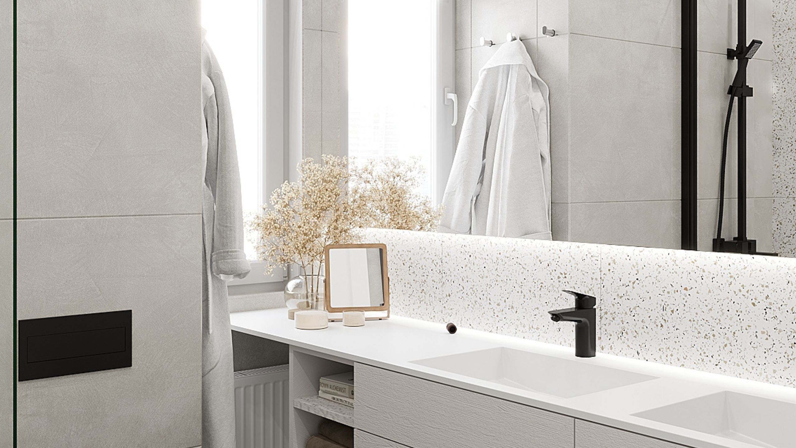 Оксана Антонова создала монохромный и минималистичный дизайн для небольшой ванной комнаты. В качестве основного отделочного материала она выбрала керамогранит из коллекции Cosmos с мелкими вкраплениями. Данный рисунок разбавил бело-серые тона и придал пространству изюминки. А декоративные элементы в виде миниатюрного зеркала и букета сухоцветов добавили в интерьер нотку романтики и весеннего настроения.