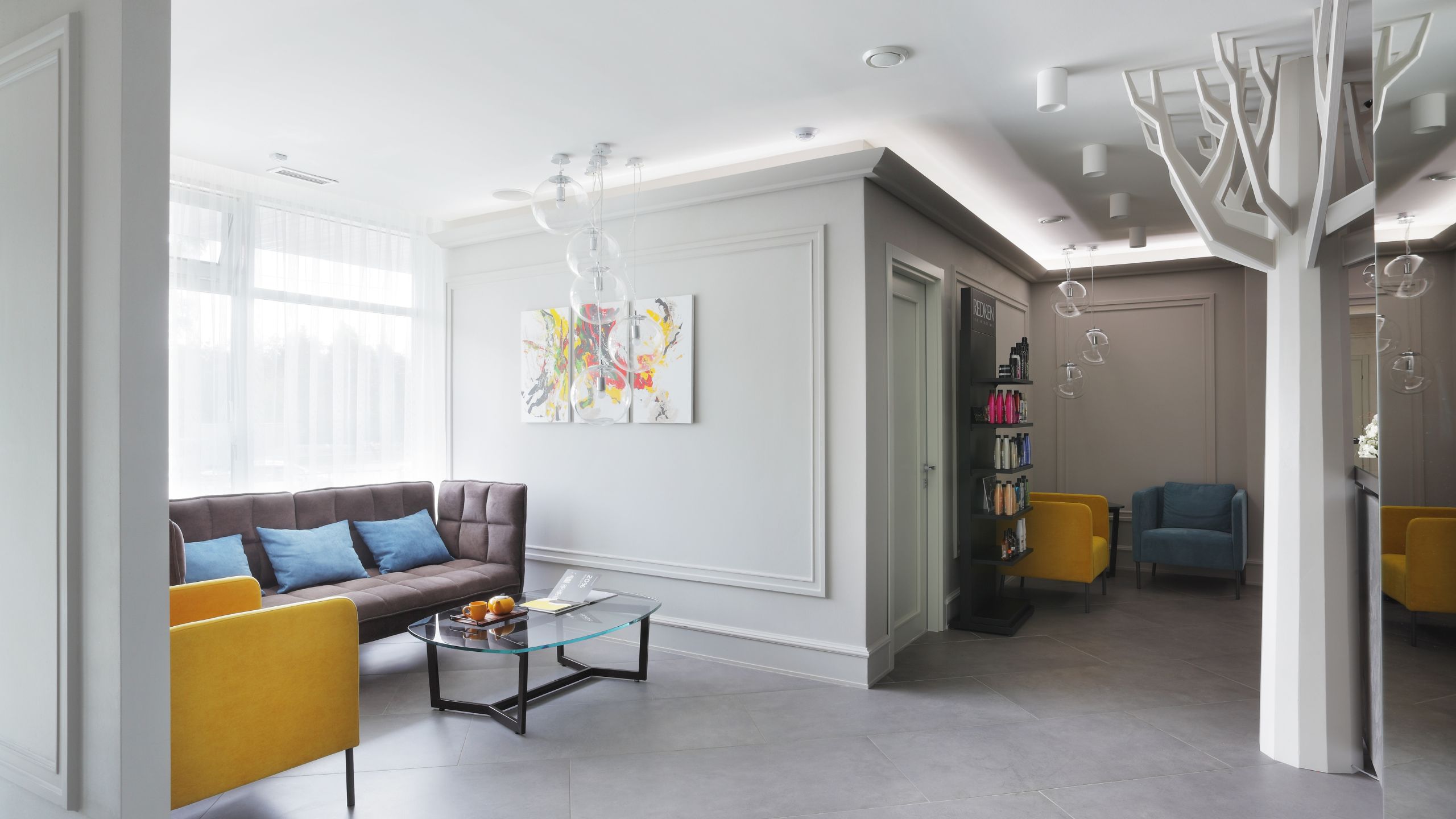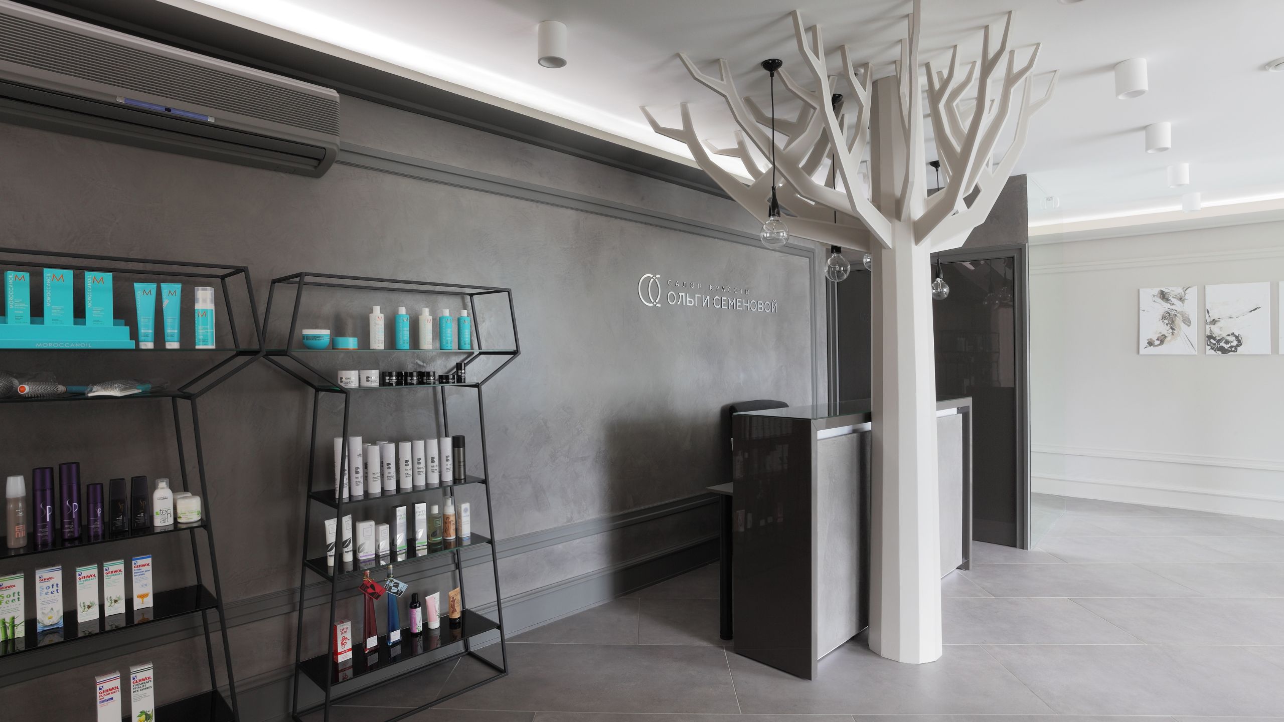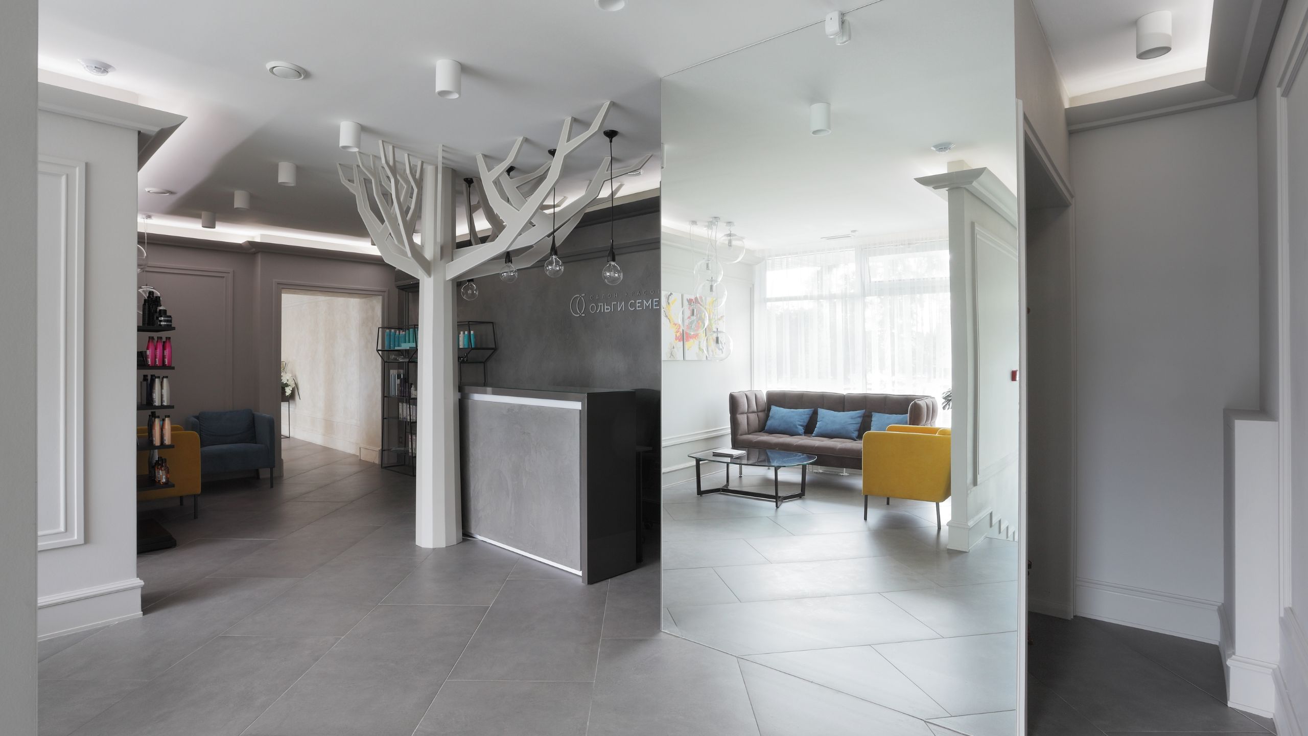 Заказчица хотела, чтобы дизайнеры преобразили ее салон красоты и подобрали романтичное решение для интерьера. Автор проекта Софья Жемчужникова создала атмосферу сказочного леса, поместив знаменитый сюжет работы Марка Шагала на одну из стен в главном зале. Романтизм и полет фантазии — то, что нужно для салона, где “красота спасает мир”. В проекте использована плитка из коллекции Loft.