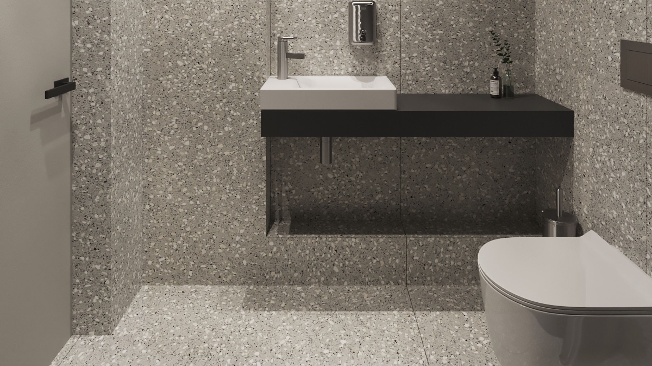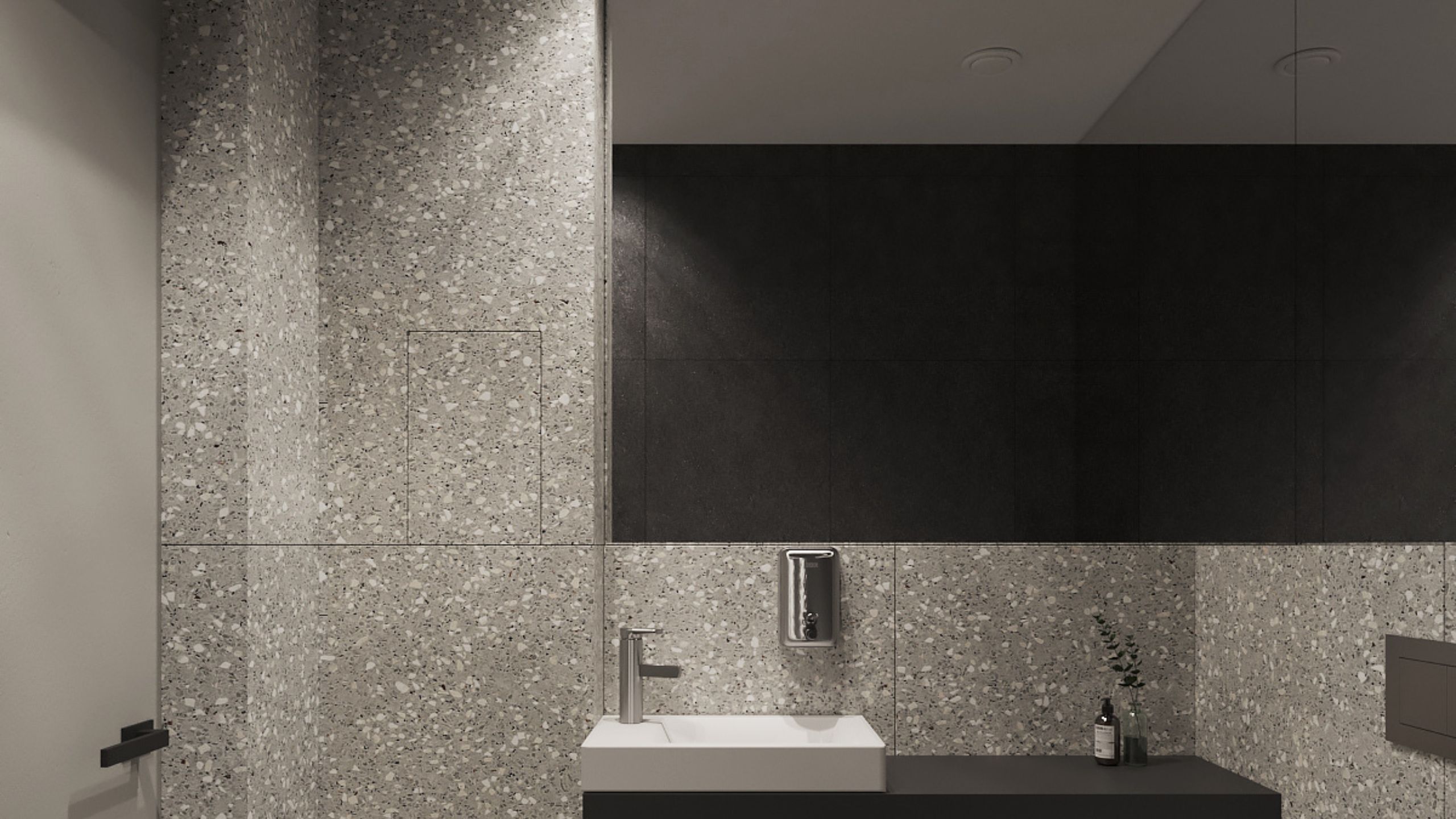 Вторая акцентная деталь, которая делает отделку более интересной — стена, выкрашенная в черный цвет. Для отделки остальных поверхностей Павел выбрал коллекцию керамогранита Cosmos.