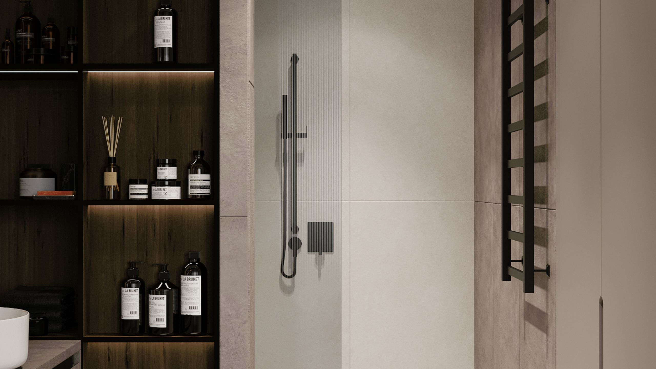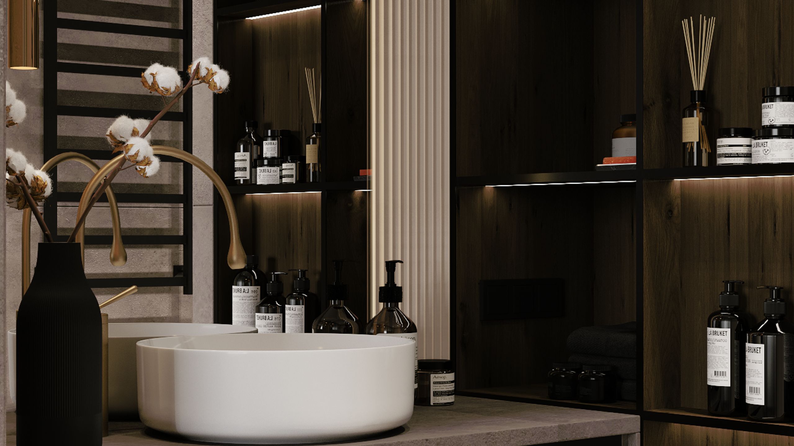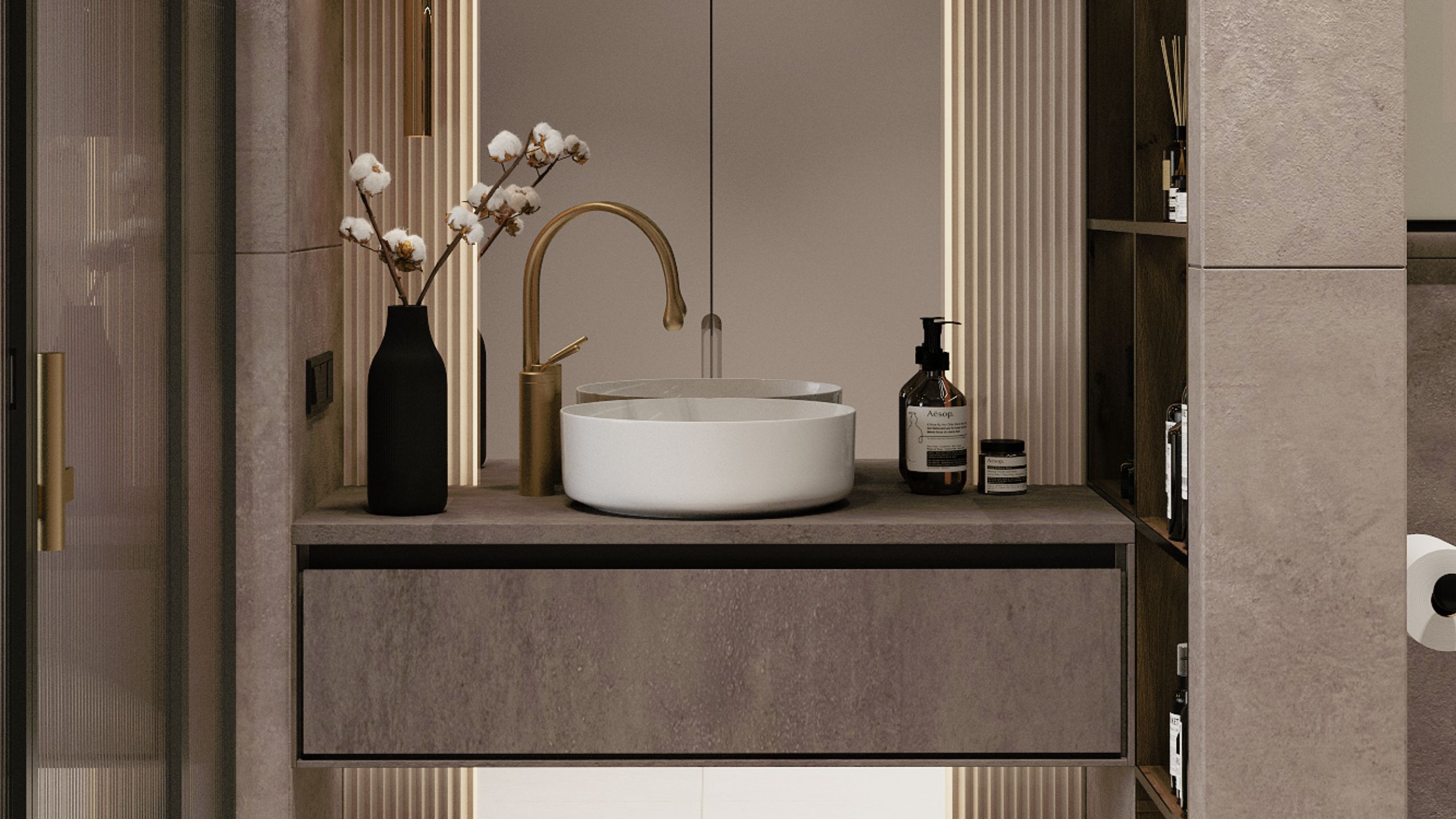 В июле 2022 года в студию Алексея обратилась девушка, молодая бизнес-леди. Ее главным пожеланием было создать женственный интерьер для квартиры, наполненный эстетичными элементами. Сегодня герой большого проекта - санузел. Для отделки этого помещения Алексей выбрал керамогранит, две контрастных коллекции Traffic и Luna. Первая коллекция с ярко выраженной текстурой бетона придала санузлу изюминки, сделала пространство более "пикантным", а коллекция Luna с более нейтральным цветом подчеркнула необычные декоративные элементы.