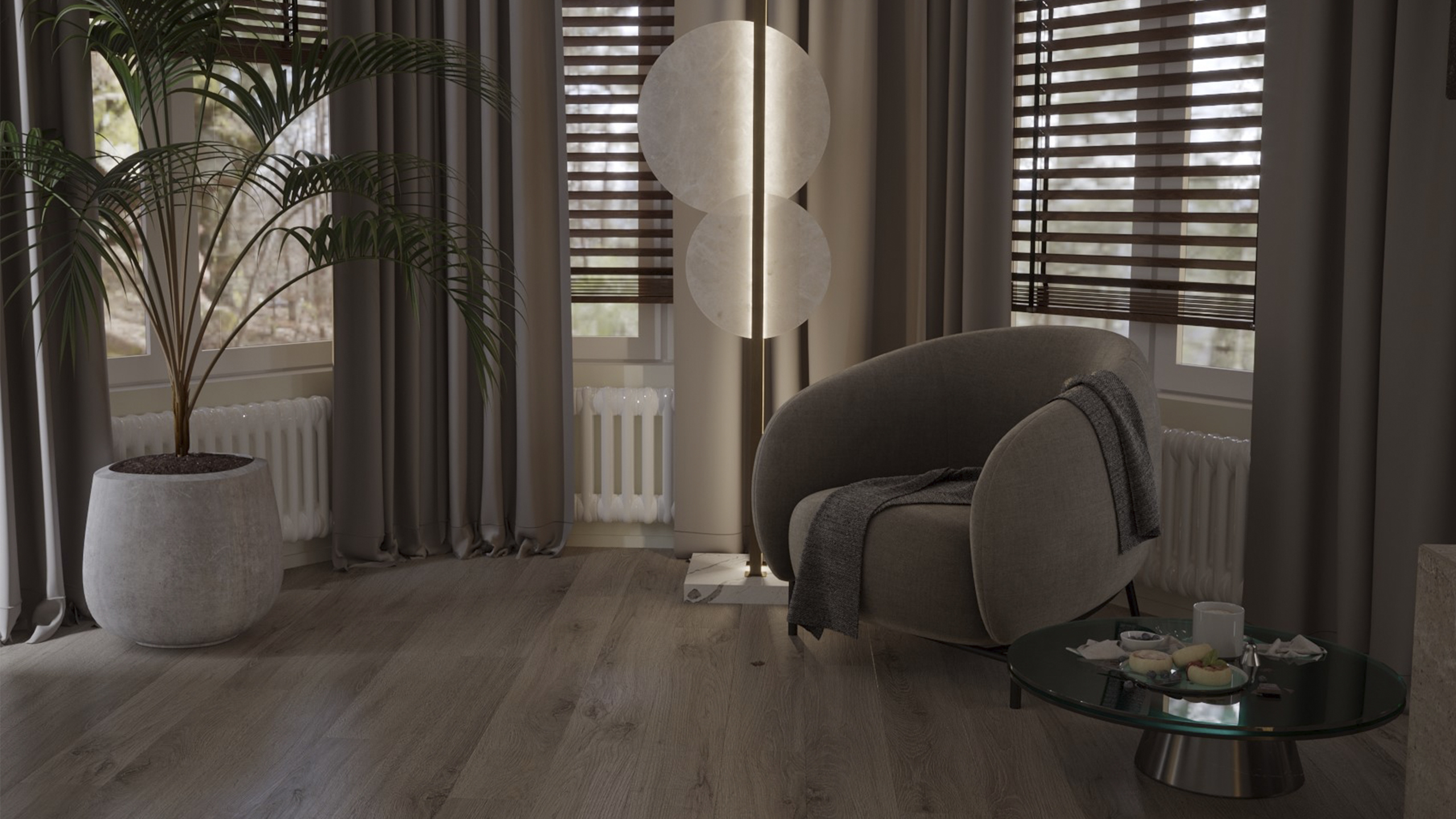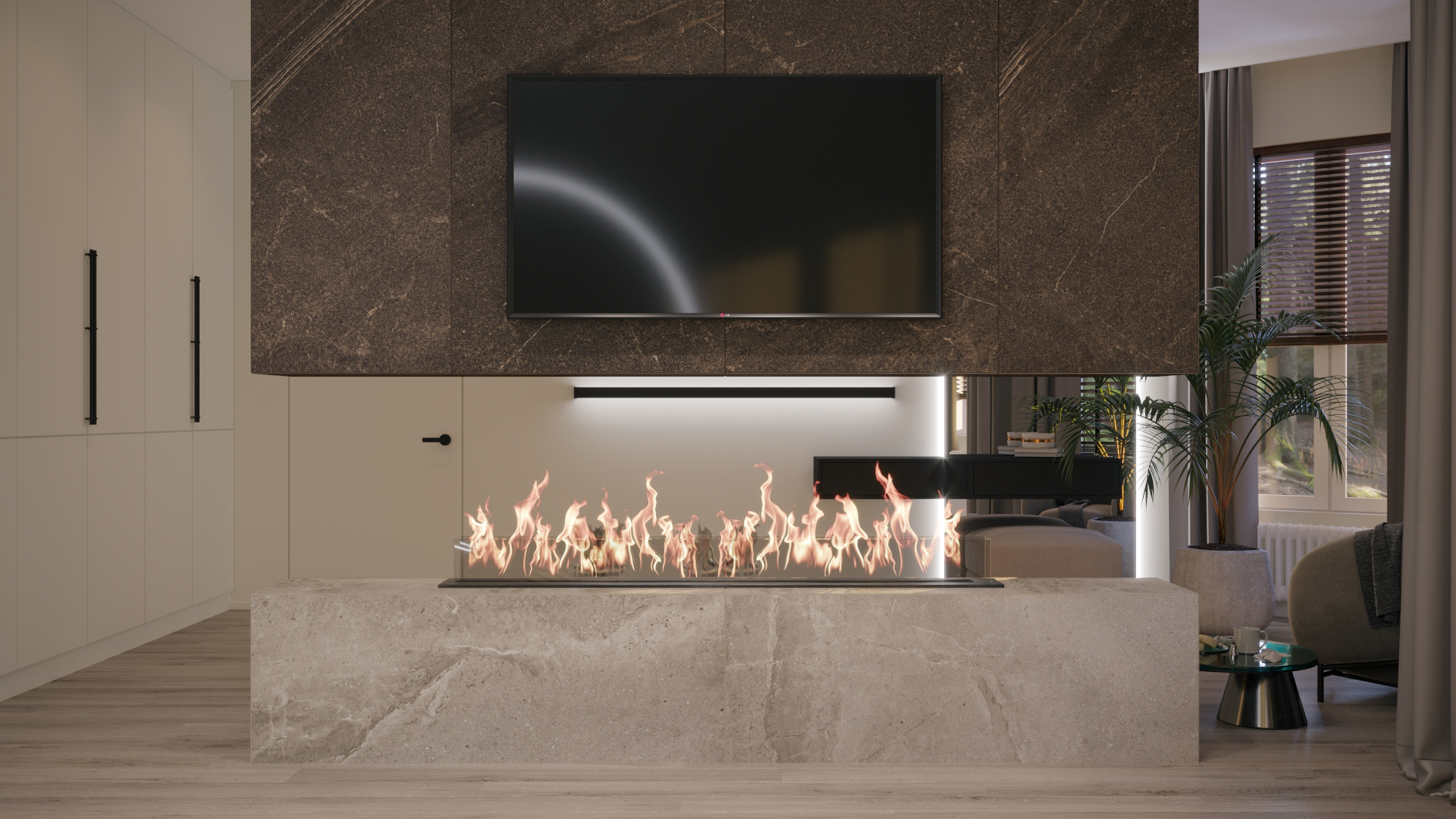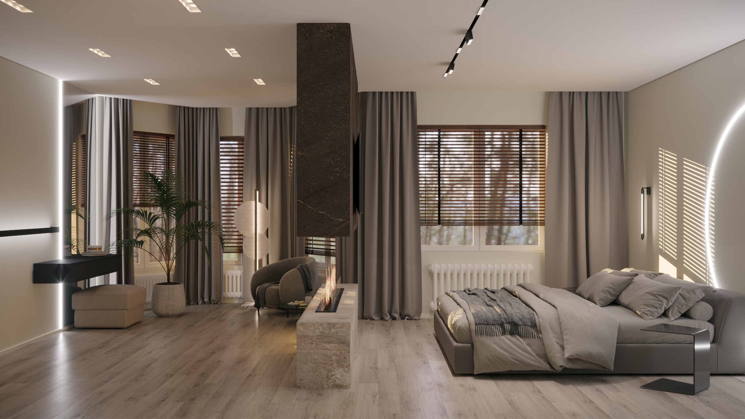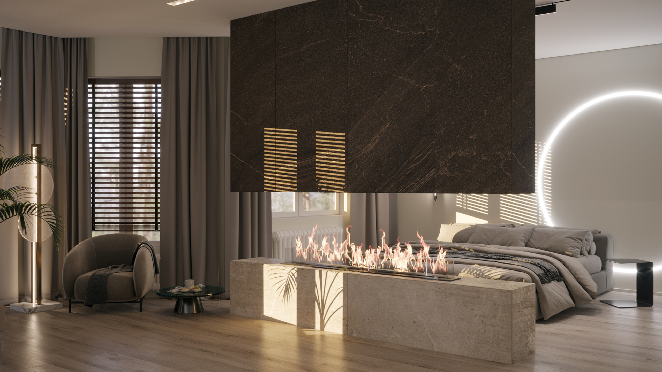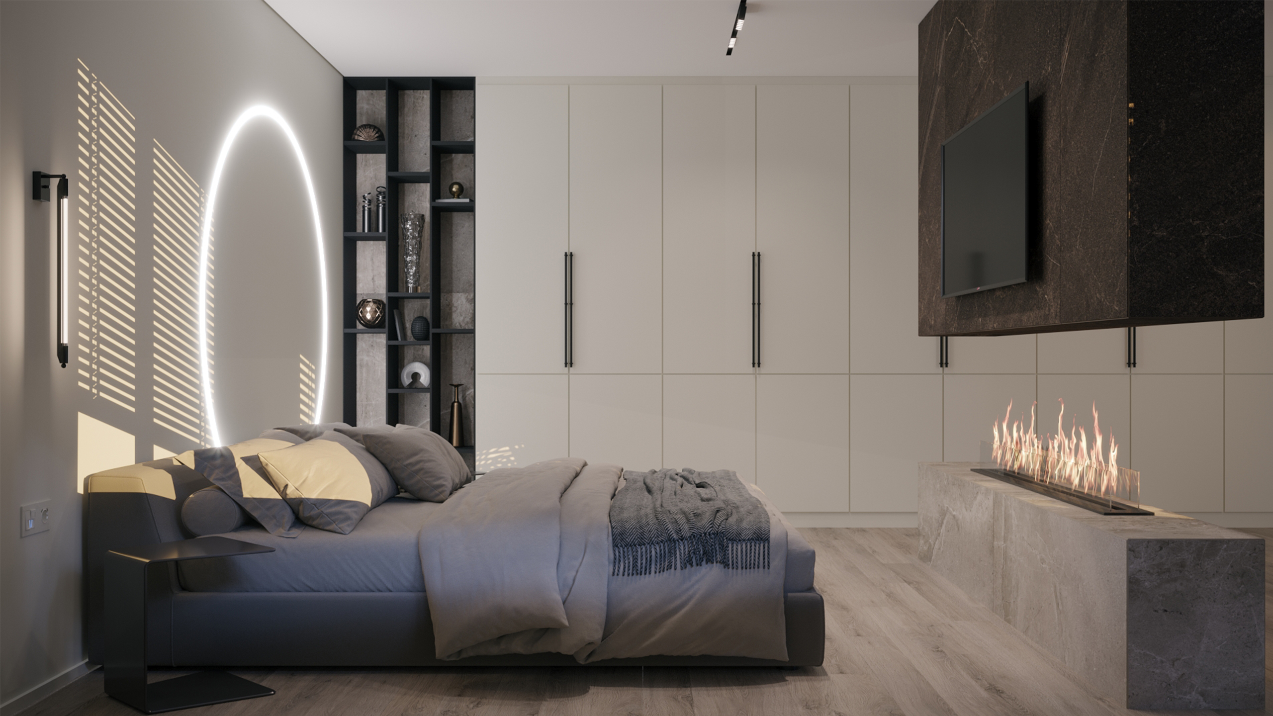 Современная спальня в минималистичном стиле от победительницы конкурса Керамогранит в Архитектуре дизайнера Татьяны Ноздриной. Сердце спальни - уютный камин, который за счёт необычной межкомнатной перегородки виден из любой точки комнаты, он же является главным акцентом помещения. На контрасте с тёплым и уютным очагом выступает отделка перегородки крупноформатным керамогранитом под натуральный камень, что создаёт эстетическую целостность всего интерьера.