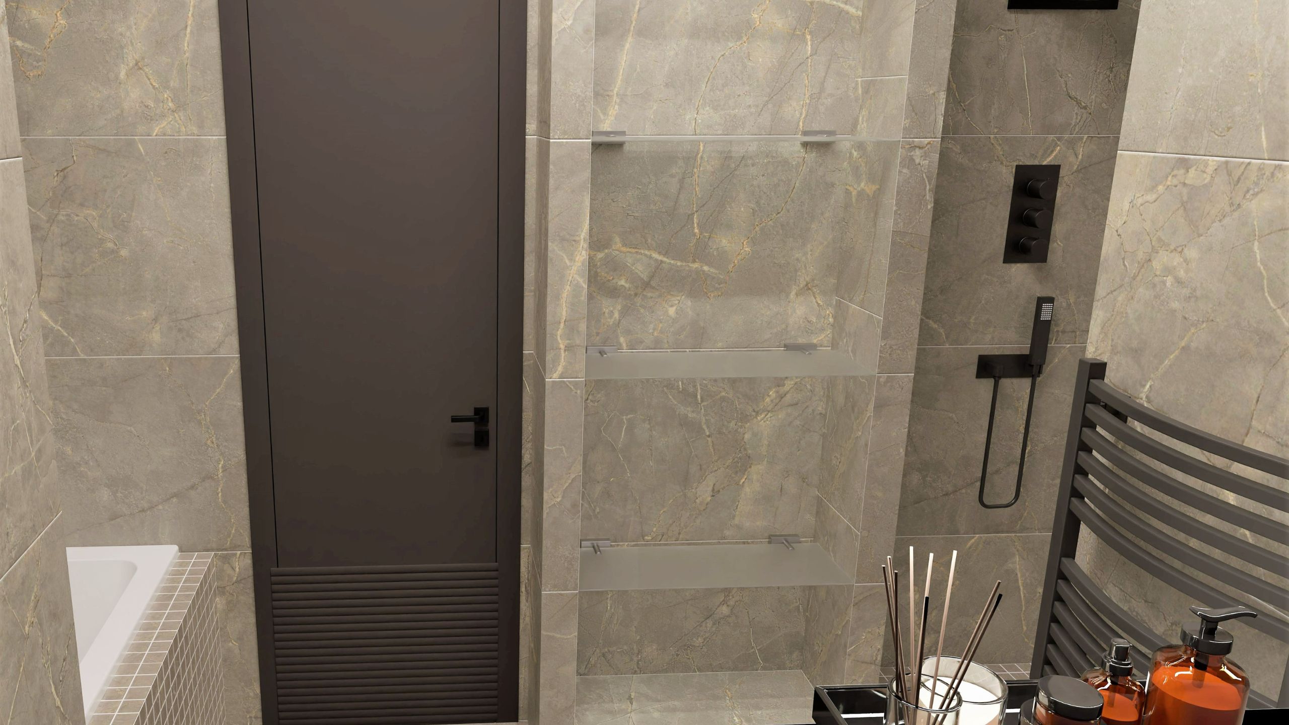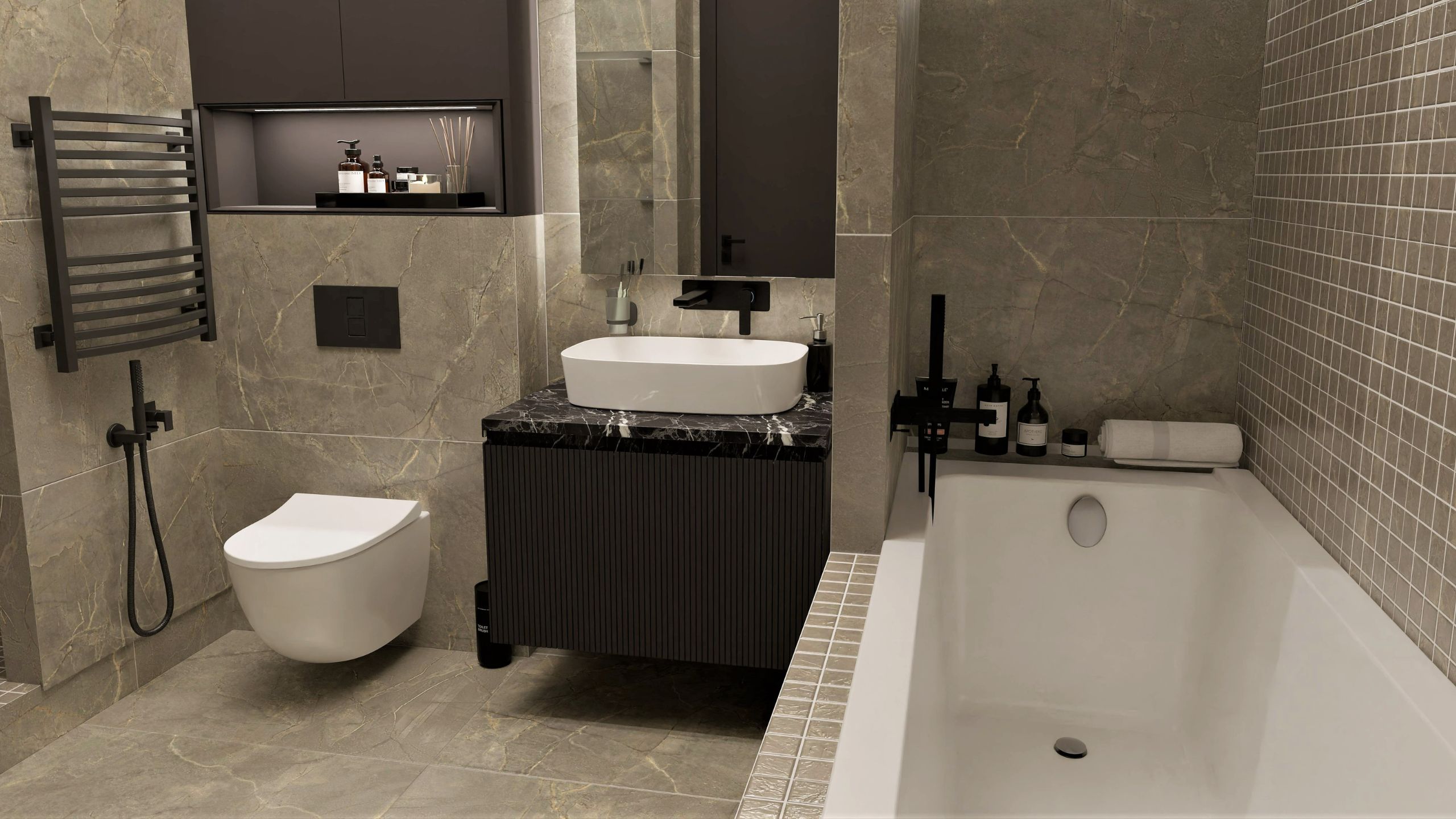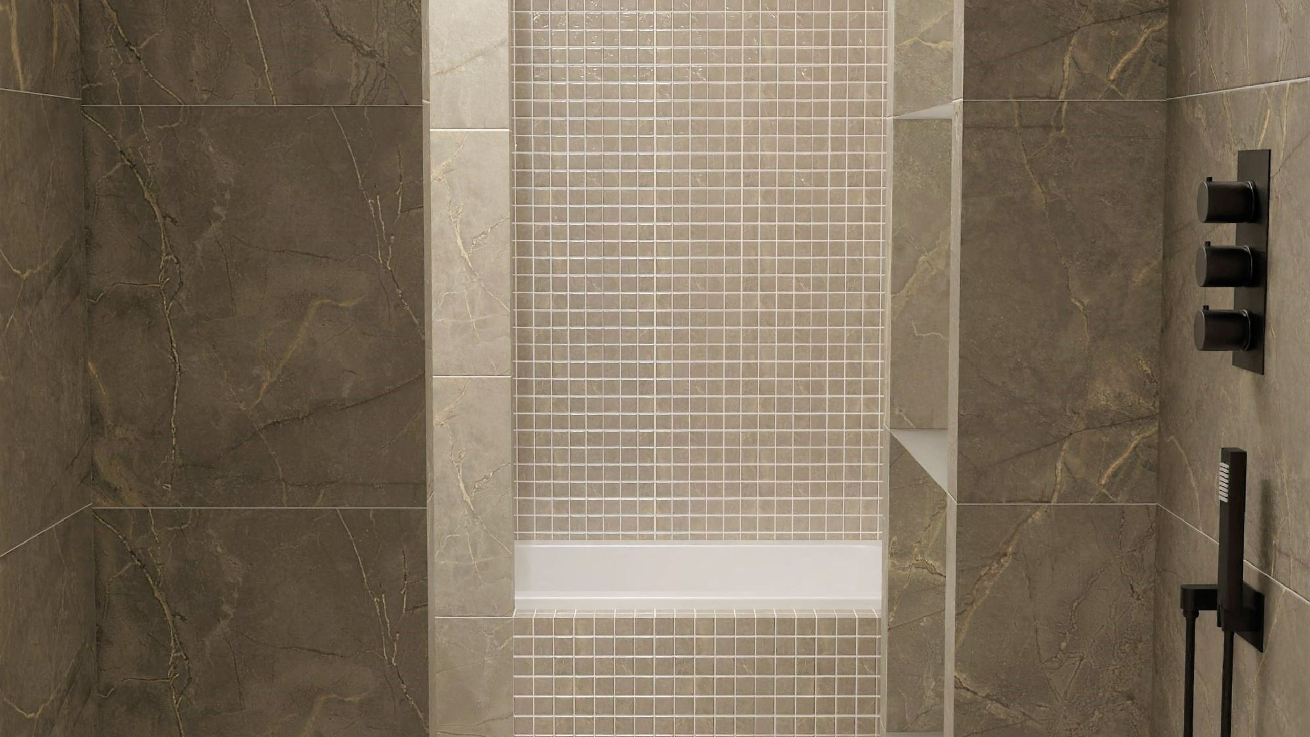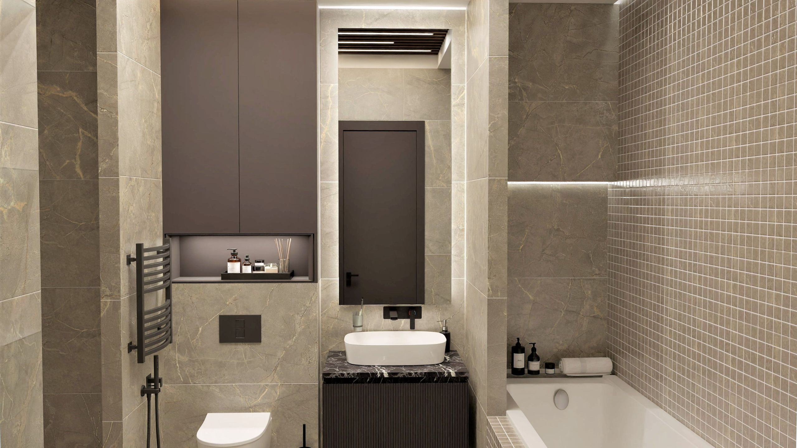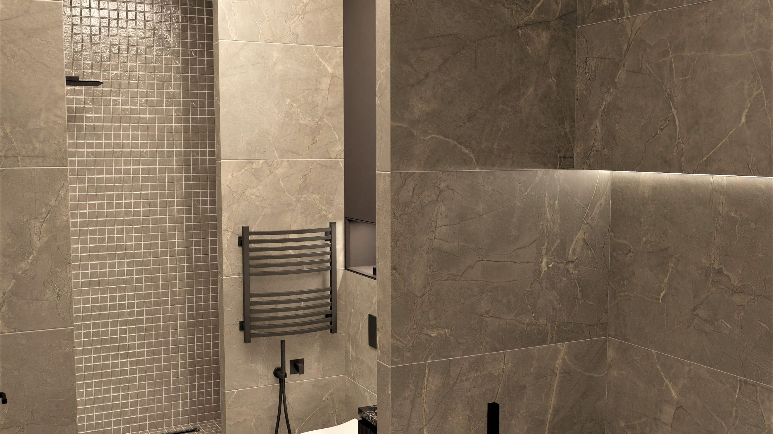 Дизайн-проект с использованием мозаики ™Estima в ванной комнате был создан Екатериной Нак. Пространство, выполненное в теплых, мягких тонах, помогает погрузиться в приятную расслабляющую атмосферу. Стена, покрытая керамогранитной мозаикой из коллекции Bernini, вносит разнообразие в интерьер и придает ему статусности.