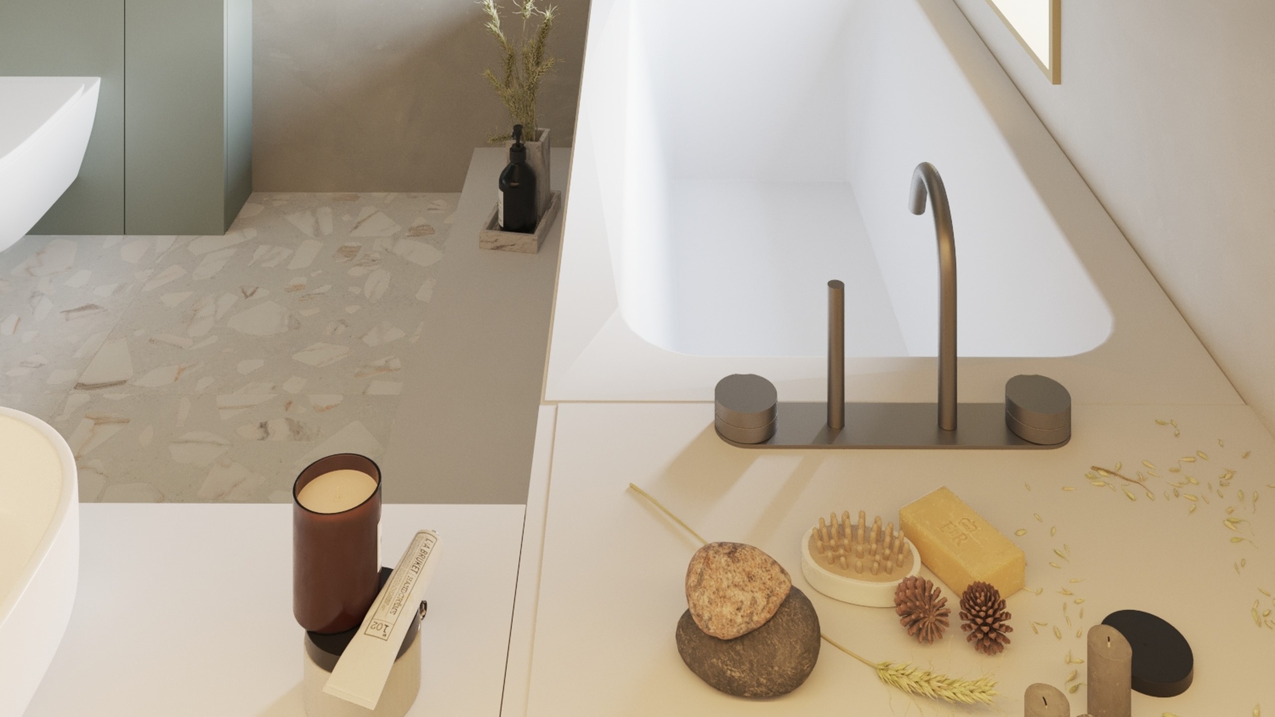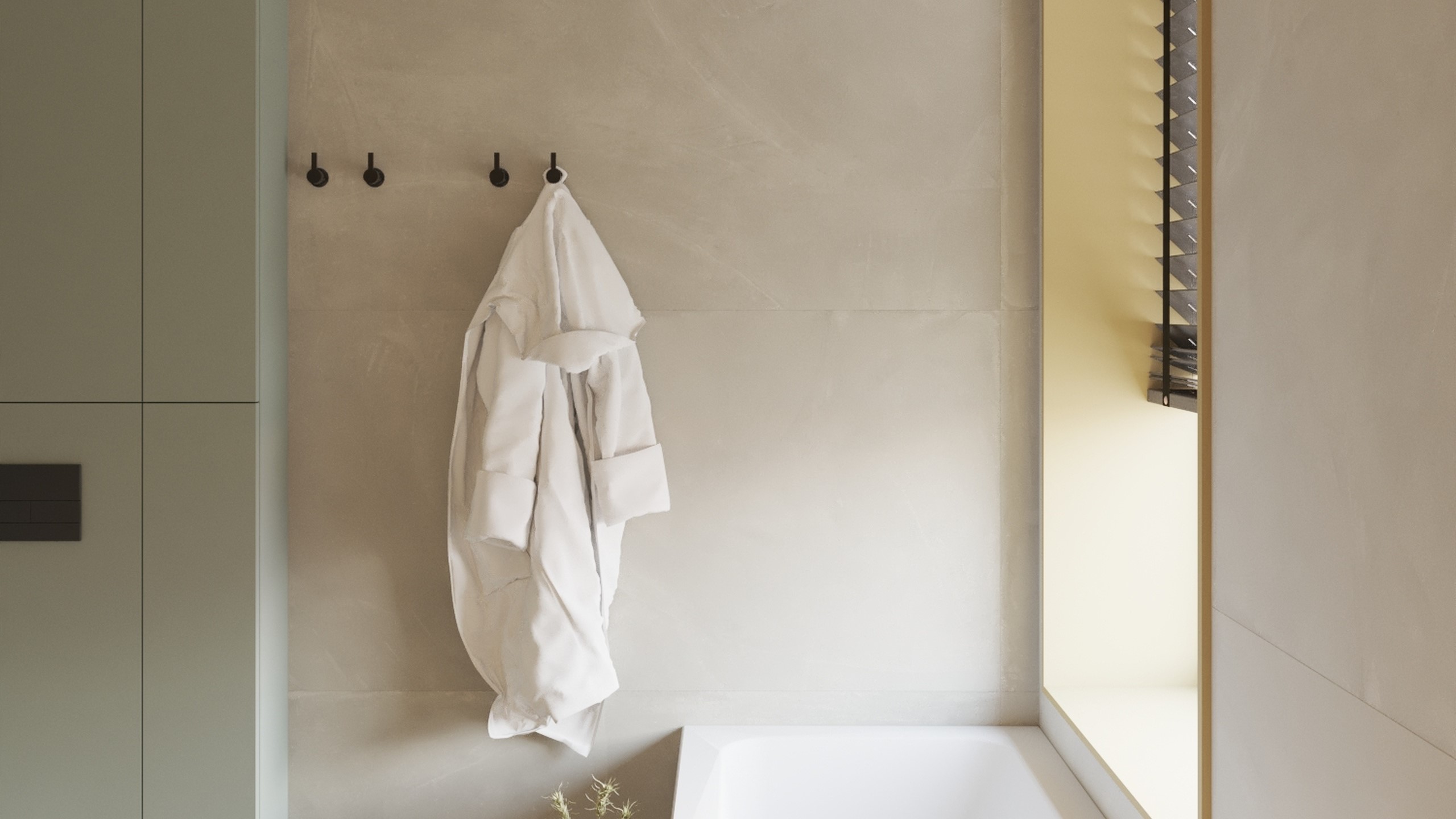 Ванная комната, созданная Михаилом Зиминым, выстроена вокруг ощущения тишины и равновесия. Мягкая палитра и тактильные поверхности создают атмосферу спокойствия.