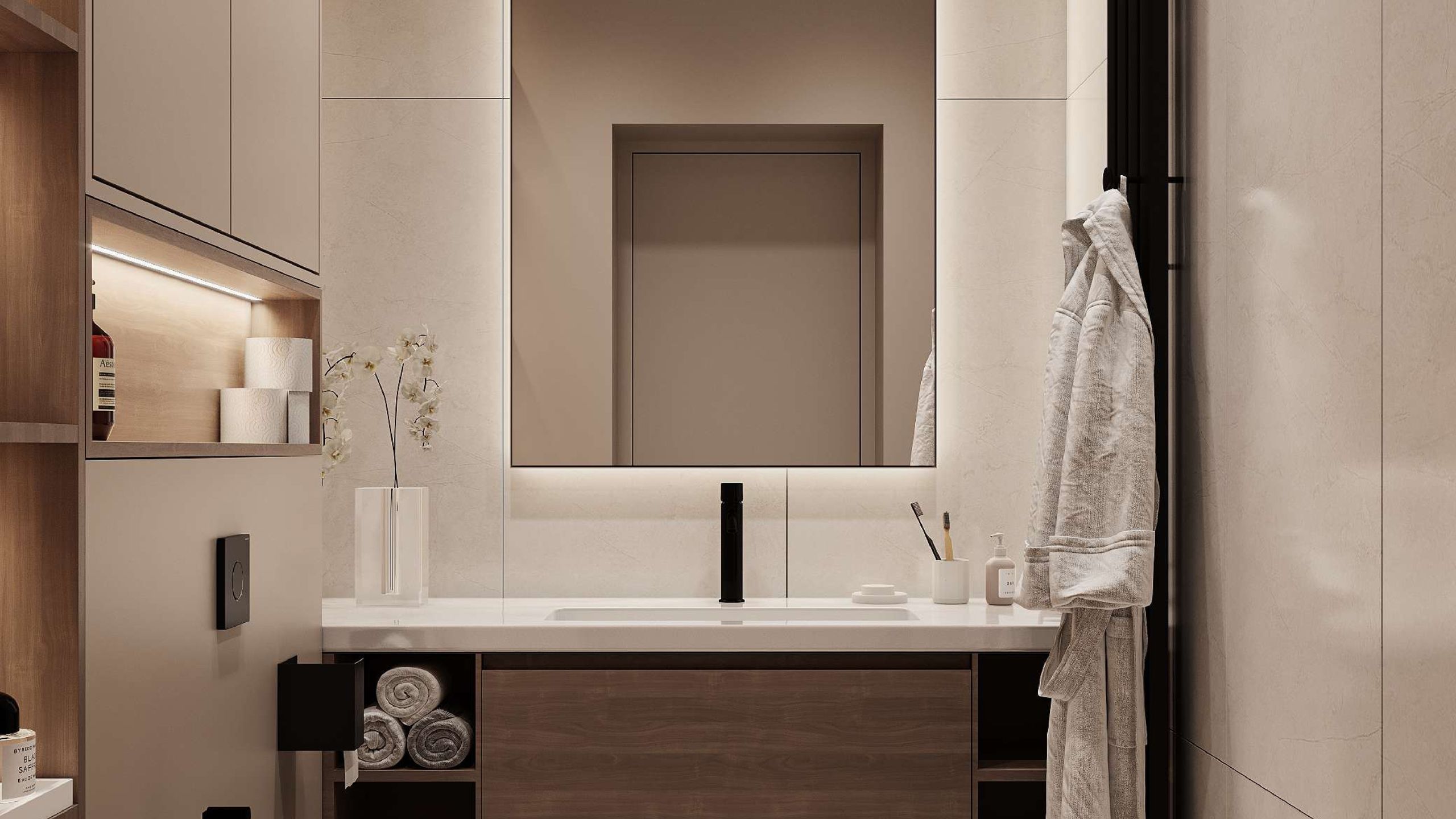 Интерьер частного жилого дома - это про особую связь с природой, про простые и функциональные пространства с большим количеством воздуха, света и максимум экологичности в выбранных материалах. Песочные, природные оттенки стен и керамогранита в гостевом санузле и «мраморный» керамогранит на фартуке кухни (прим.ред. - об этом пространстве мы рассказывали в предыдущем материале) объединяют пространство, создавая единый стиль и идею всего проекта. Камень, дерево, мраморный рисунок, льняные ткани в декоре - это про любовь к природе и экологичности в ремонте.