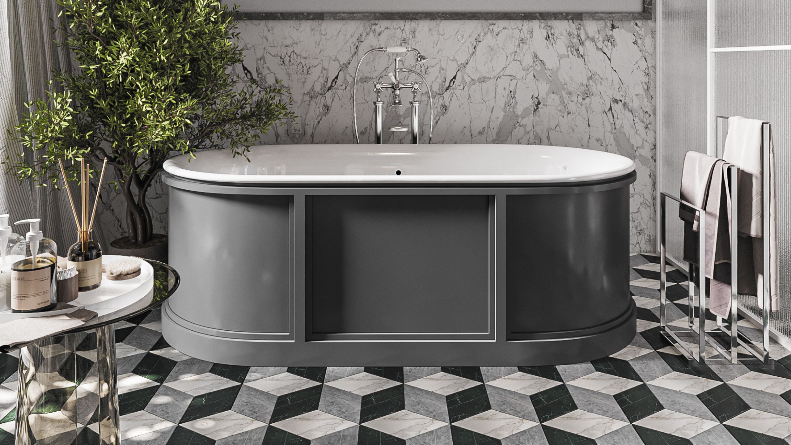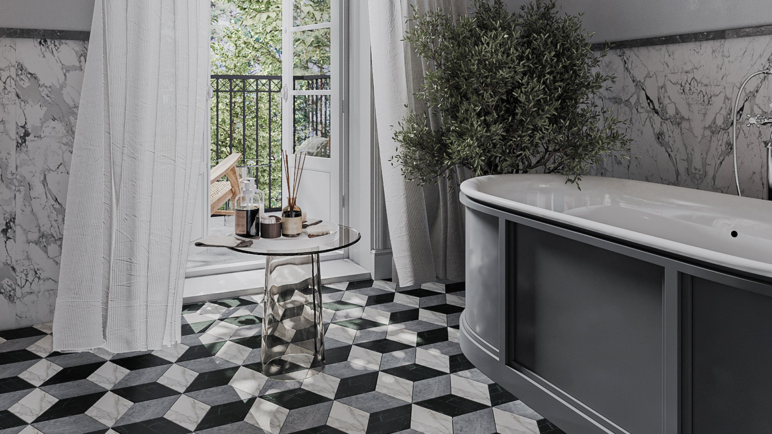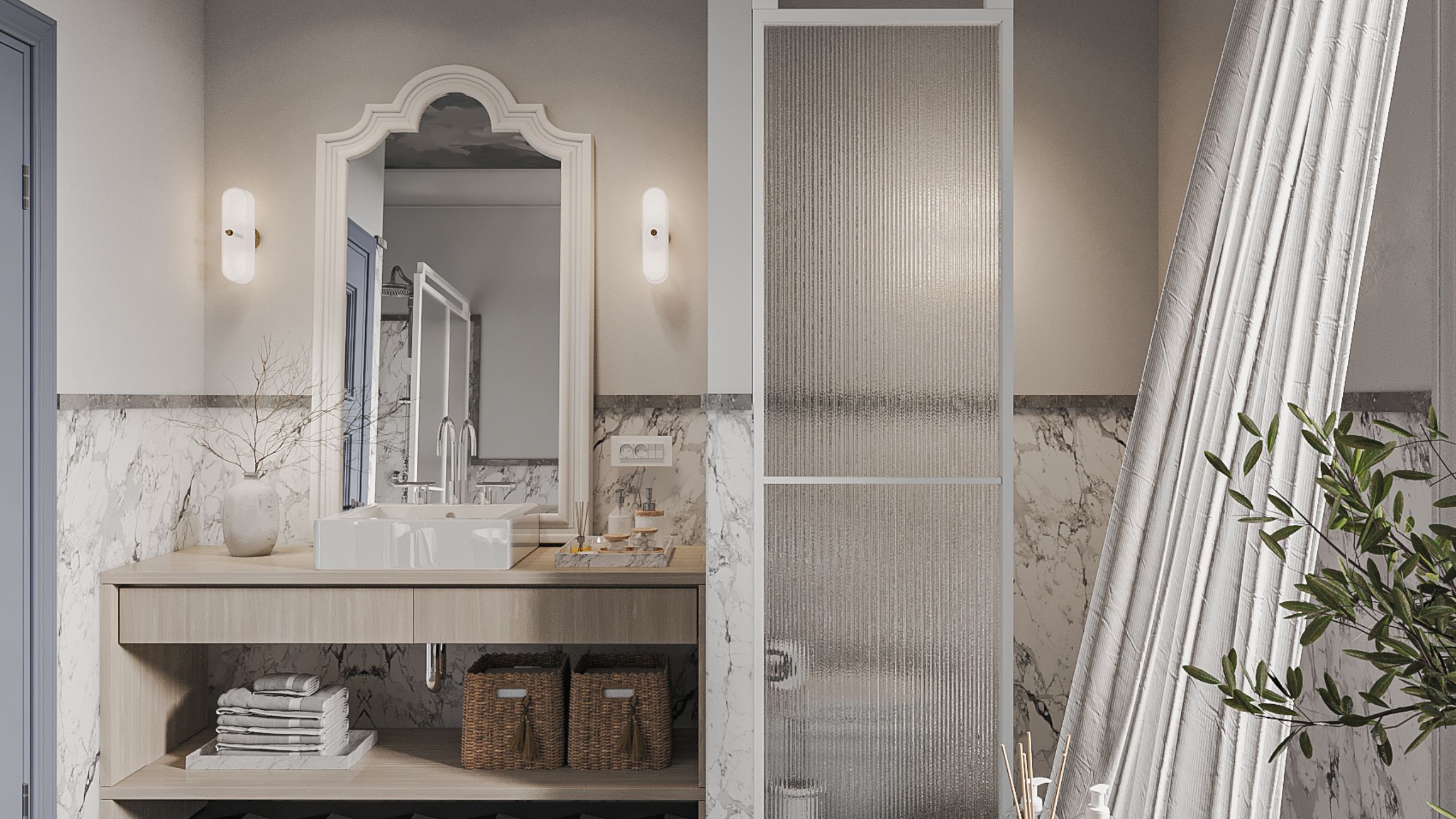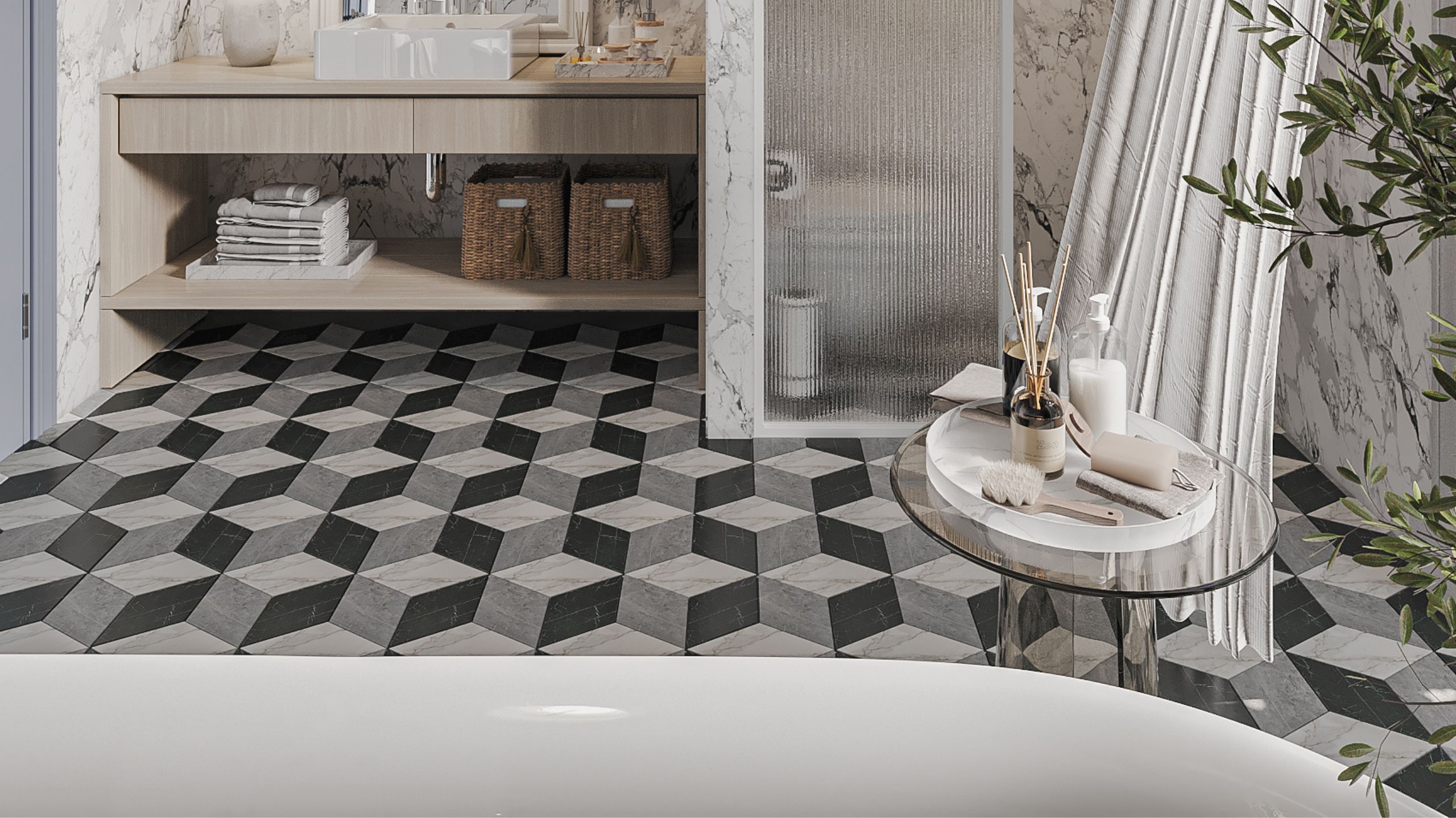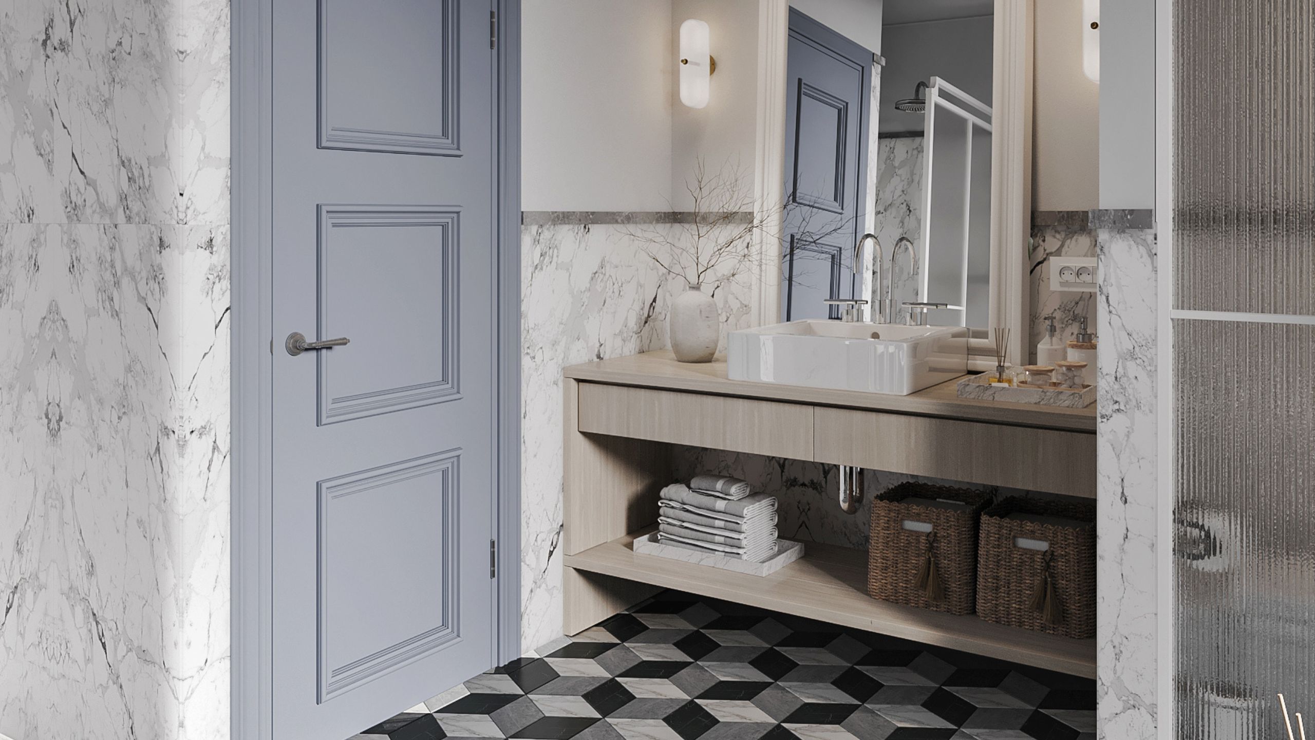 Интерьер ванной заслуживает отдельного внимания. Отделка пространства очень разнообразна: пол выложен мозаикой Cube из коллекции Vision, а стены отделаны 50/50 краской и керамогранитом из коллекции Marble. Главное, что объединяет эти покрытия, так это имитация благородной мраморной поверхности.