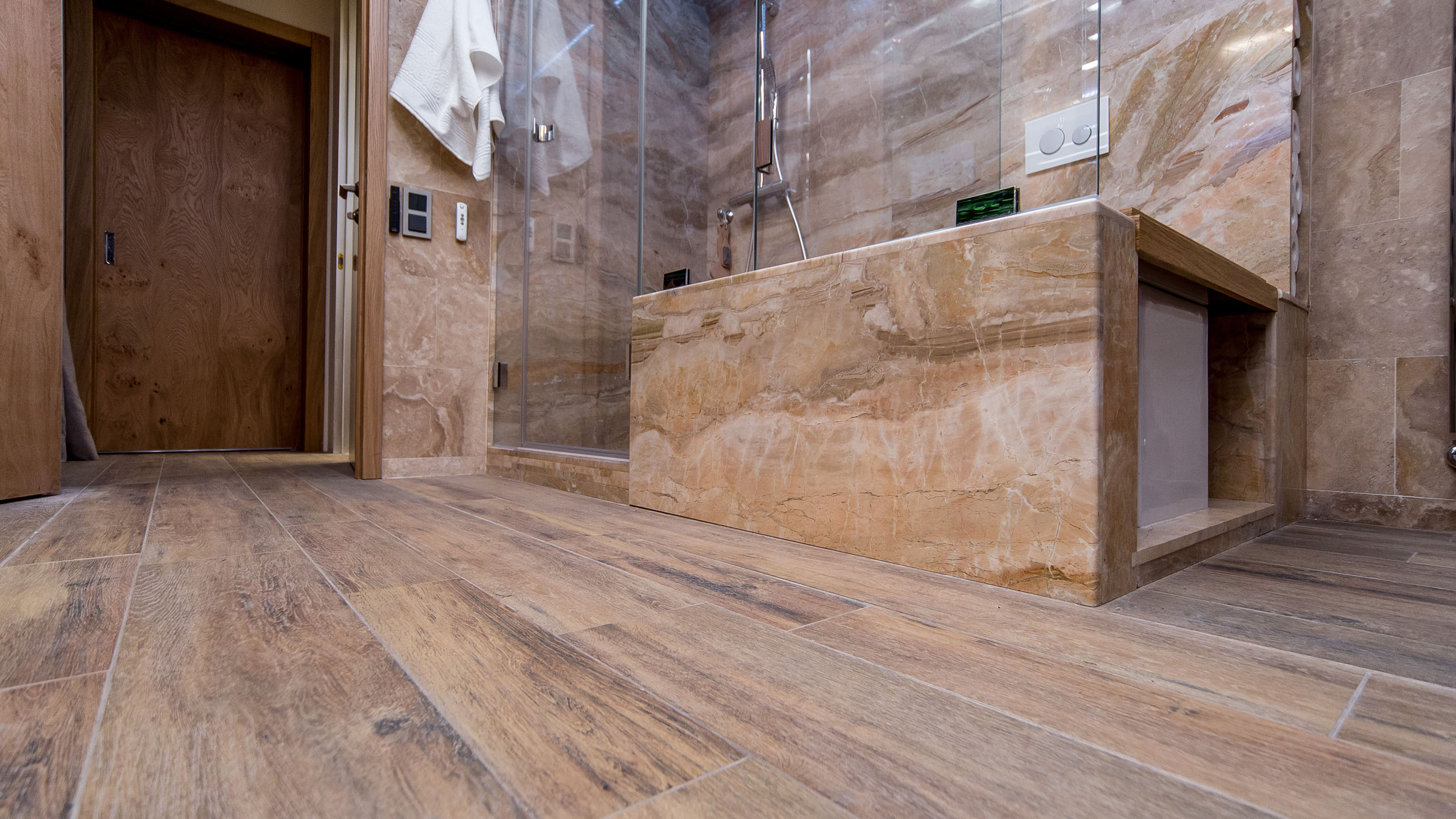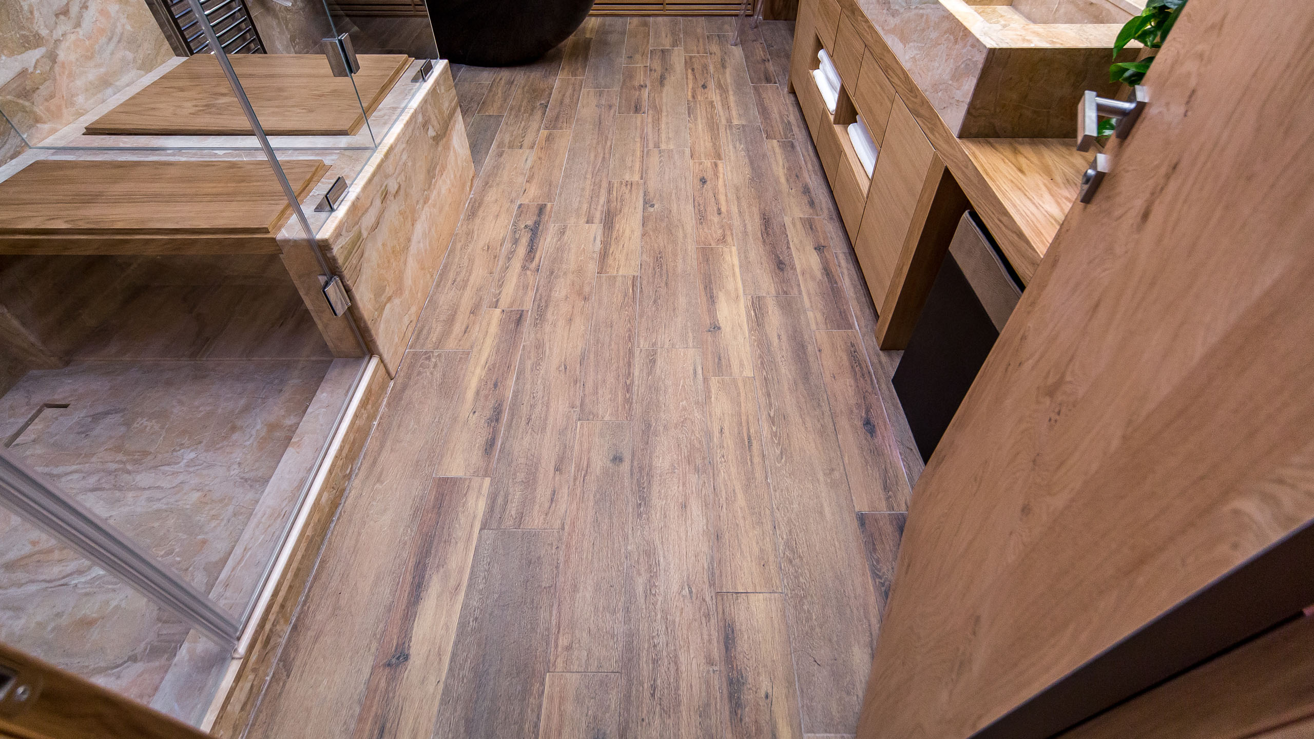 Фитованная, подготовленная программой «Дачный ответ» в оттенках натурального дерева. Керамогранит — отличный выбор для такого проекта, потому что ему не страшны перепады температуры и влажность помещения.