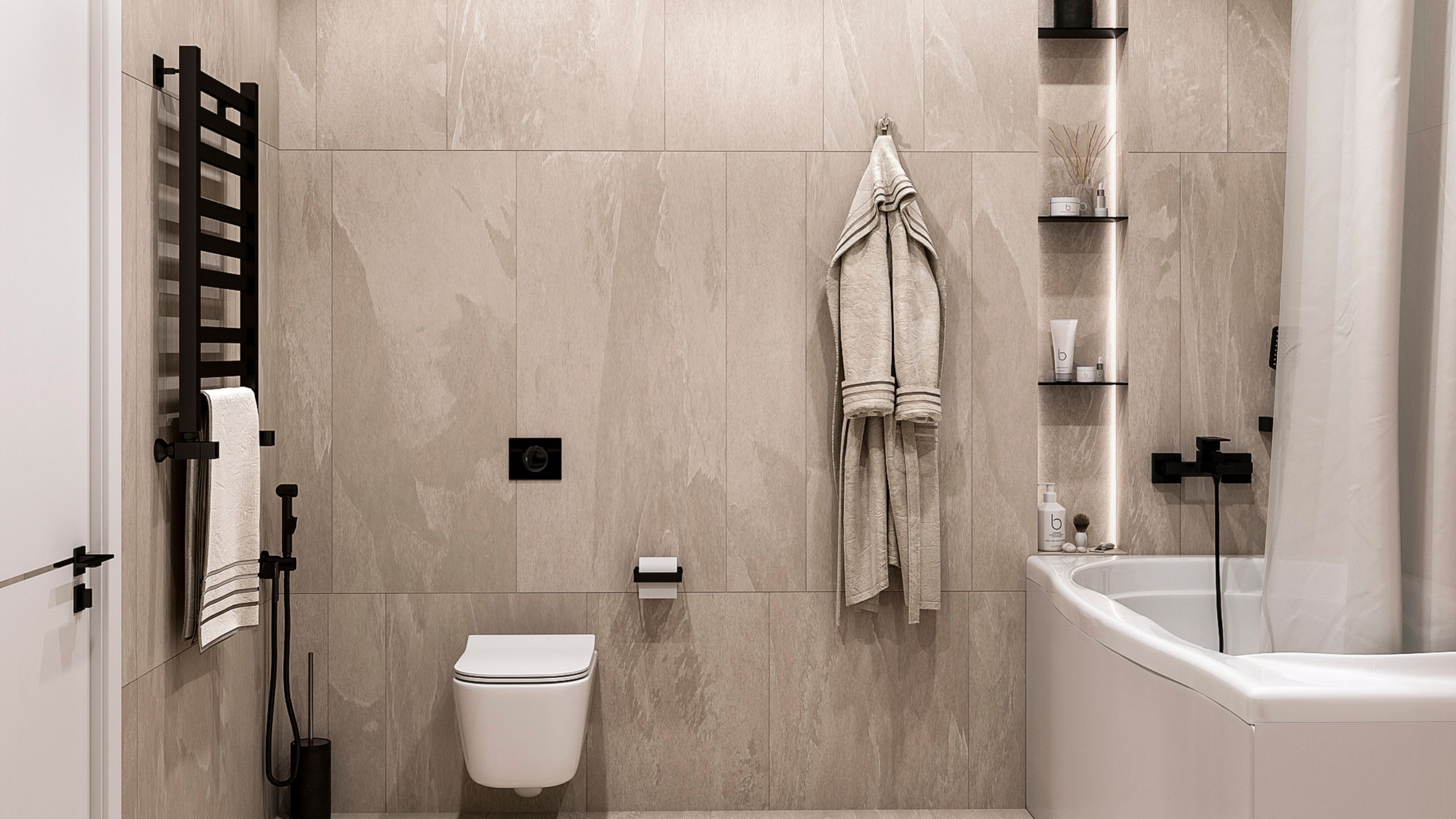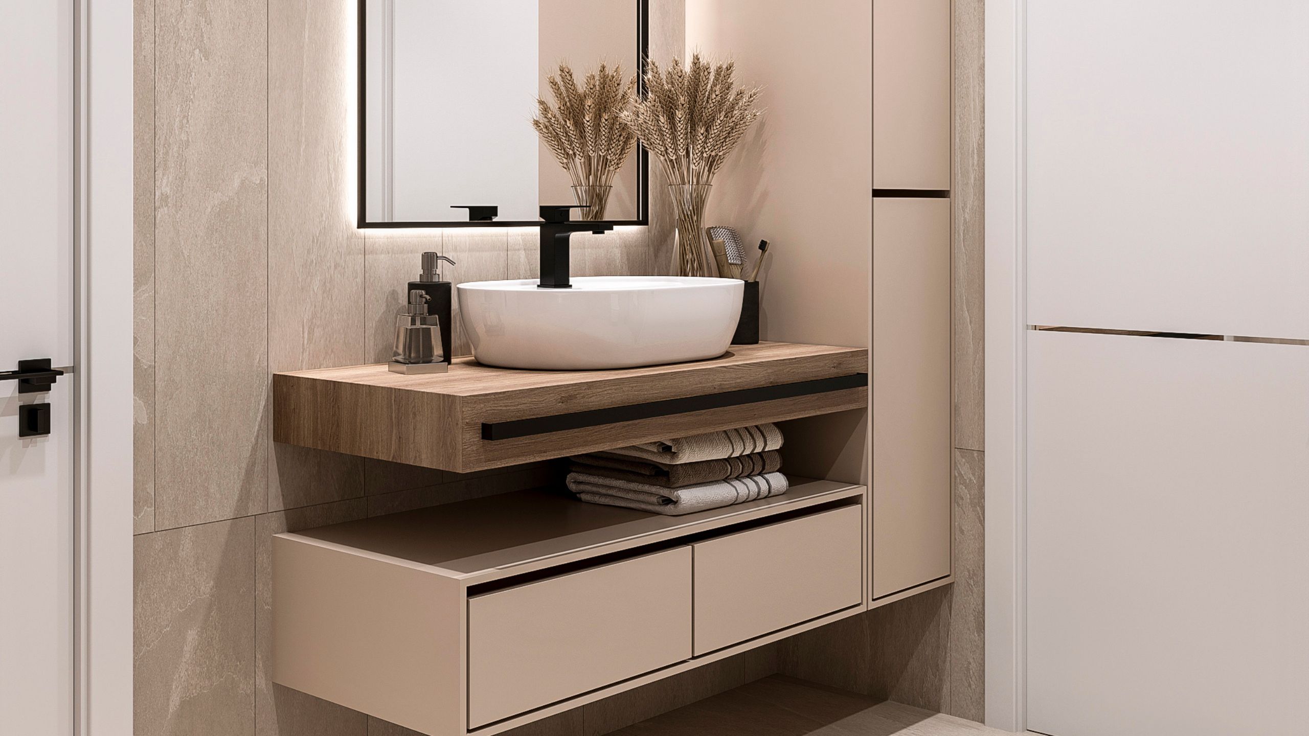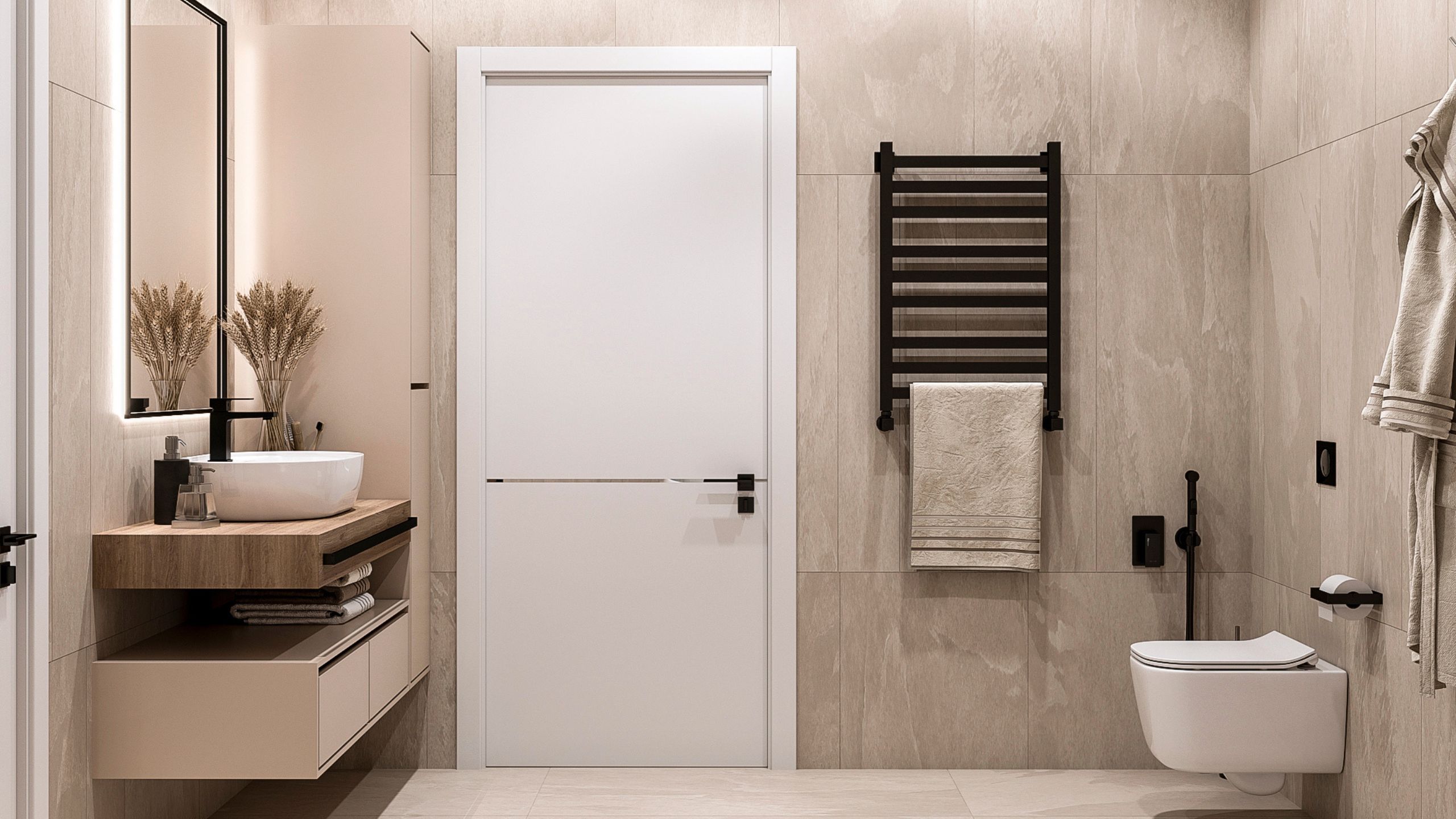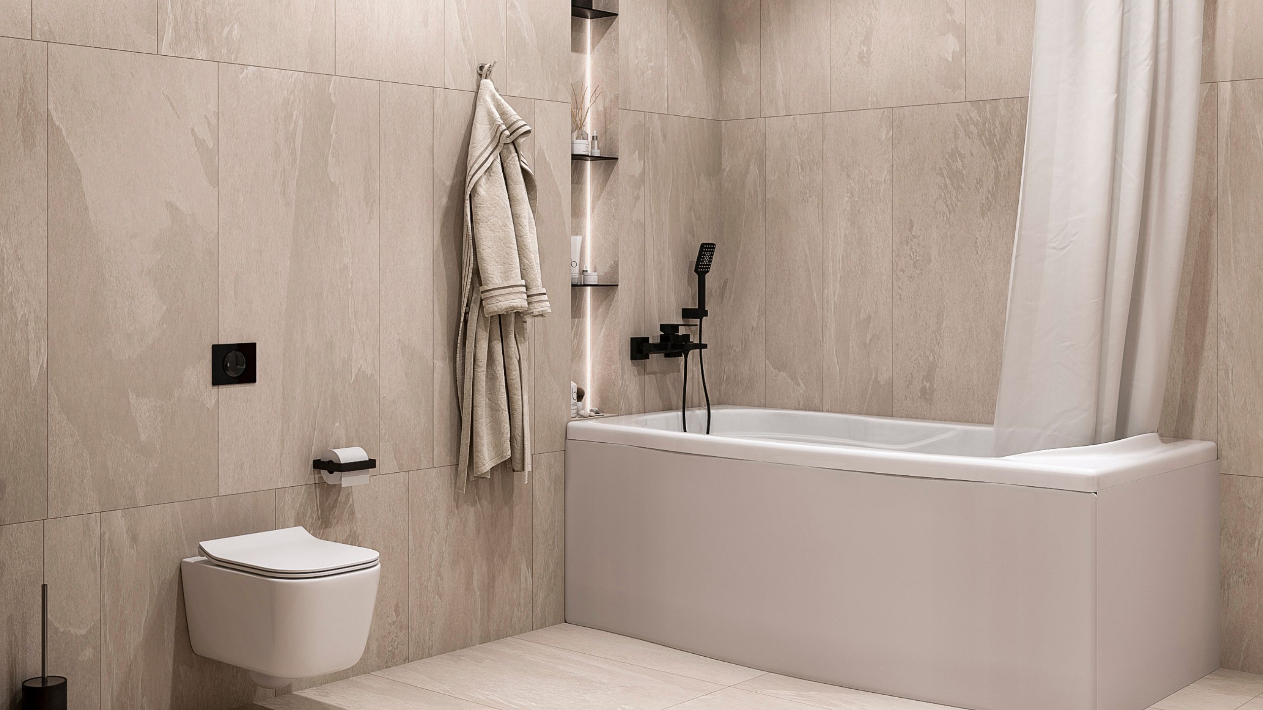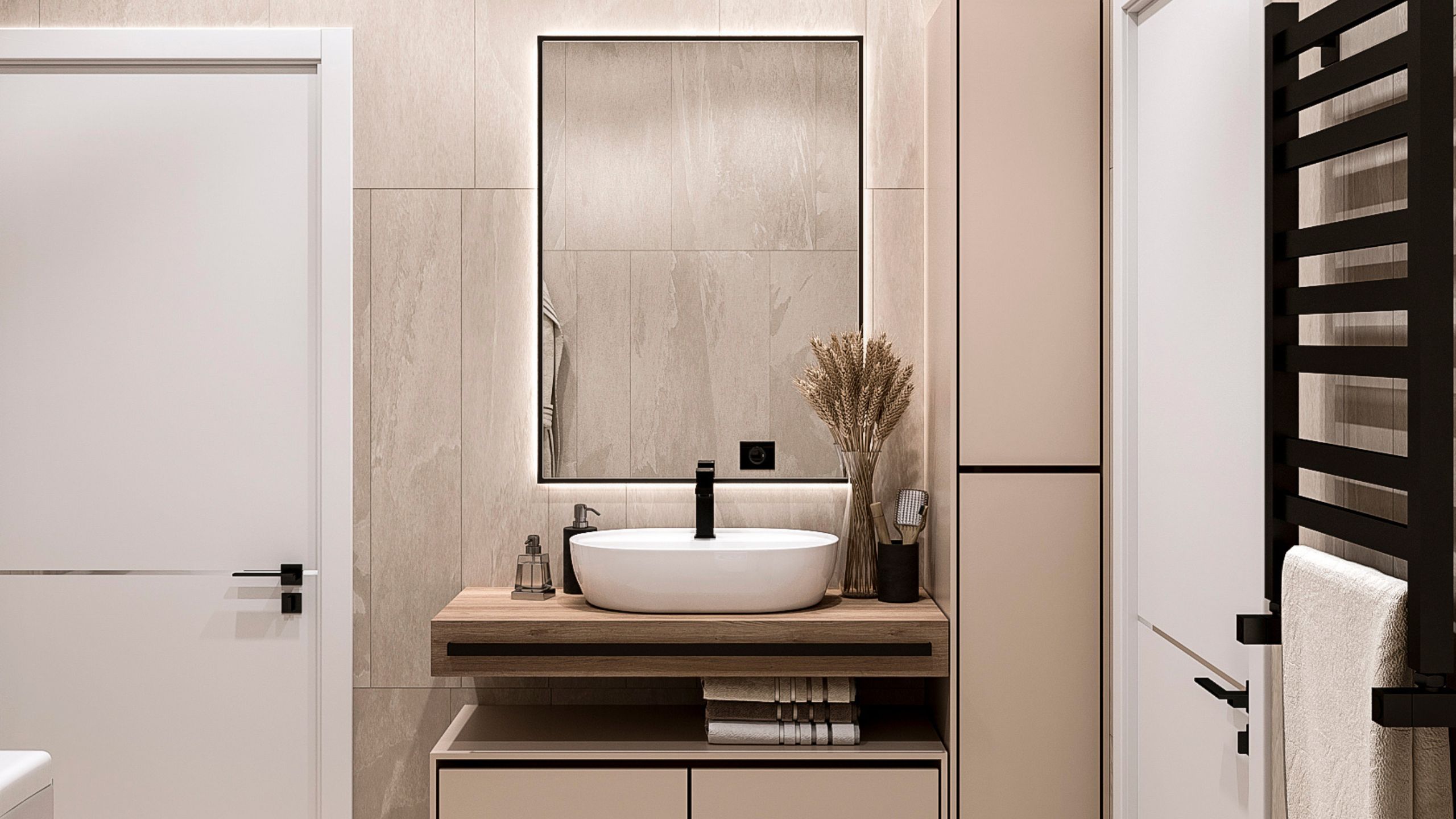 Нежный интерьер ванной комнаты по проекту Дарьи Алтуховой — любовь с первого взгляда. Монохромная отделка, необычная игра света и красивые аксессуары, которые делают пространство эстетичным. За основу дизайнер взяла керамогранит из коллекции Terra. Благодаря рисунку на плите и приятной текстуре, получается сатиновое покрытие, которое служит идеальным фоном для акцентных: мебели и предметов декора.