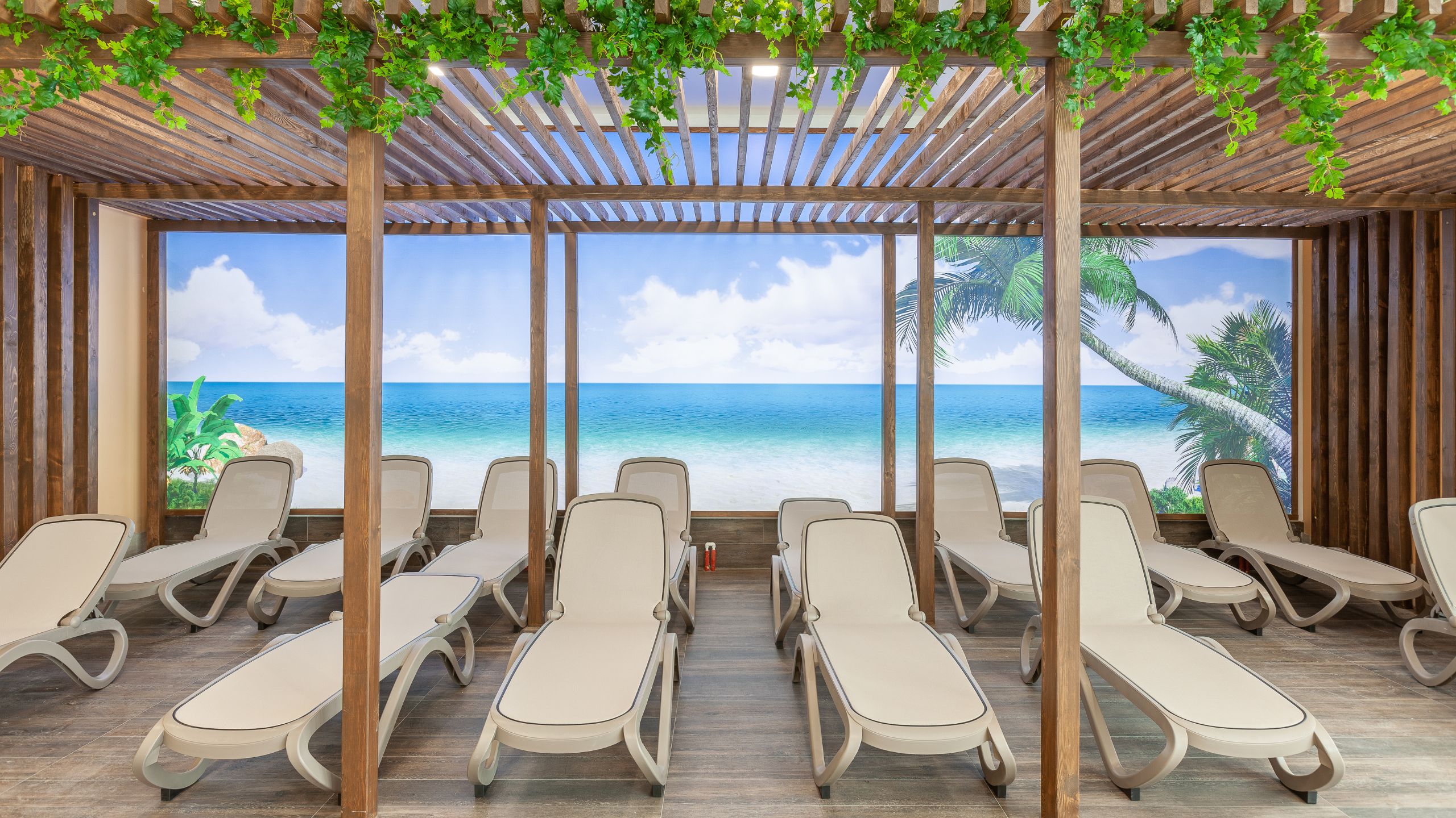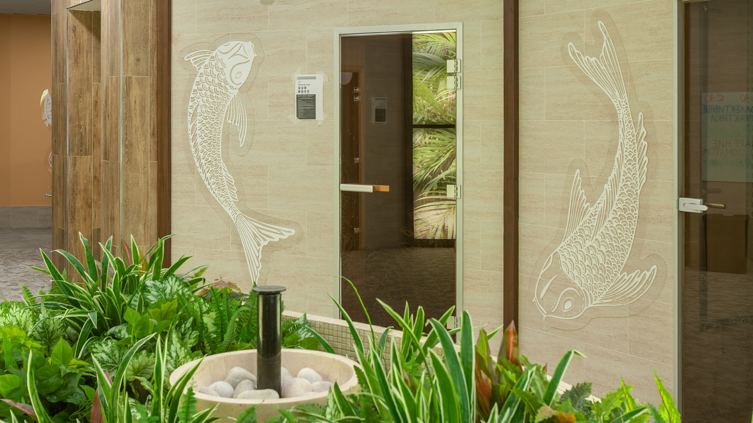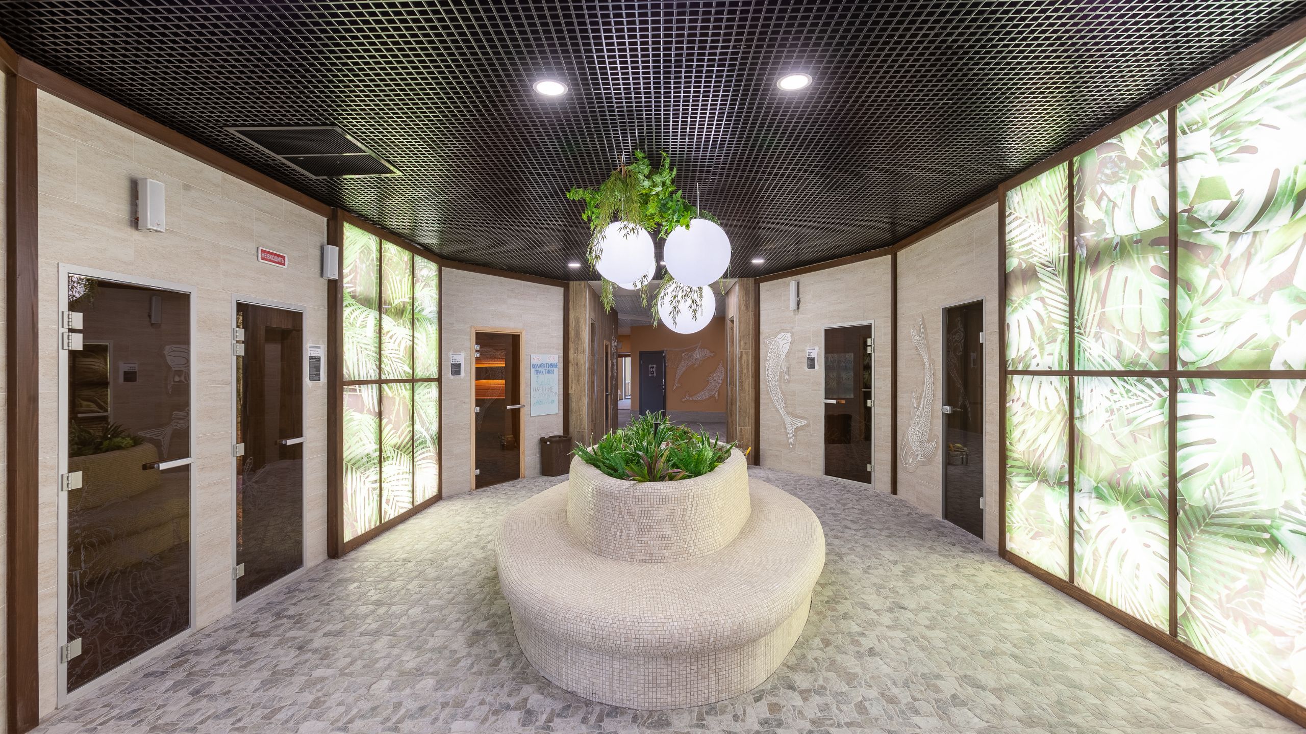 Для внутренней отделки выбрали микс коллекций Jazz и Artwood, дабы придать курорту уютную атмосферу. Природные мотивы прослеживаются и в декоративных элементах: деревянные настенные вставки с растительным орнаментом, светильники из ротанга, плетеная мебель и много-много зелени. Такая обстановка действительно настраивает на отдых и расслабляет.