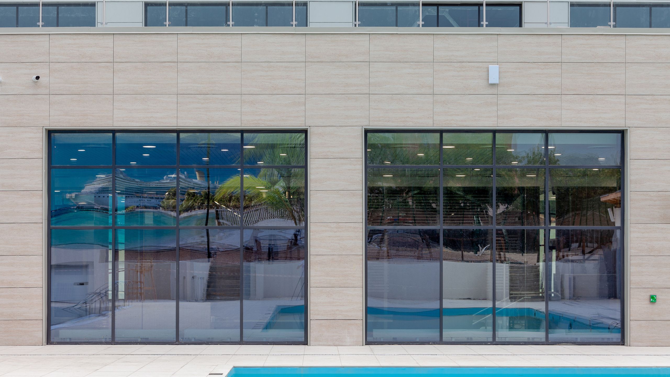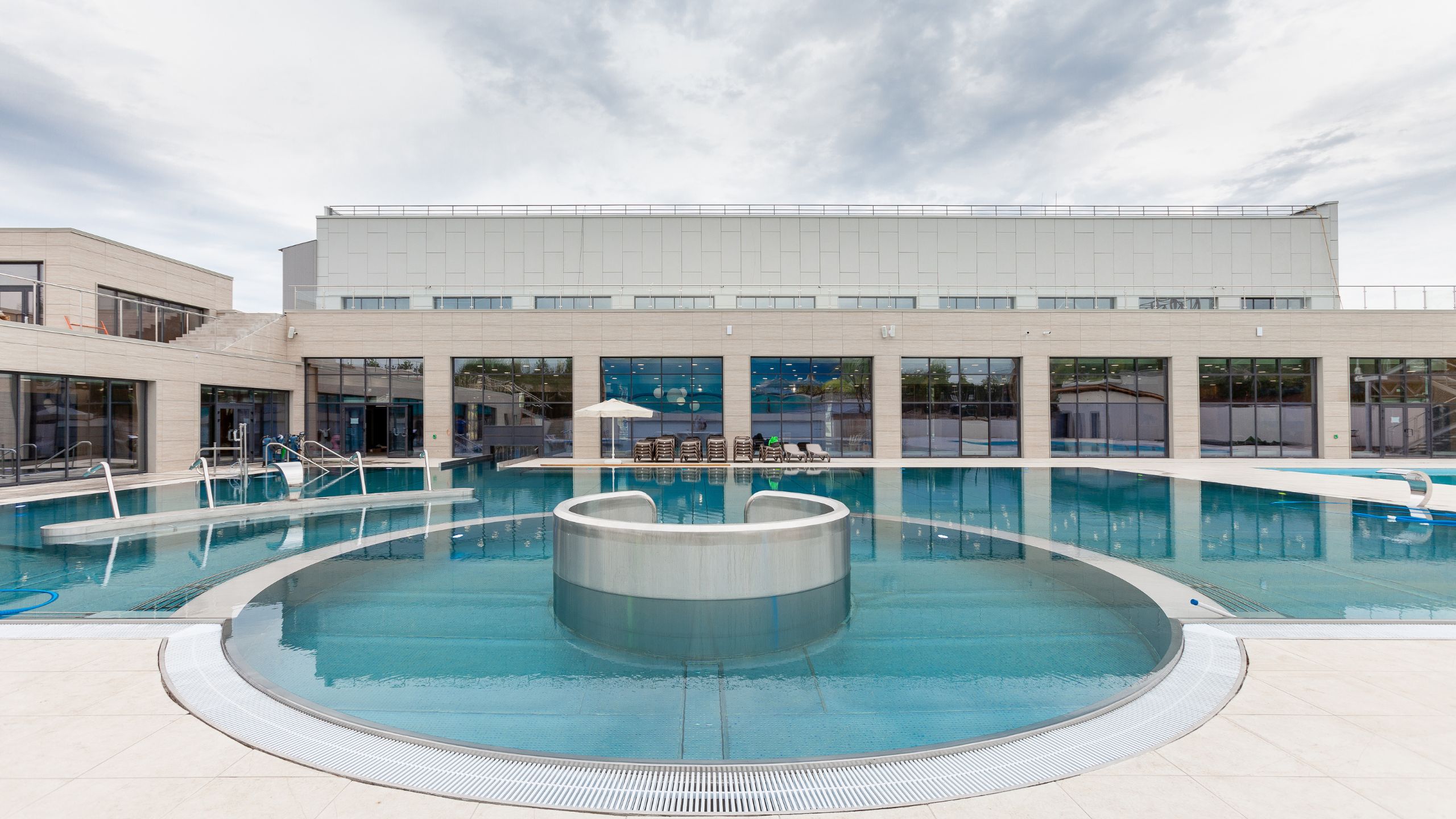 Комплекс нуждался в новом дизайне и повышении комфорта отдельных зон. Студия "АРХидея" проделала масштабную работу, создав дизайн открытых бассейнов, коридоров, душевых и одной зоны с крытым бассейном. Для отделки уличных фасадов и мокрой зоны дизайнер выбрала керамогранит из коллекции Jazz 60х120 см. Поверхности плит стилизованы под натуральный камень в серо-бежевой палитре и удачно вписываются в стиль пространства.