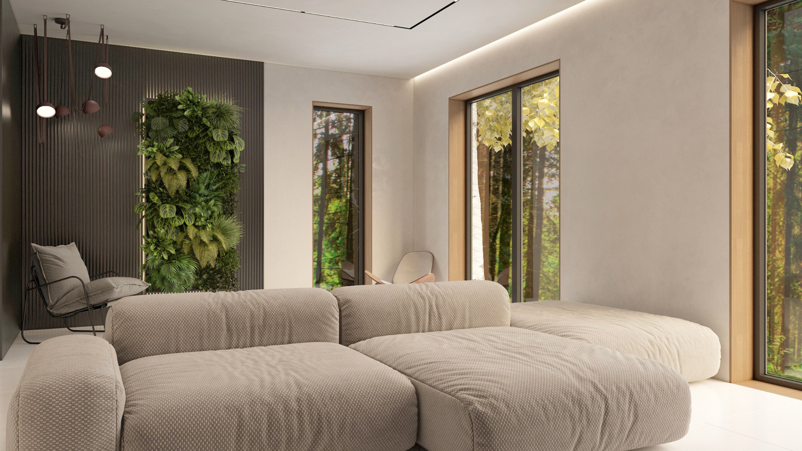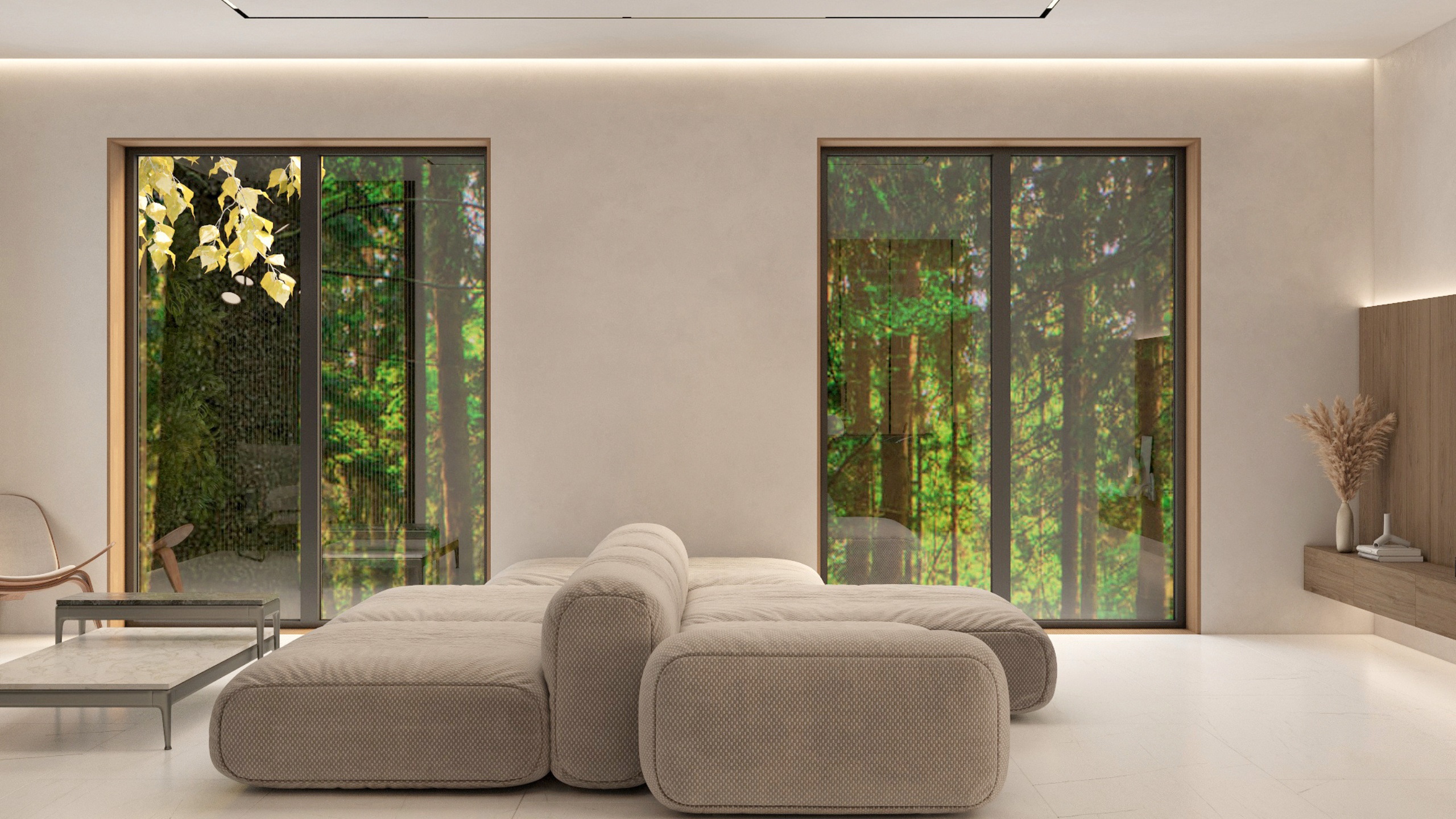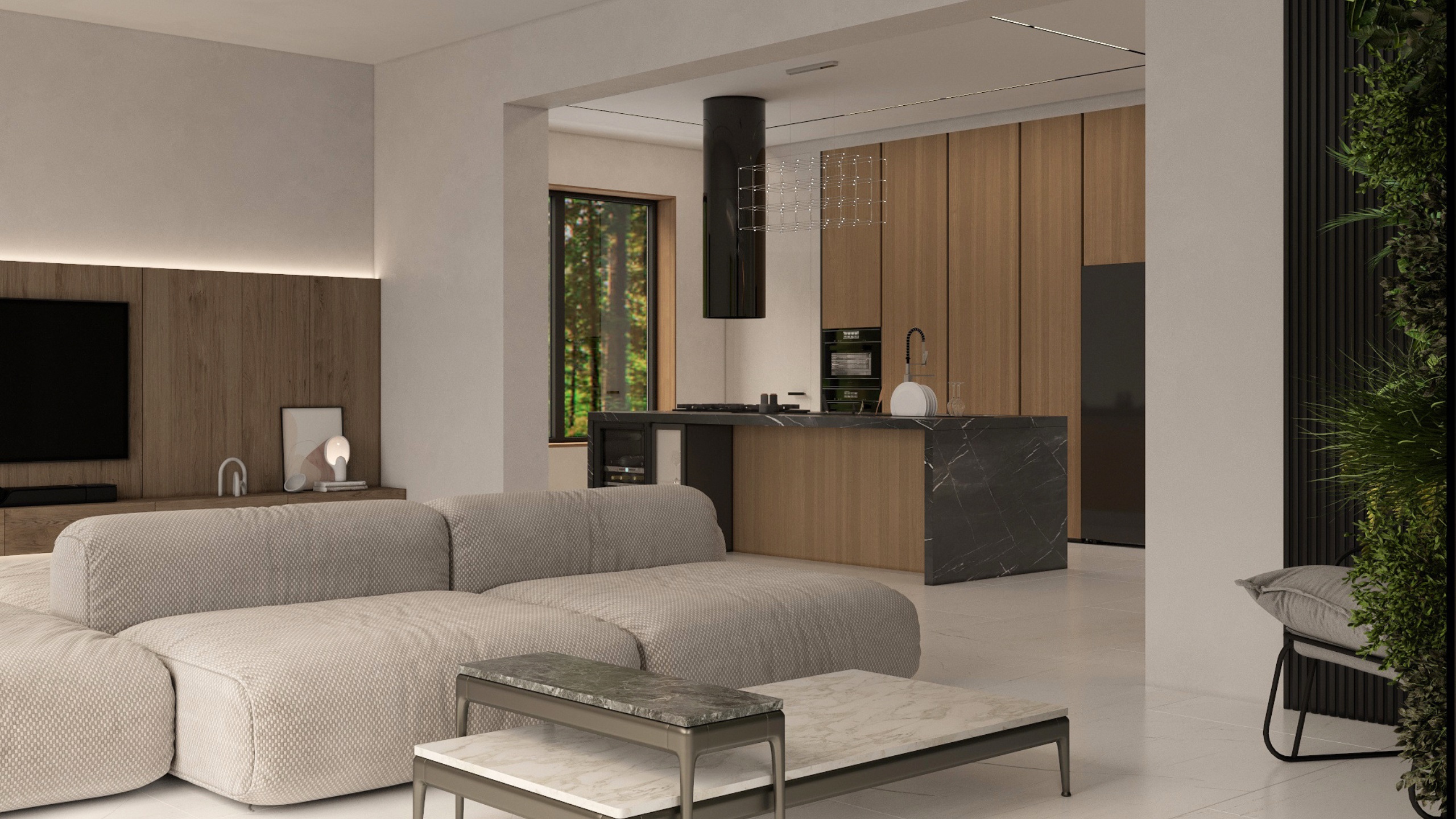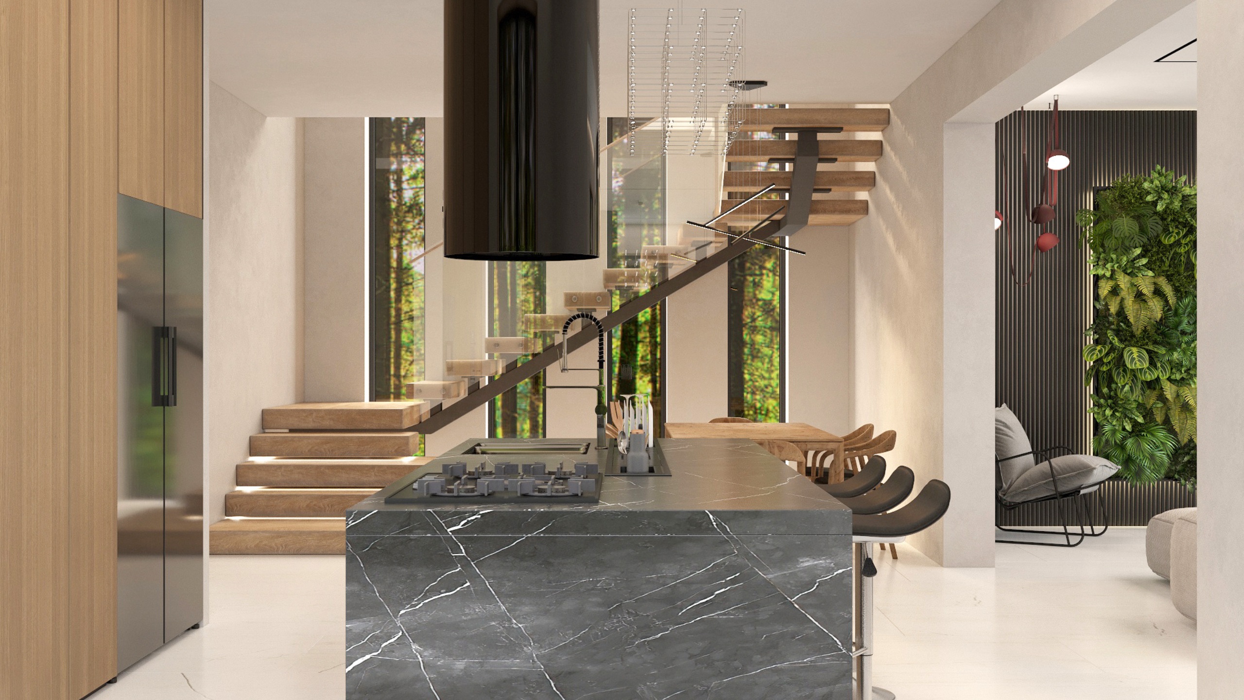 Заказчик при постройке дома хотел сохранить деревья, ландшафт и природную атмосферу. Поэтому было проведено панорамное остекление со стороны лесного массива, позволяющее максимально наполнить жилую зону светом и воздухом. Для оформления использовался керамогранит ESTIMA коллекции Vision — это позволило заметно облегчить интерьер.