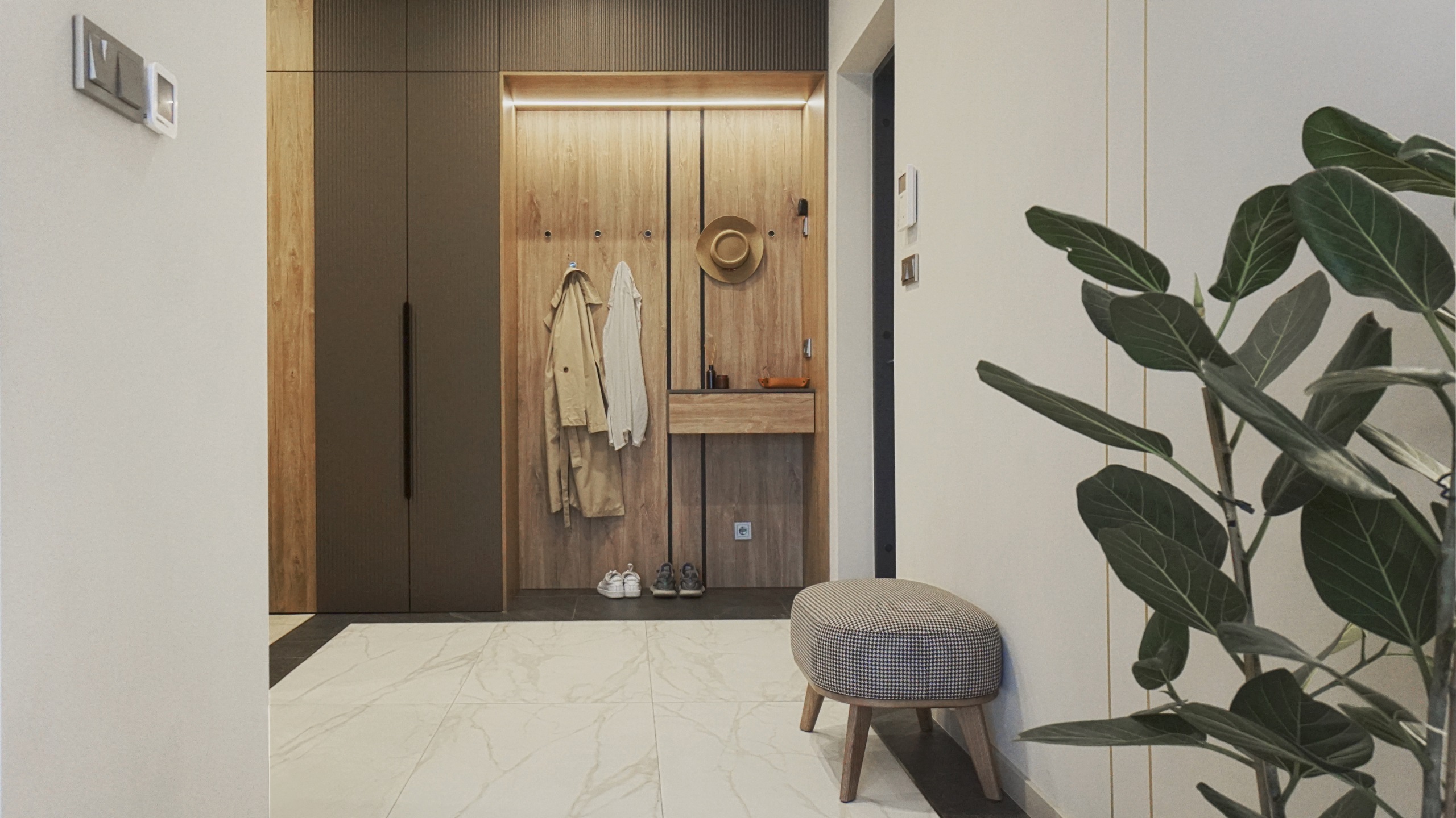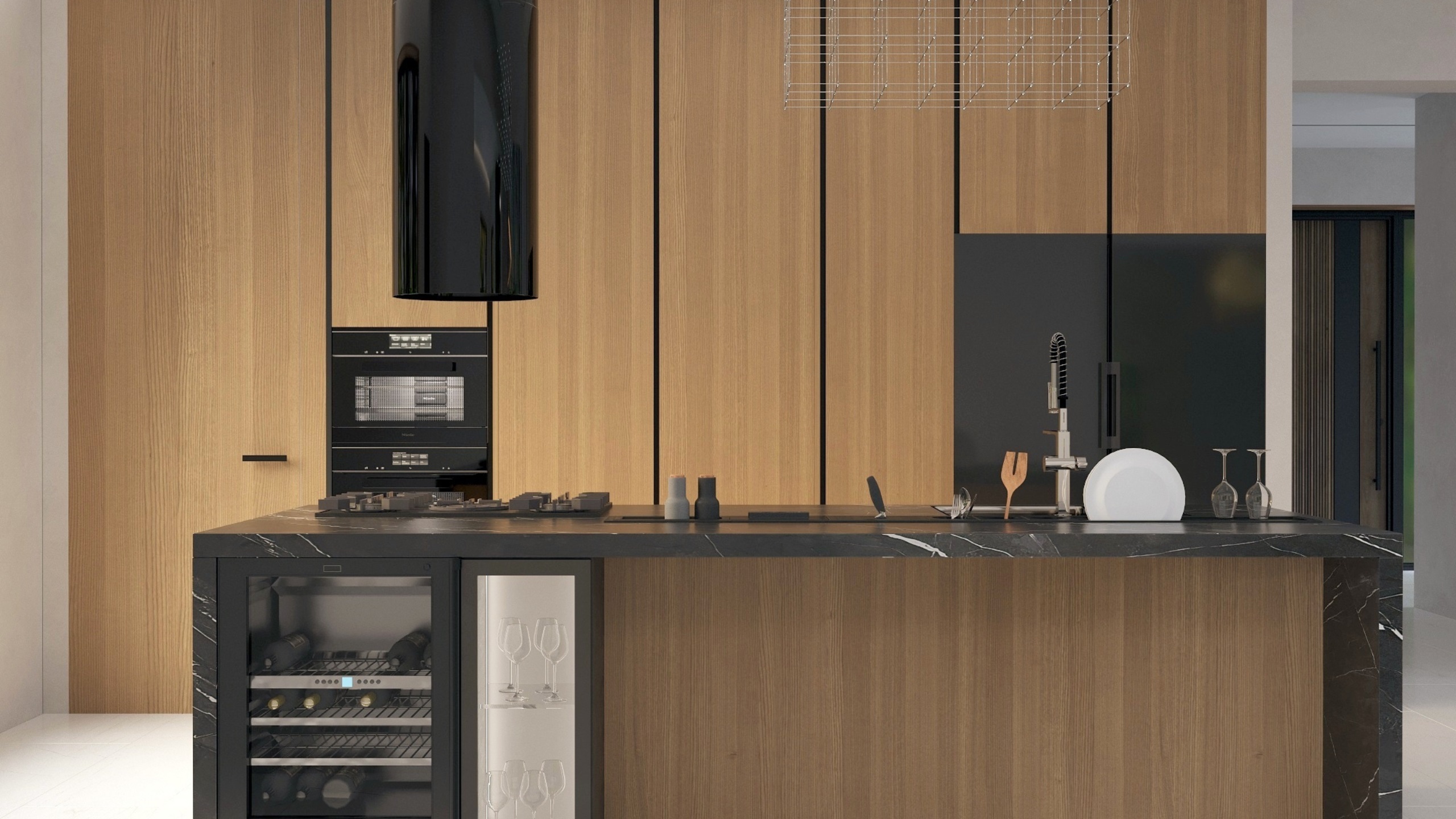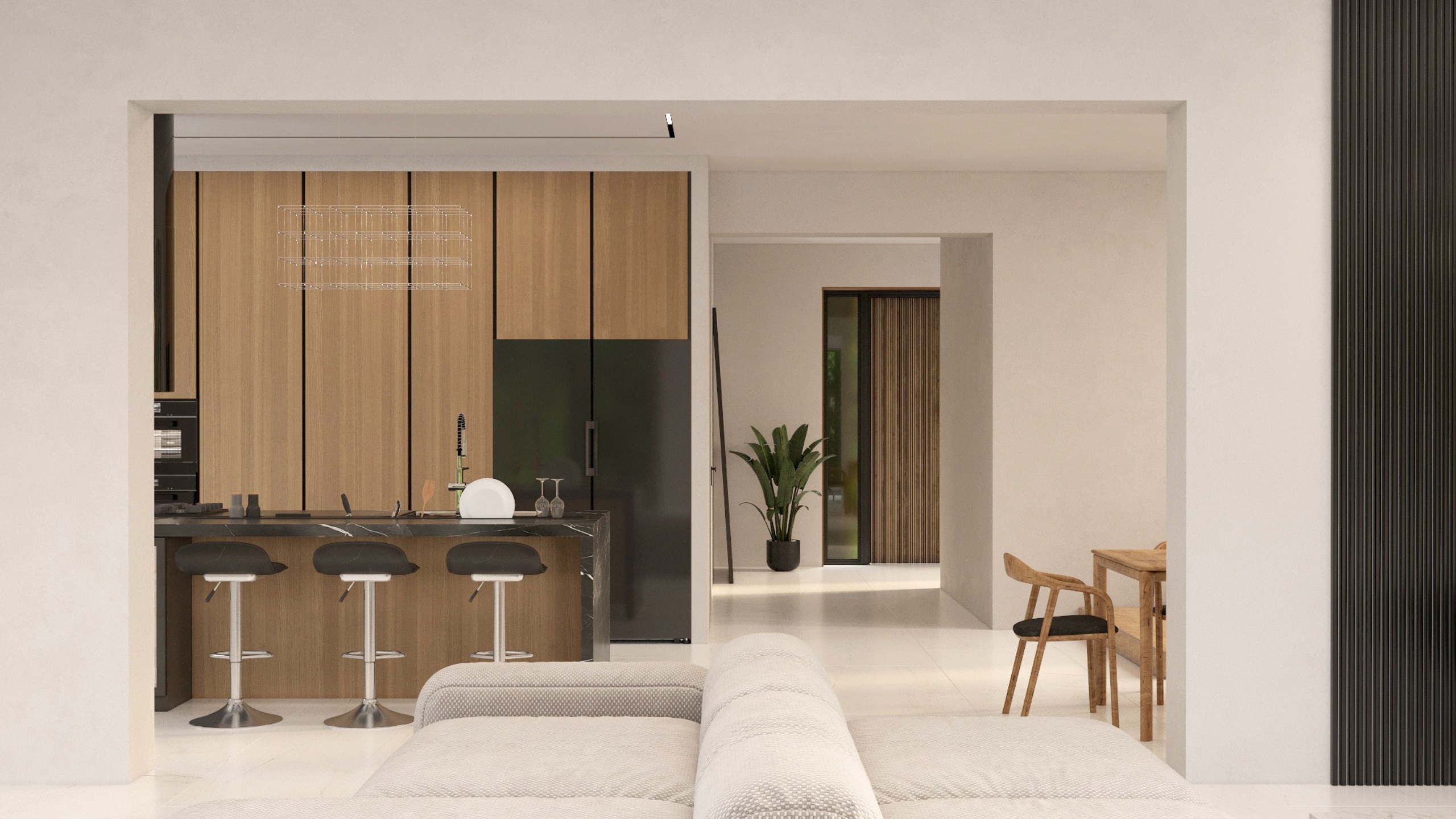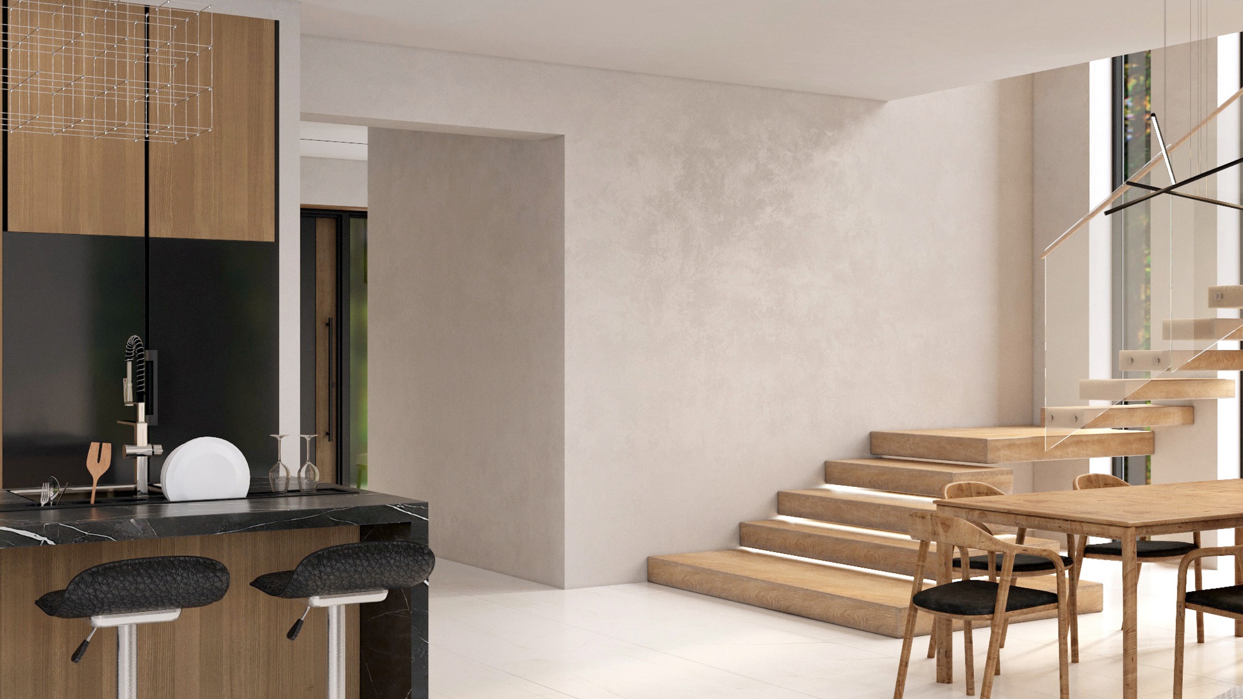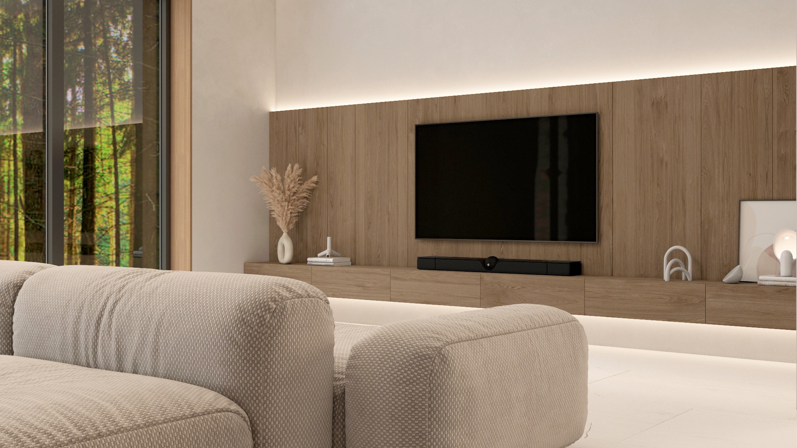 Заказчик при постройке дома хотел сохранить деревья, ландшафт и природную атмосферу. Поэтому было проведено панорамное остекление со стороны лесного массива, позволяющее максимально наполнить жилую зону светом и воздухом. Для оформления использовался керамогранит ESTIMA коллекции Vision — это позволило заметно облегчить интерьер.