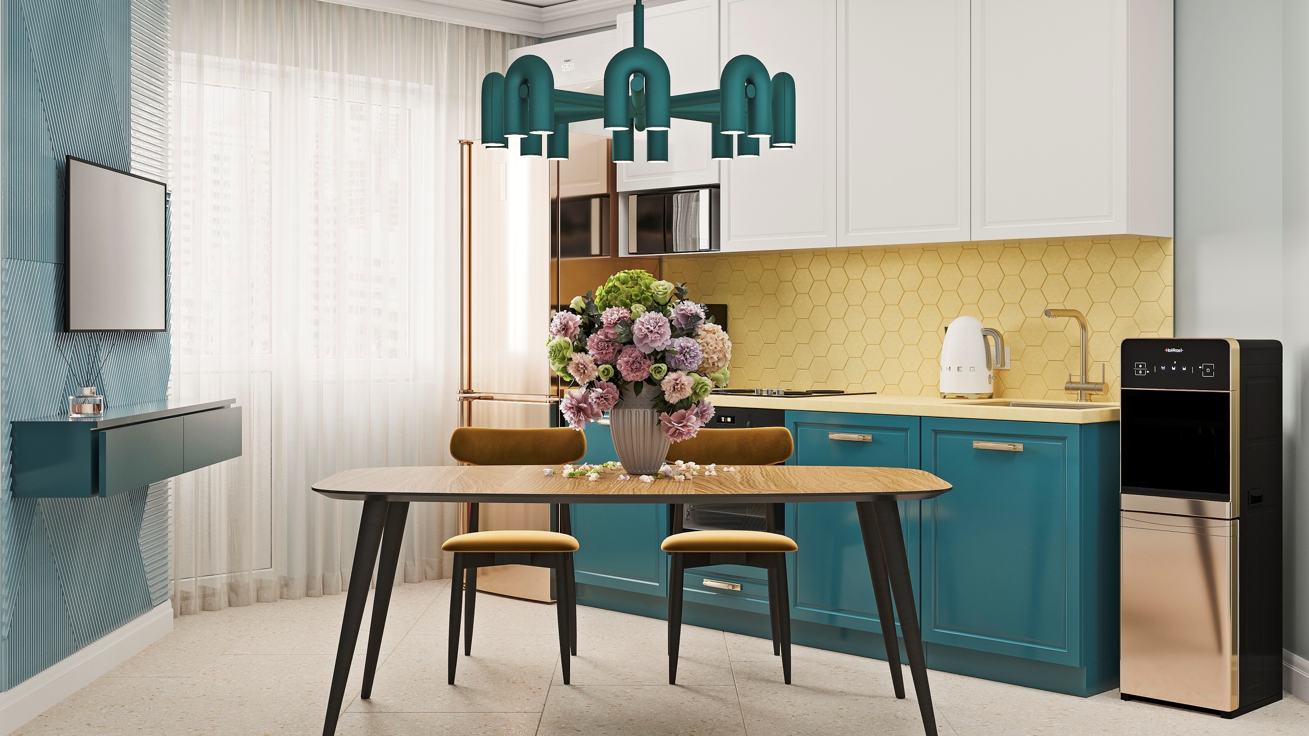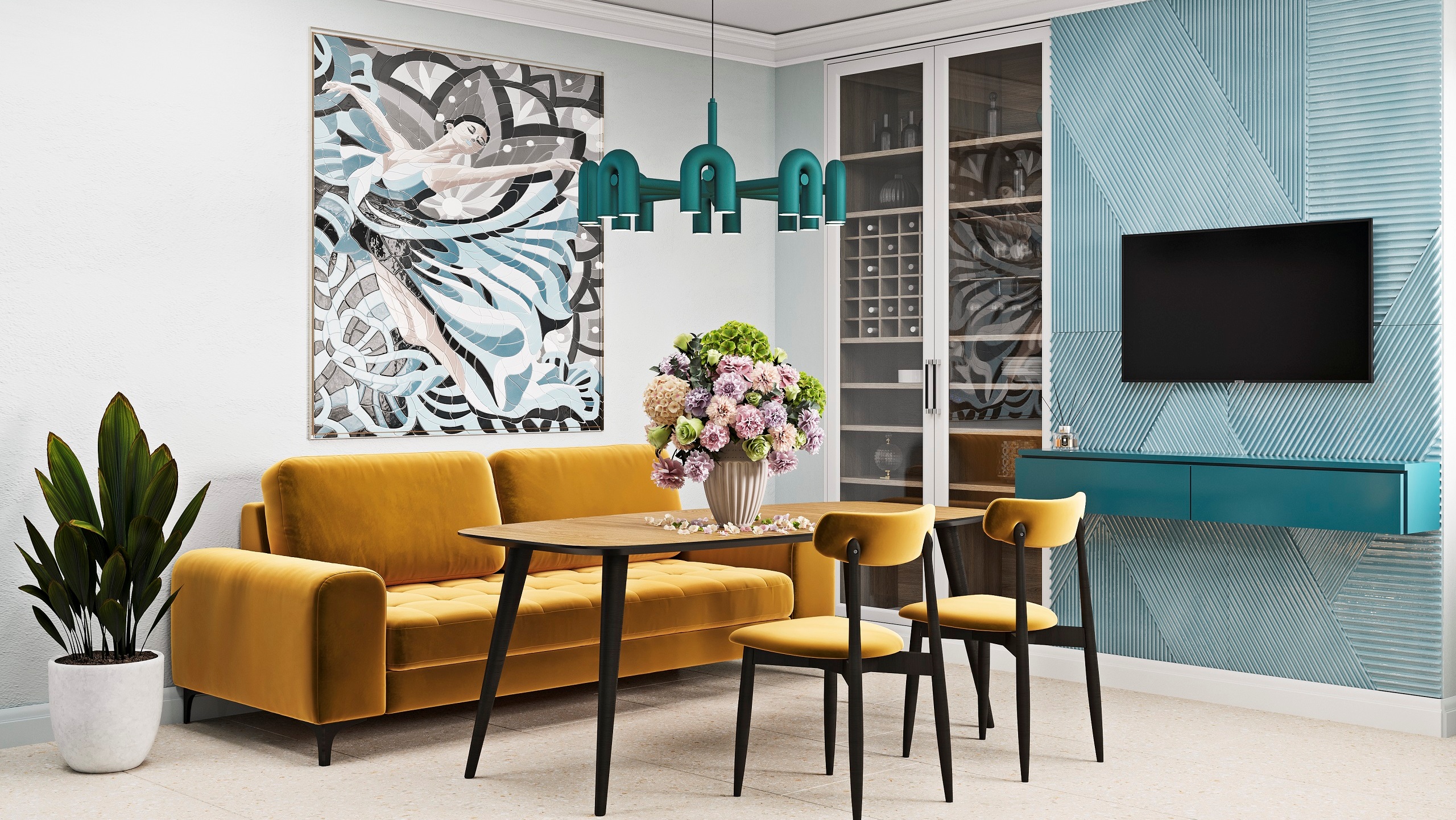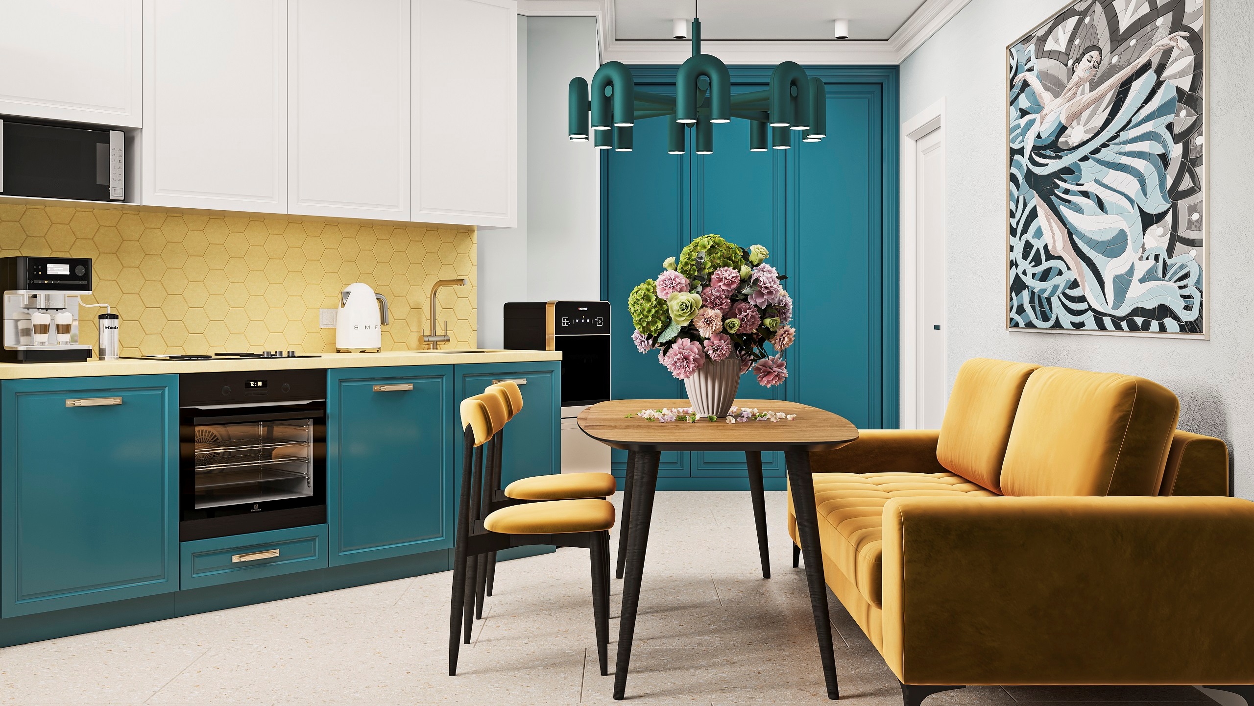 Замысел удалось реализовать в полной мере. Дизайнер Елена Селиванова приняла решение смешать в интерьере не только разные цвета, но и разные фактуры. Все они объединены двумя оттенками: желтым и бирюзовым. Пол украсил керамогранит из коллекции Aglomerat, а фартук — классическая мозаика Spectrum.